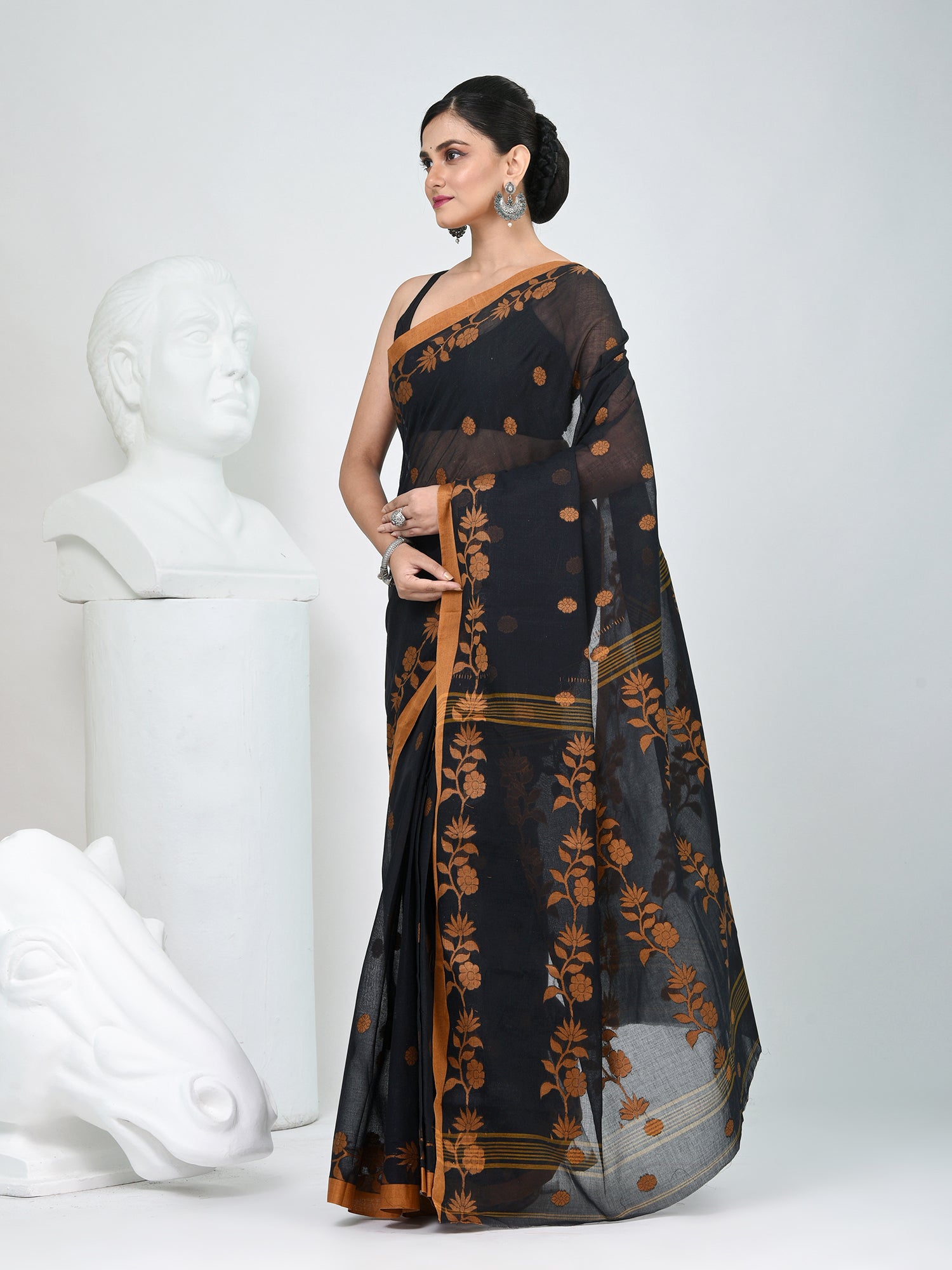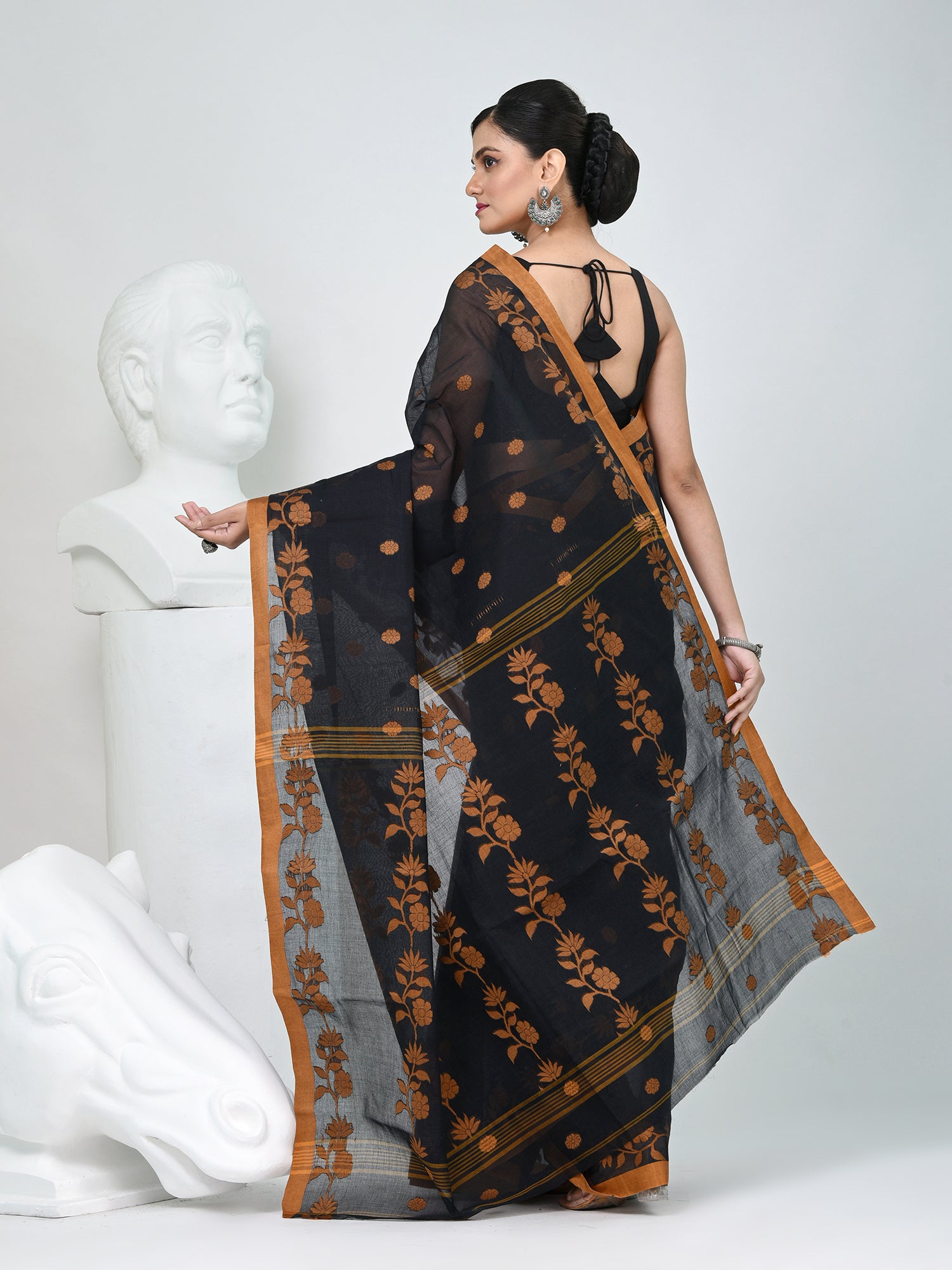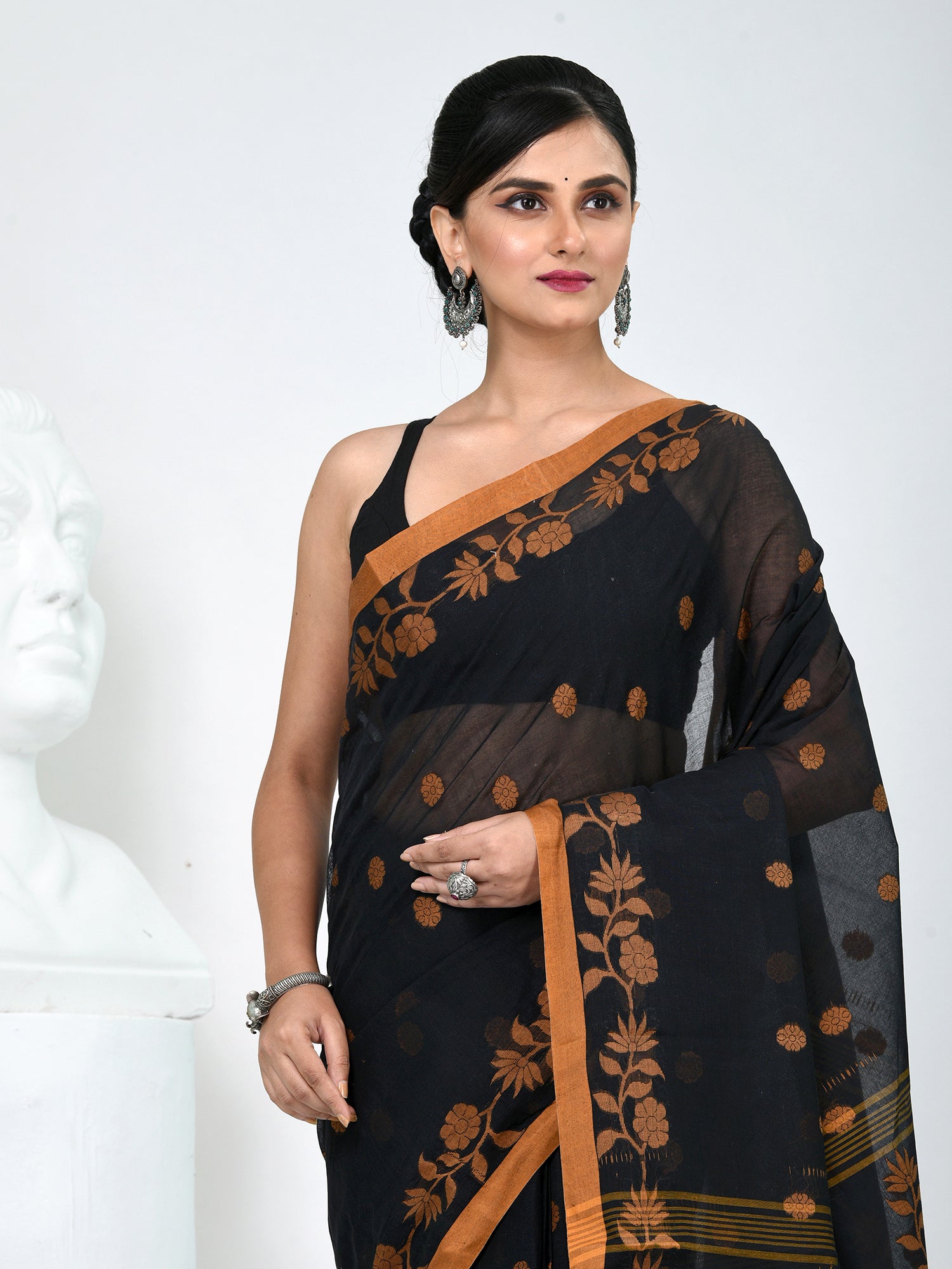 Embrace the timeless charm of Bengal weaving with this elegant Tant cotton saree. Featuring a rich black base adorned with mustard texture motifs and polka dot patterns, this saree exudes sophistication and grace. The mustard border and pallu create a striking contrast, making it an ideal pick for festive occasions, cultural gatherings, or elegant evening wear. Crafted from lightweight and breathable cotton, it ensures all-day comfort without compromising on style. Pair it with statement jewelry to complete your ethnic look.
