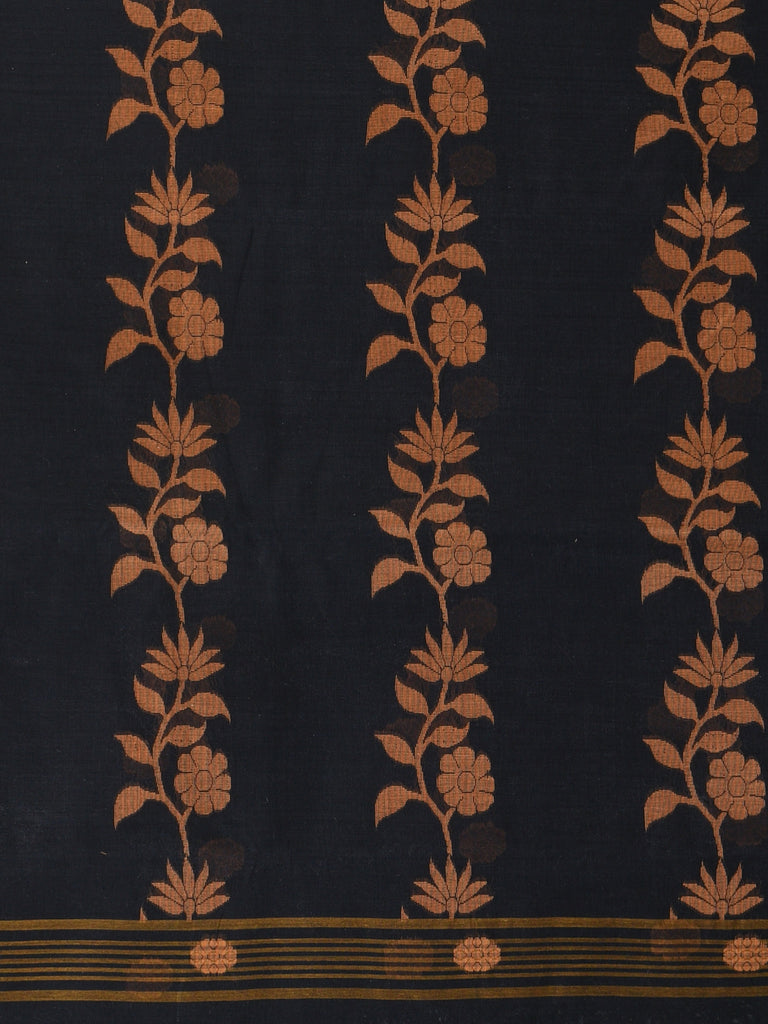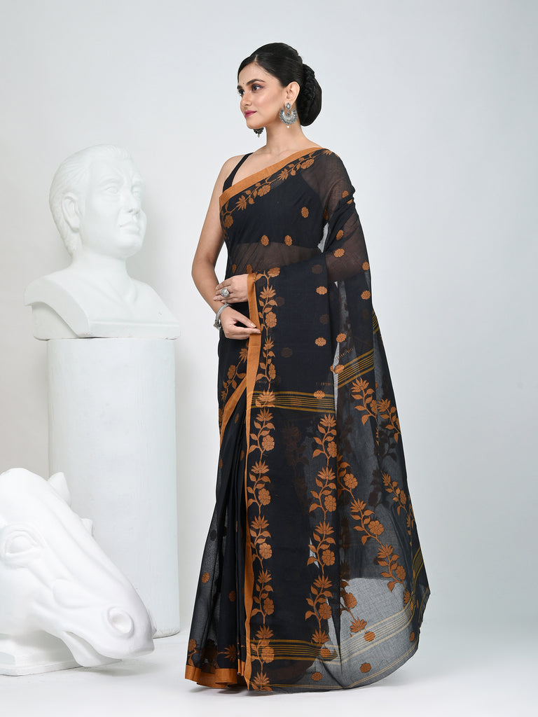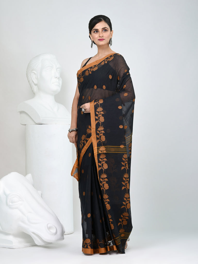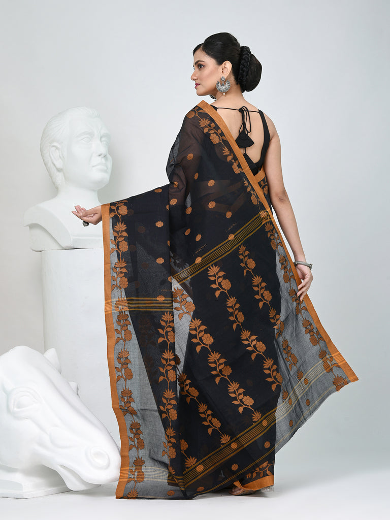 Classic Black & Mustard Handwoven Tant Cotton Saree with Texture Motifs