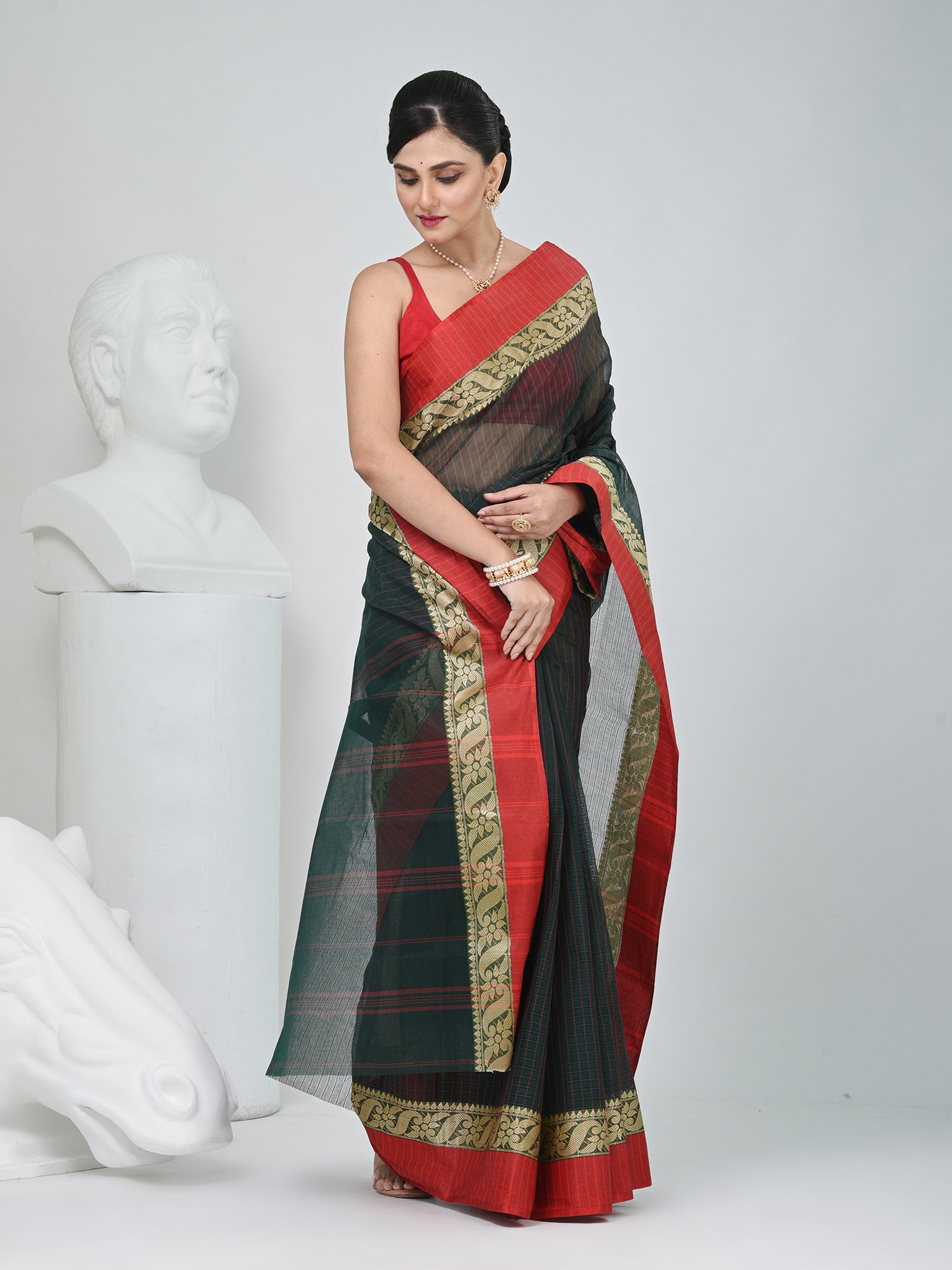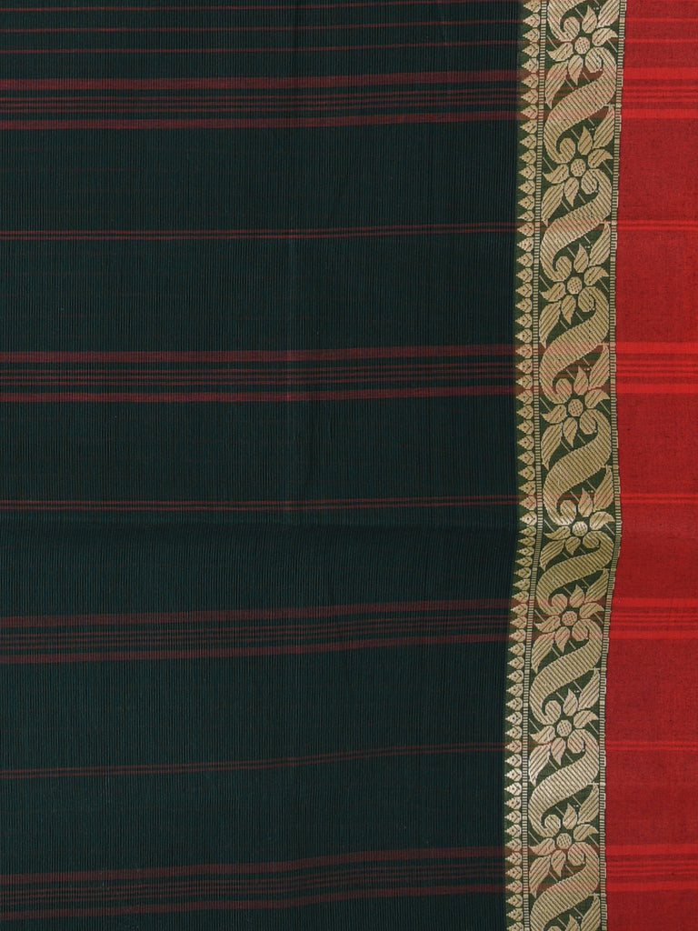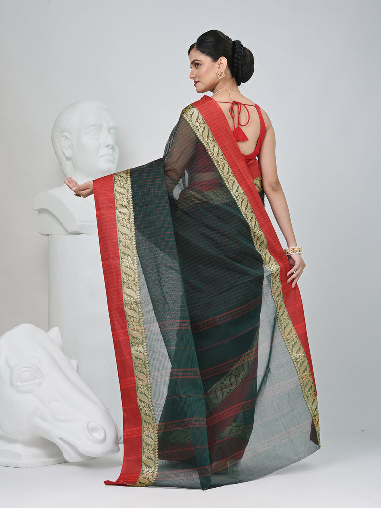 Classic Bottle Green and Red Striped Tant Saree with Intricate Borders