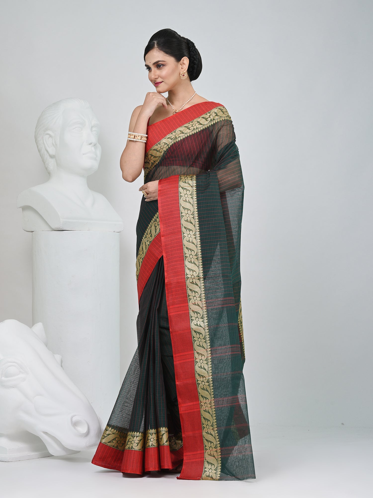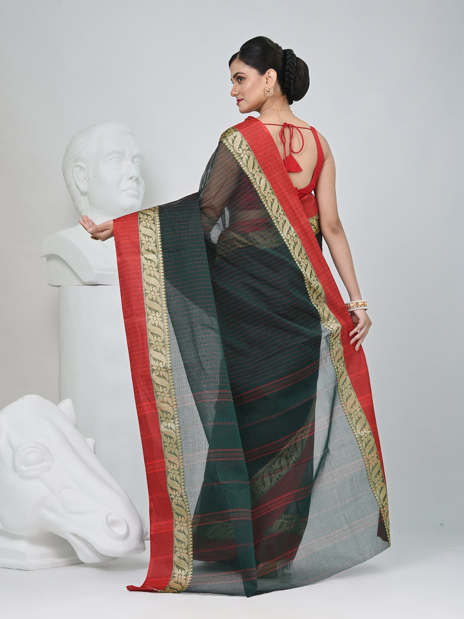 This stunning Tant saree combines timeless elegance with bold contrasts. The bottle green base of the saree is beautifully complemented by red-colored borders, which are adorned with delicate floral lace detailing. The striped design running throughout the body adds a contemporary touch, creating a perfect balance between tradition and modernity. Crafted from high-quality cotton, this saree offers both comfort and style, making it ideal for various occasions, from festive events to casual outings. The fine detailing and elegant drape ensure that you make a statement wherever you go. Pair it with a black blouse to complete the look.