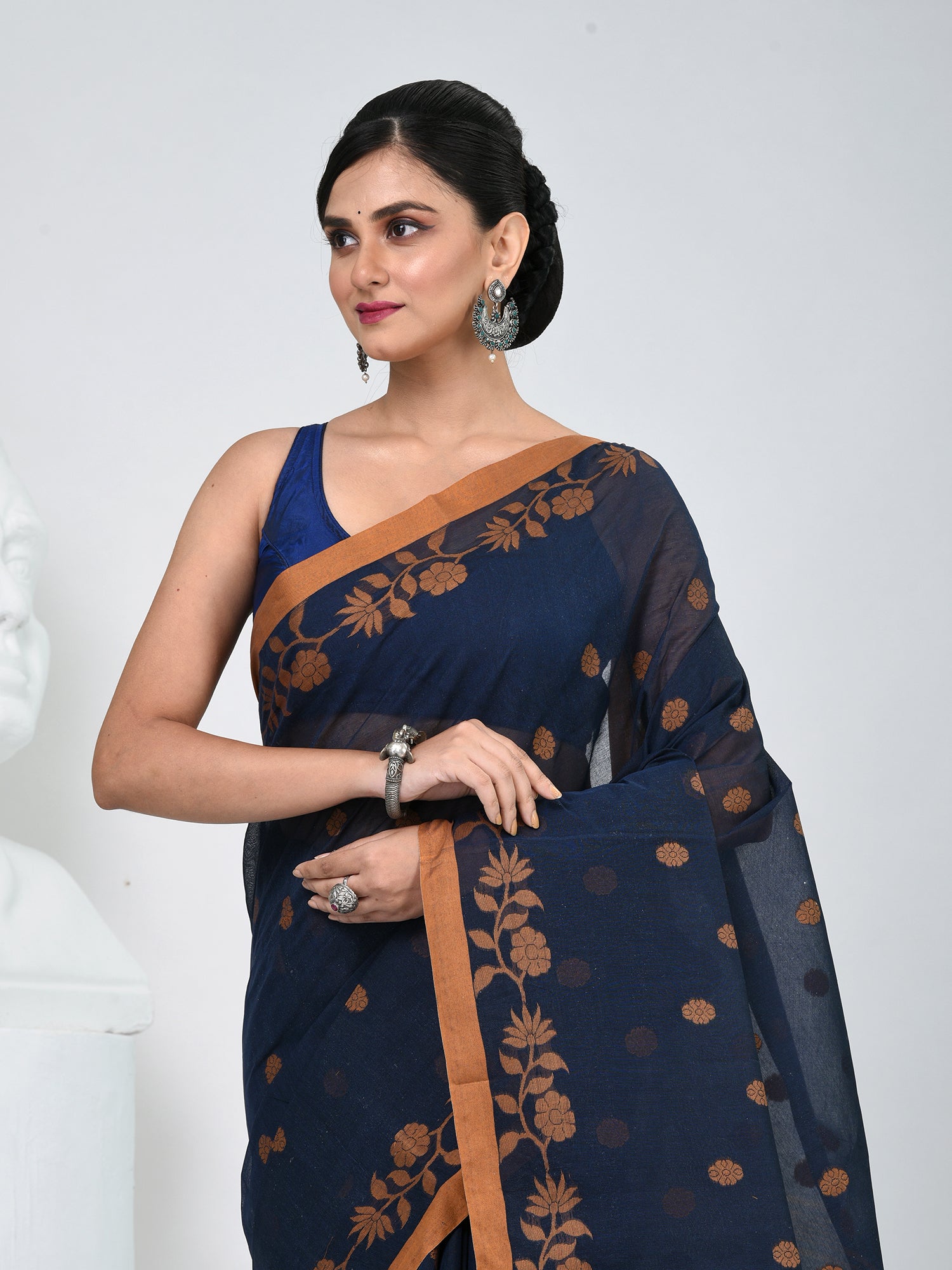 Embrace the timeless charm of Bengal weaving with this elegant Tant cotton saree. Featuring a rich navy blue base adorned with mustard texture motifs and polka dot patterns, this saree exudes sophistication and grace. The mustard border and pallu create a striking contrast, making it an ideal pick for festive occasions, cultural gatherings, or elegant evening wear. Crafted from lightweight and breathable cotton, it ensures all-day comfort without compromising on style. Pair it with statement jewelry to complete your ethnic look.