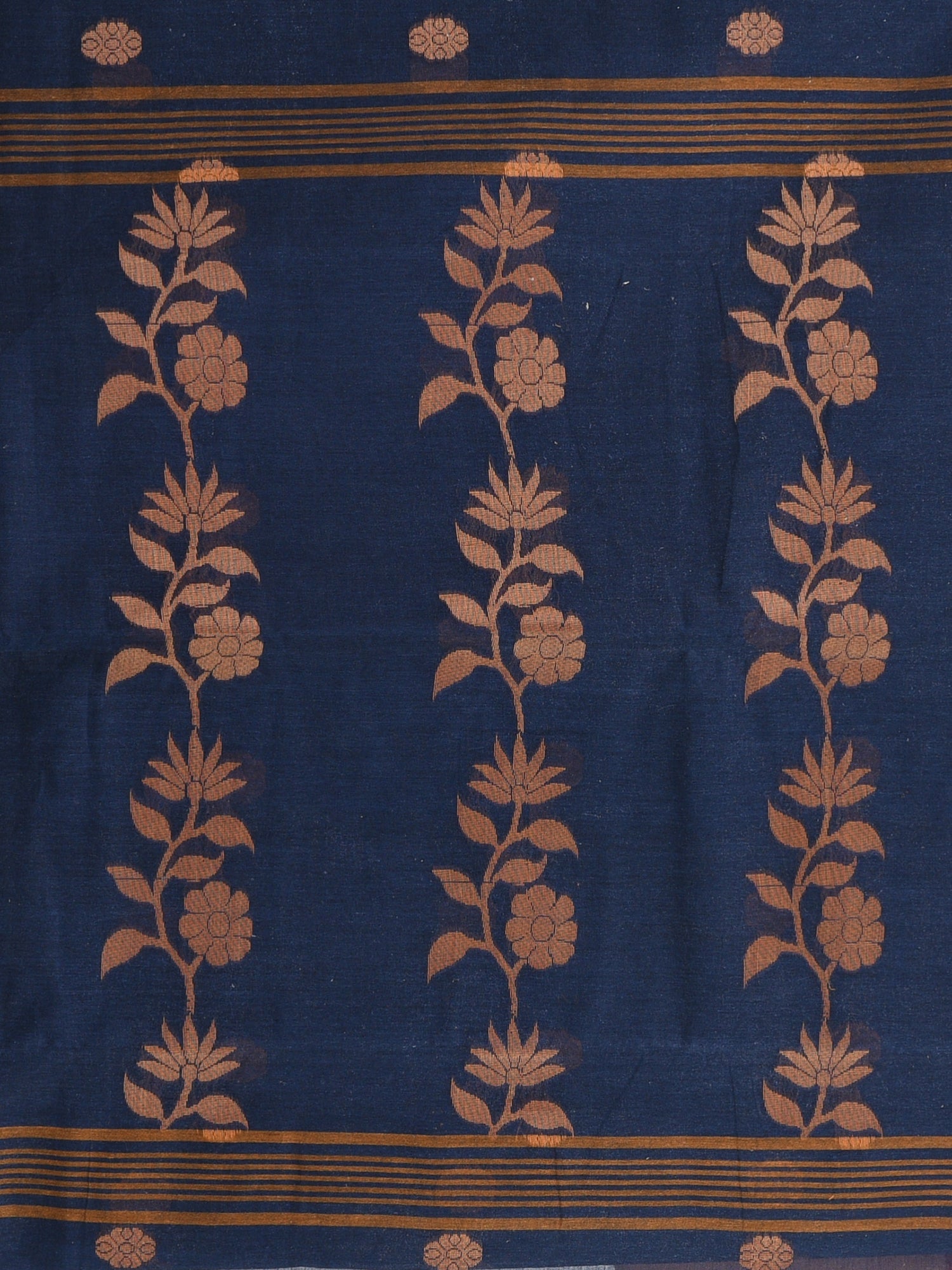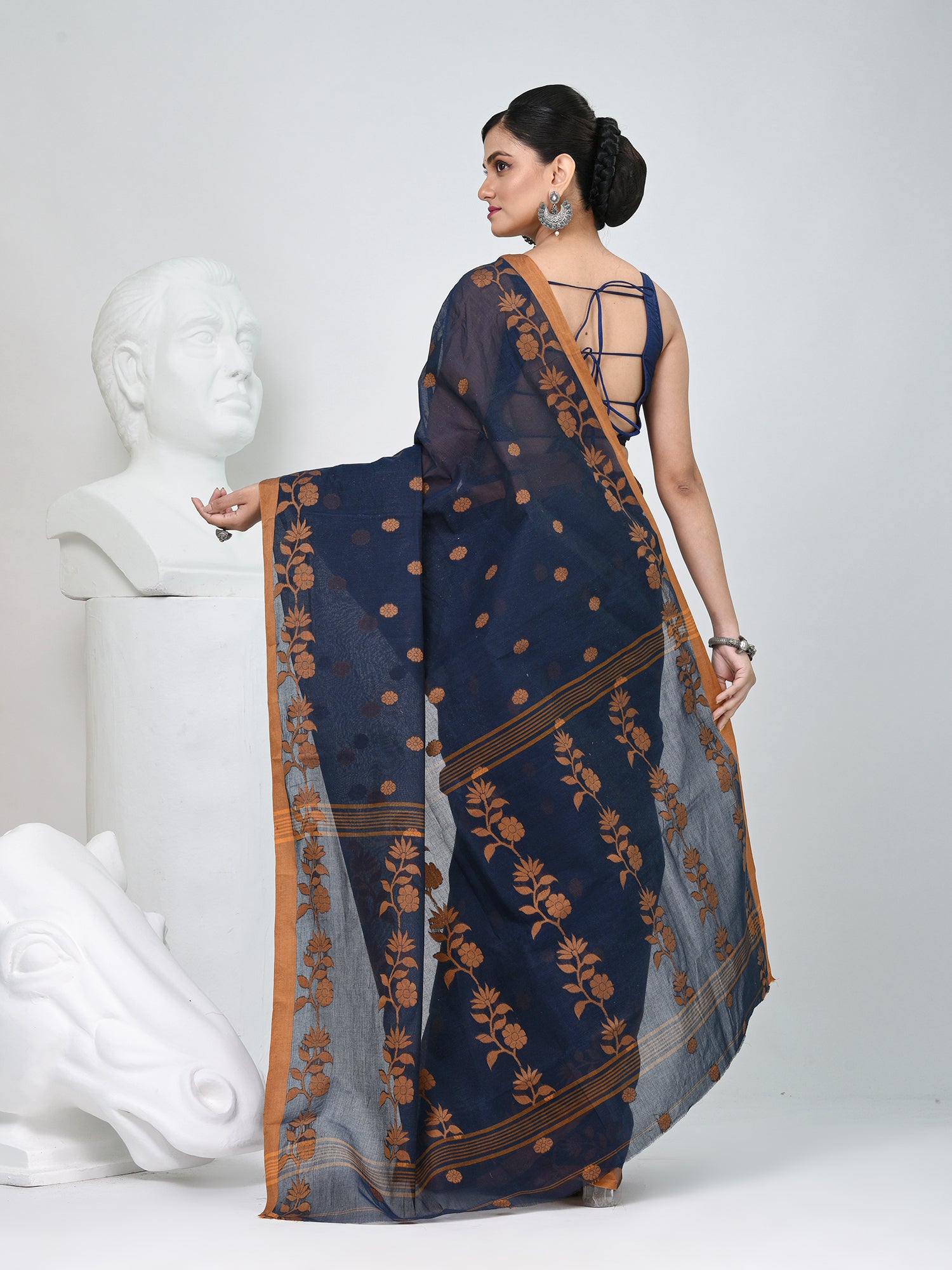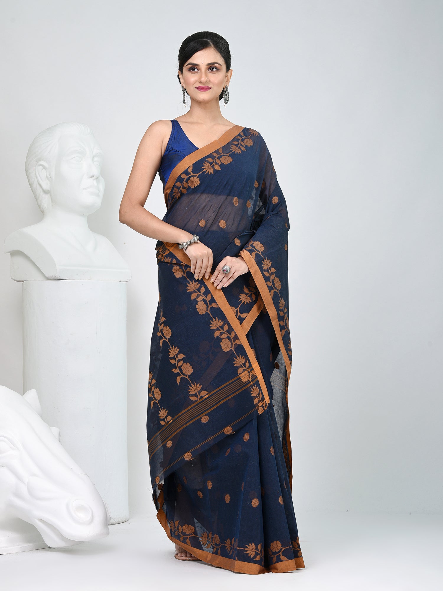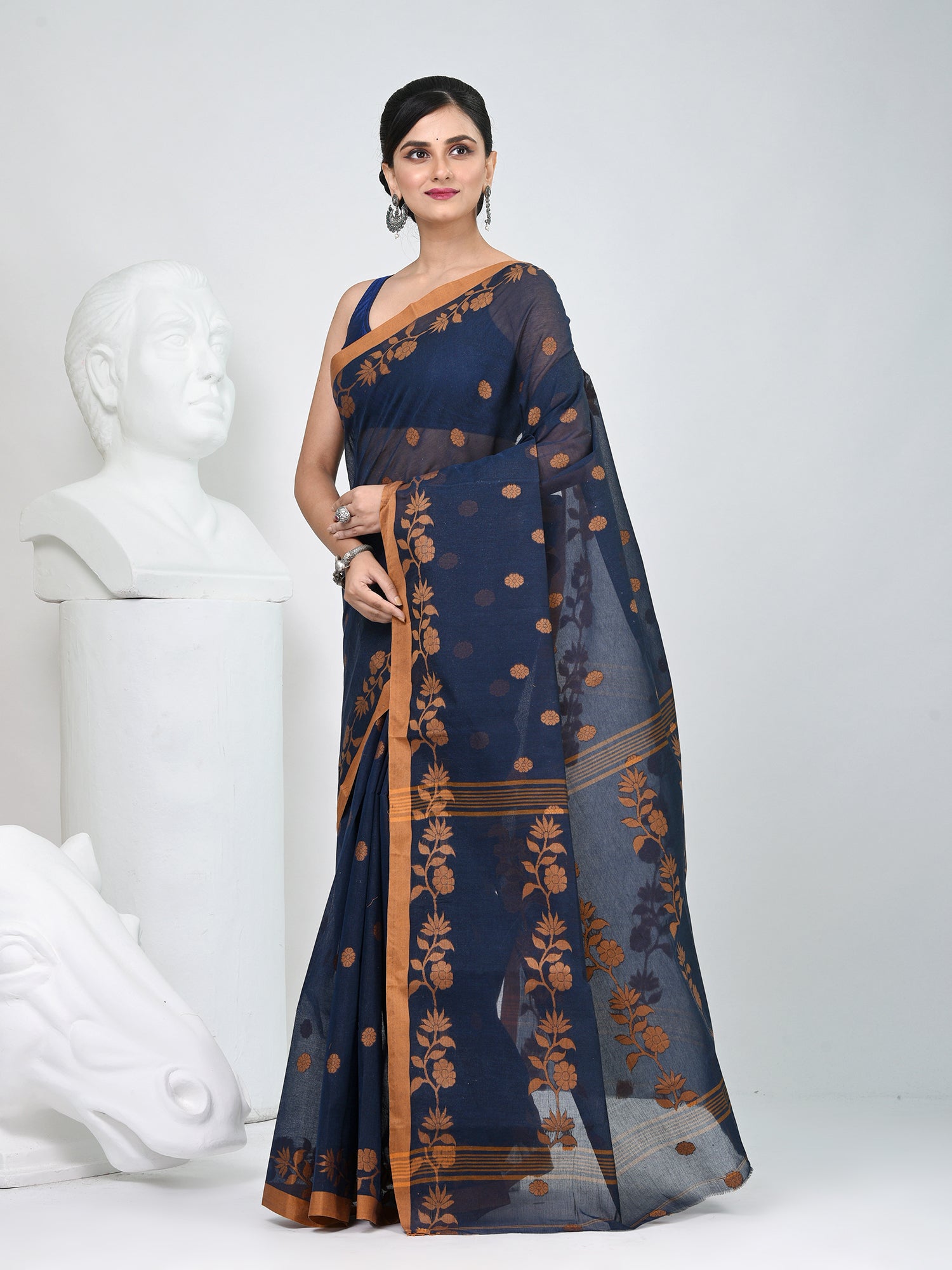 Classic Navy Blue & Mustard Handwoven Tant Cotton Saree with Texture Motifs