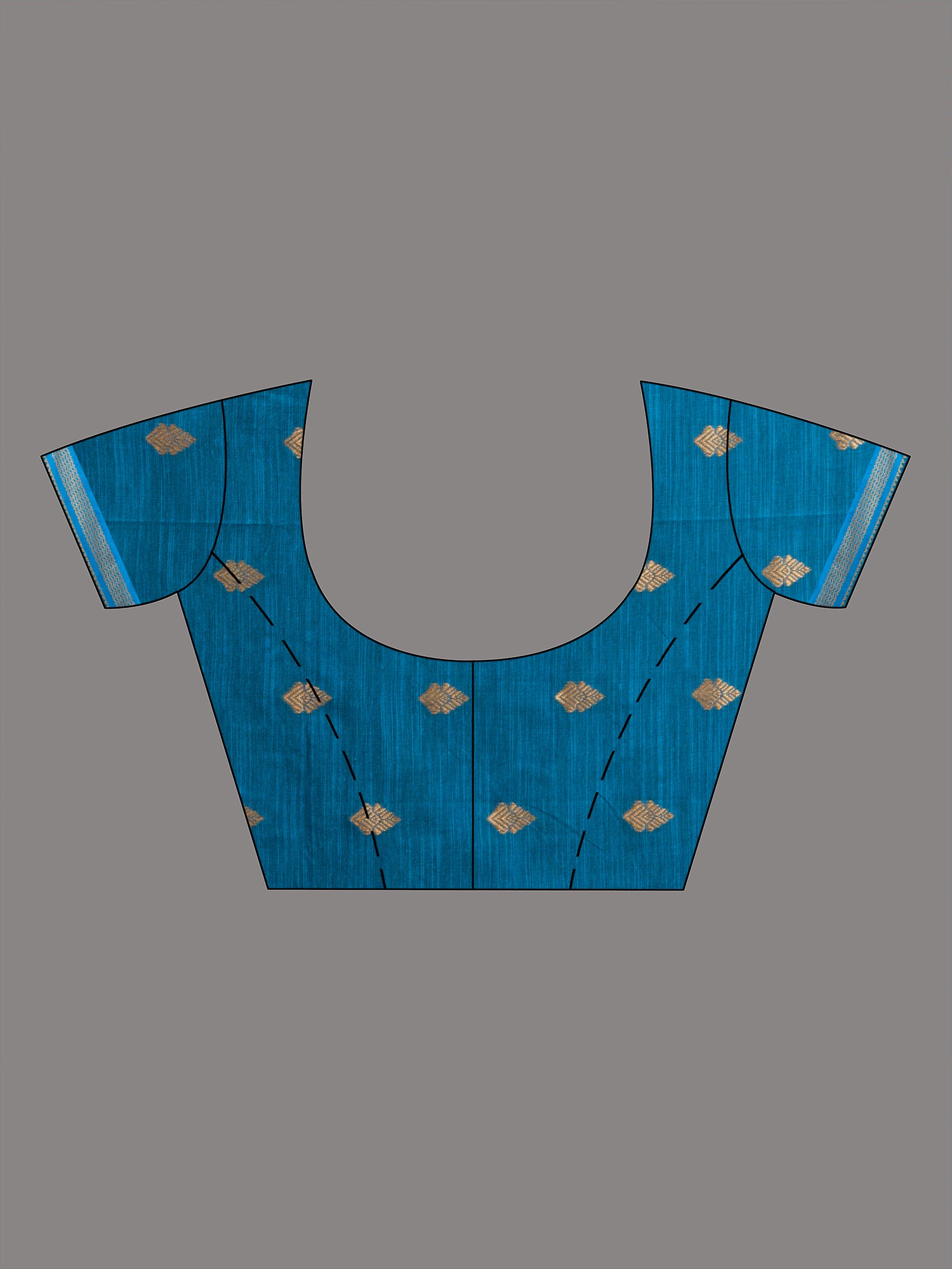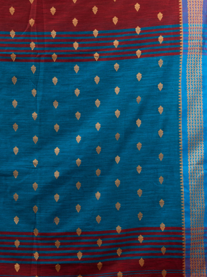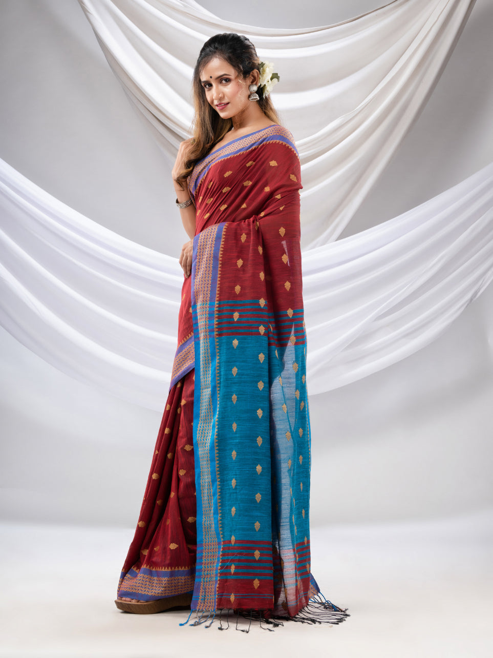 Feel comfortable and stylish in this dark red cotton handwoven saree. It has texture motifs all over the saree and the borders have texture pattern in blue. It accompanies in sapphire blue pallu to bring the whole look together.