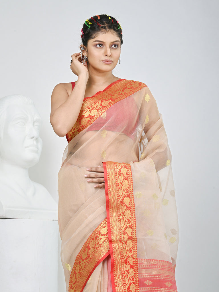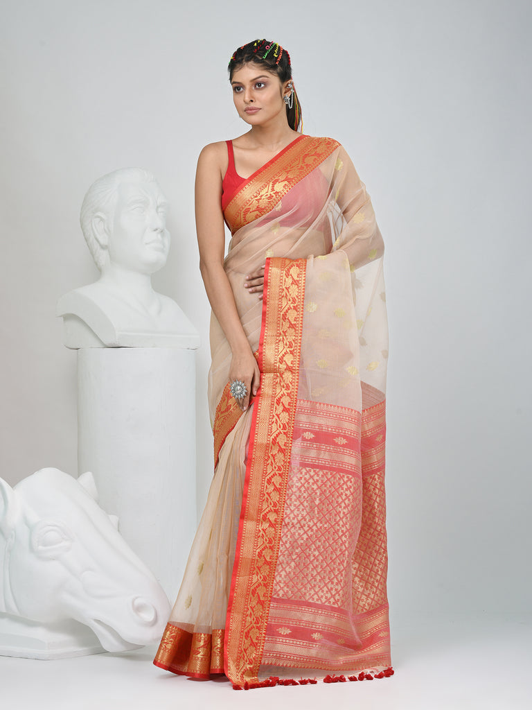 Step into timeless elegance with this exquisite beige resham saree, beautifully complemented by a striking red pallu. The saree features intricate zari weaving along the borders and pallu, adding a rich traditional charm. Crafted from premium resham fabric, it drapes gracefully, making it perfect for festive occasions, weddings, and cultural celebrations. The contrast red blouse piece enhances its vibrant appeal, ensuring you stand out with sophistication and style.