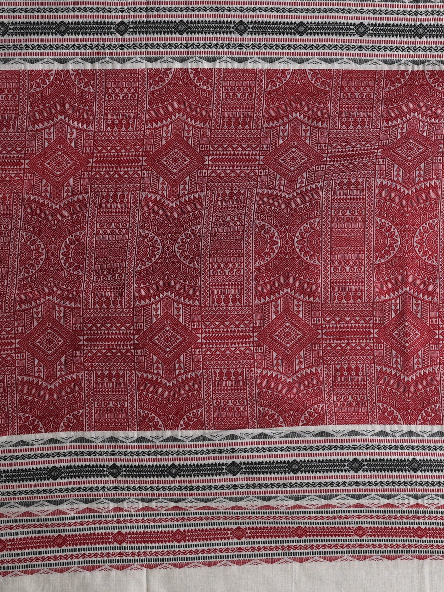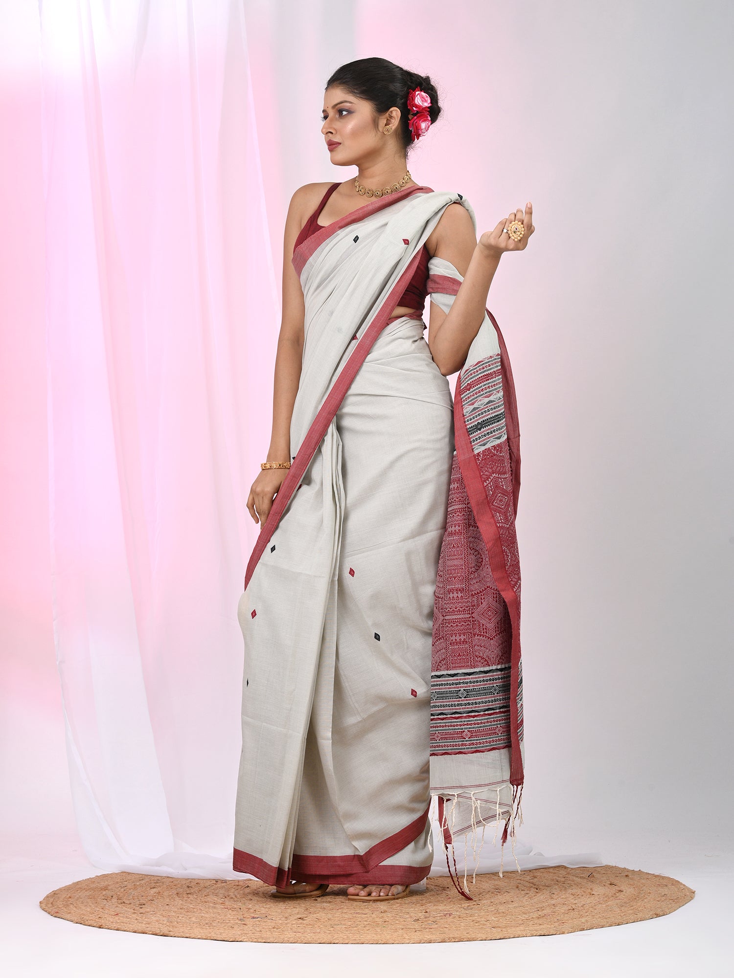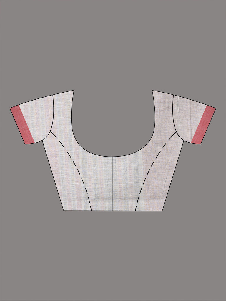This refined ecru cotton saree is a blend of simplicity and elegance, featuring beautifully arranged red and black diamond motifs. The delicate accents add a touch of vibrancy to the soft, breathable fabric, making it perfect for everyday wear or casual gatherings. The saree is finished with a contrasting red border that enhances the overall design, giving it a classic yet contemporary look. Lightweight and comfortable, this saree is ideal for those who seek understated elegance in their wardrobe.