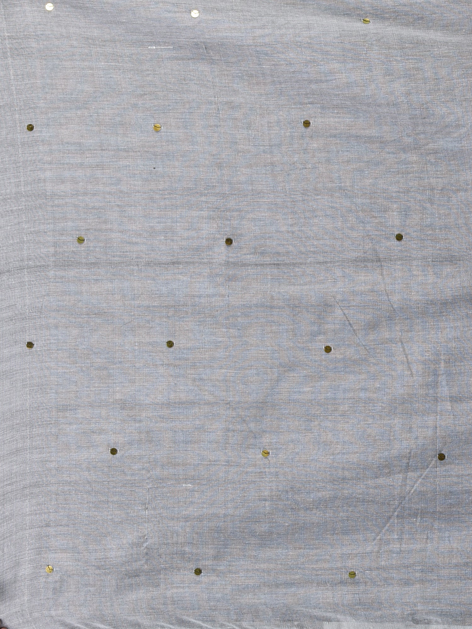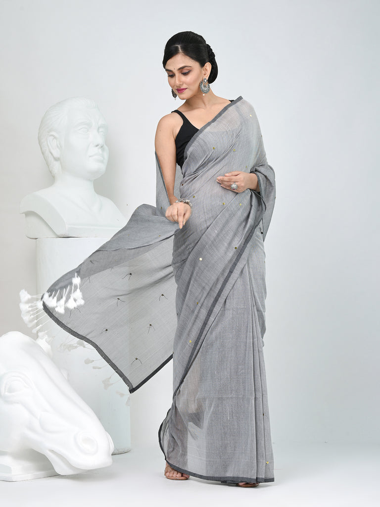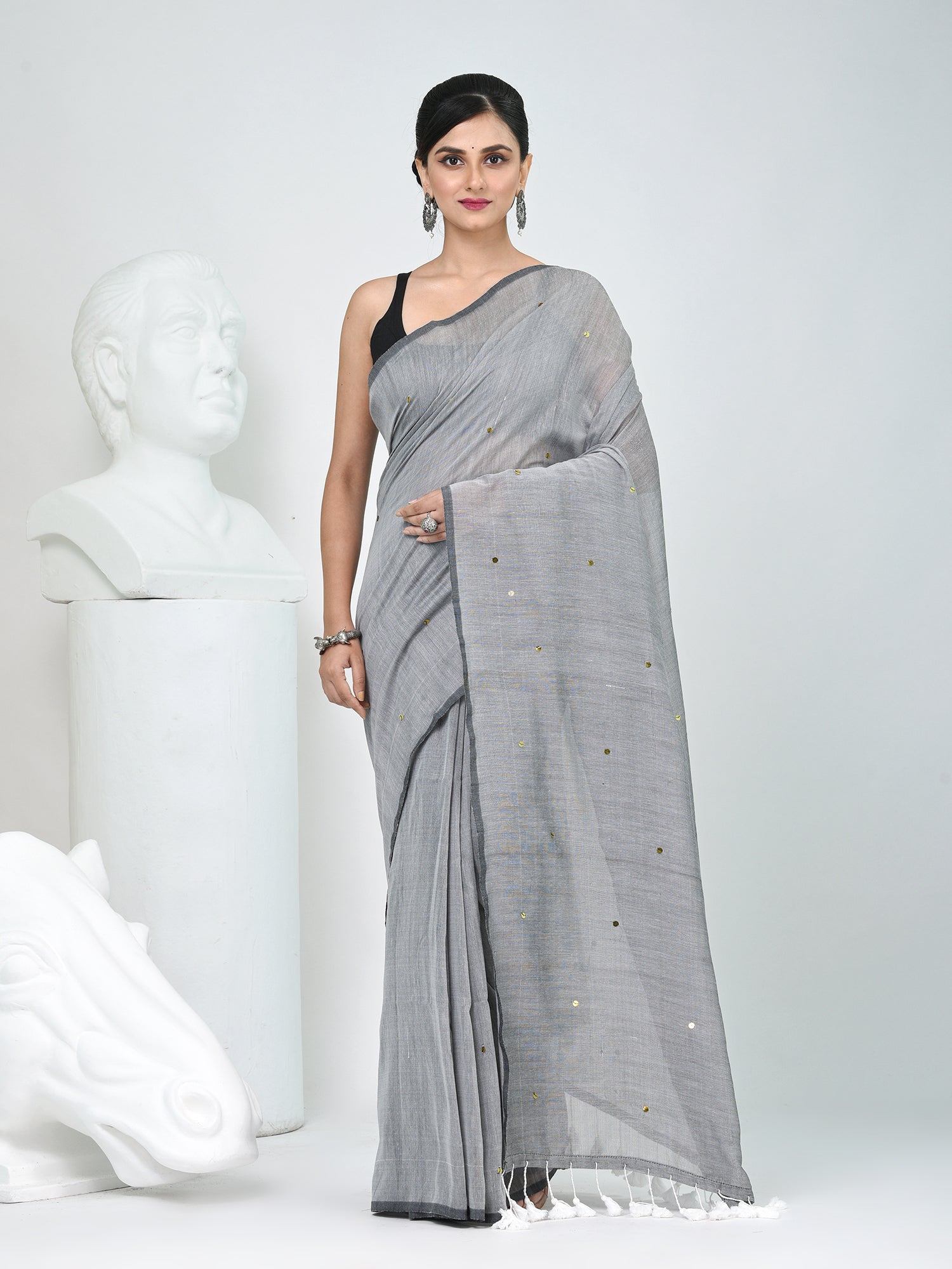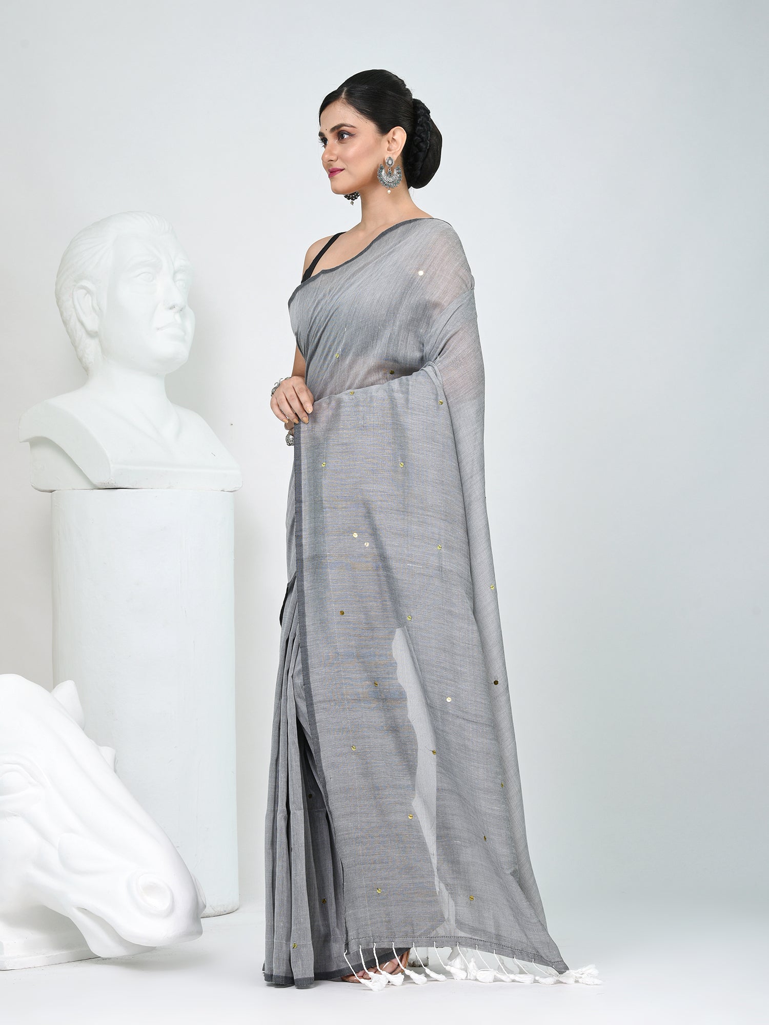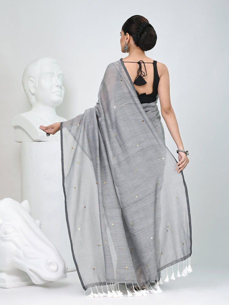Elegant Grey Cotton Saree with Sequin Embellishments and Pom Pom