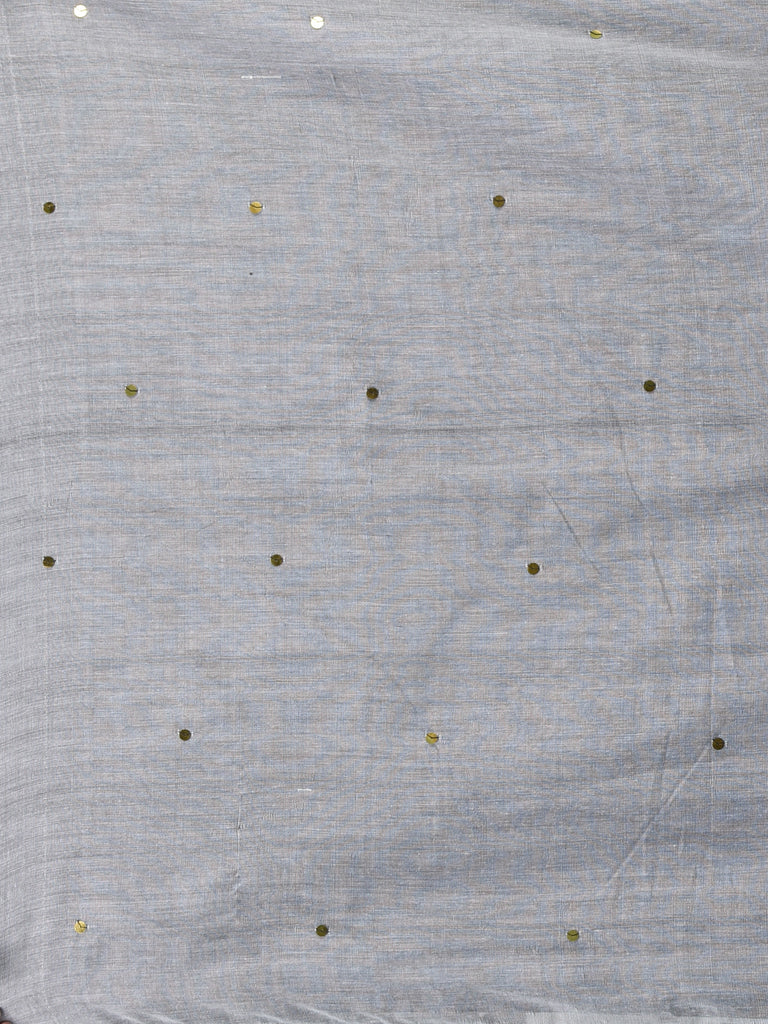 Radiate elegance with the Grey Sequin Cotton Saree, a perfect blend of vibrancy and grace. Made from soft, breathable cotton, this saree features a striking grey hue enhanced with delicate gold sequin accents that catch the light beautifully. The sheer pallu, finished with playful white pom pom, adds fluidity and festive charm to your look. Lightweight and effortlessly stylish, this saree is ideal for festive occasions, day functions, or elegant casual gatherings where you want to keep it simple yet stunning.