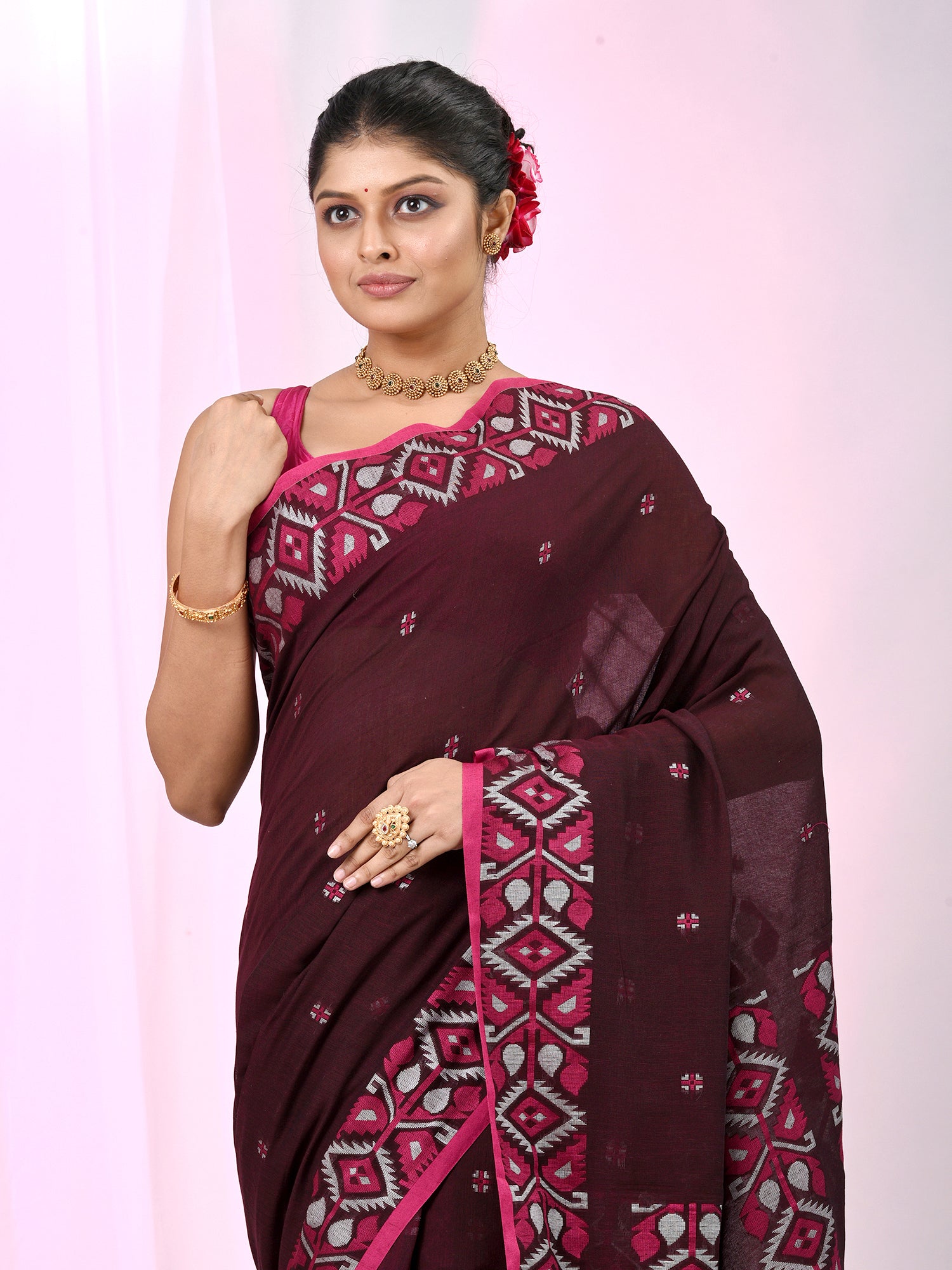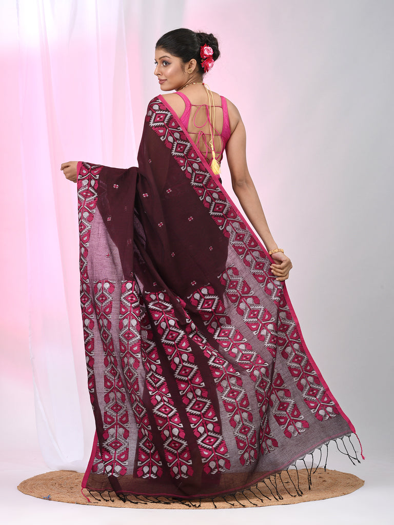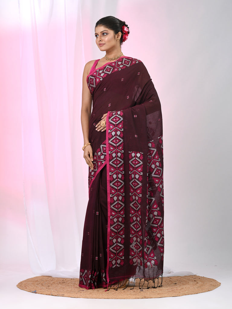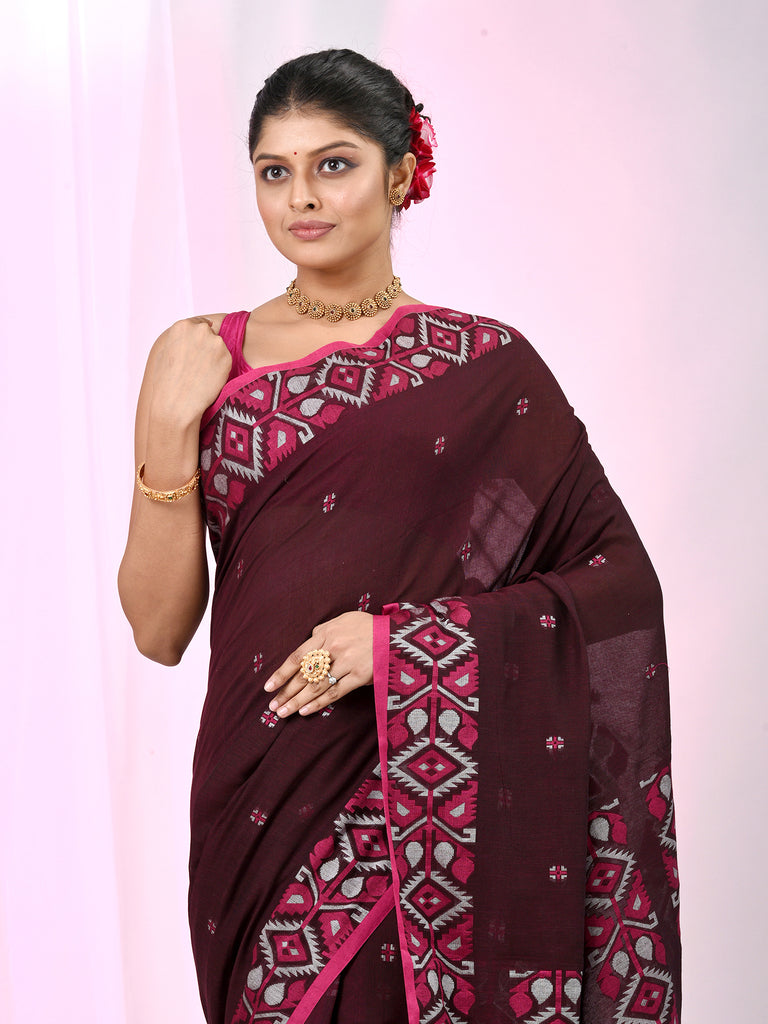 This stunning maroon cotton saree combines grace and modern elegance, featuring bold geometric floral patterns along the border. The rich maroon base is paired with a contrasting pink border that highlights the intricate design, creating a harmonious and vibrant look. The saree’s soft cotton fabric ensures maximum comfort, while the geometric motifs add a contemporary twist to traditional style. Perfect for festive occasions, family gatherings, and cultural celebrations, this saree is a beautiful choice for anyone seeking a sophisticated yet bold look.