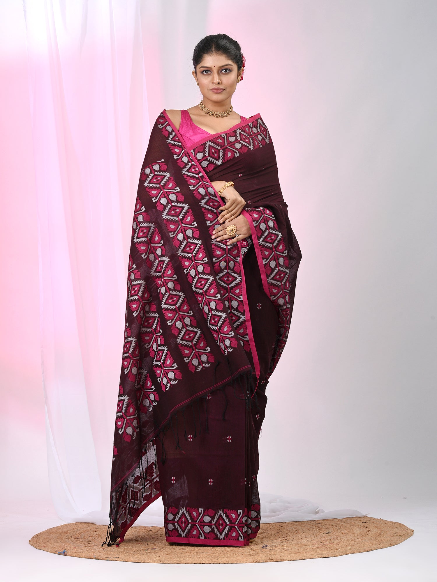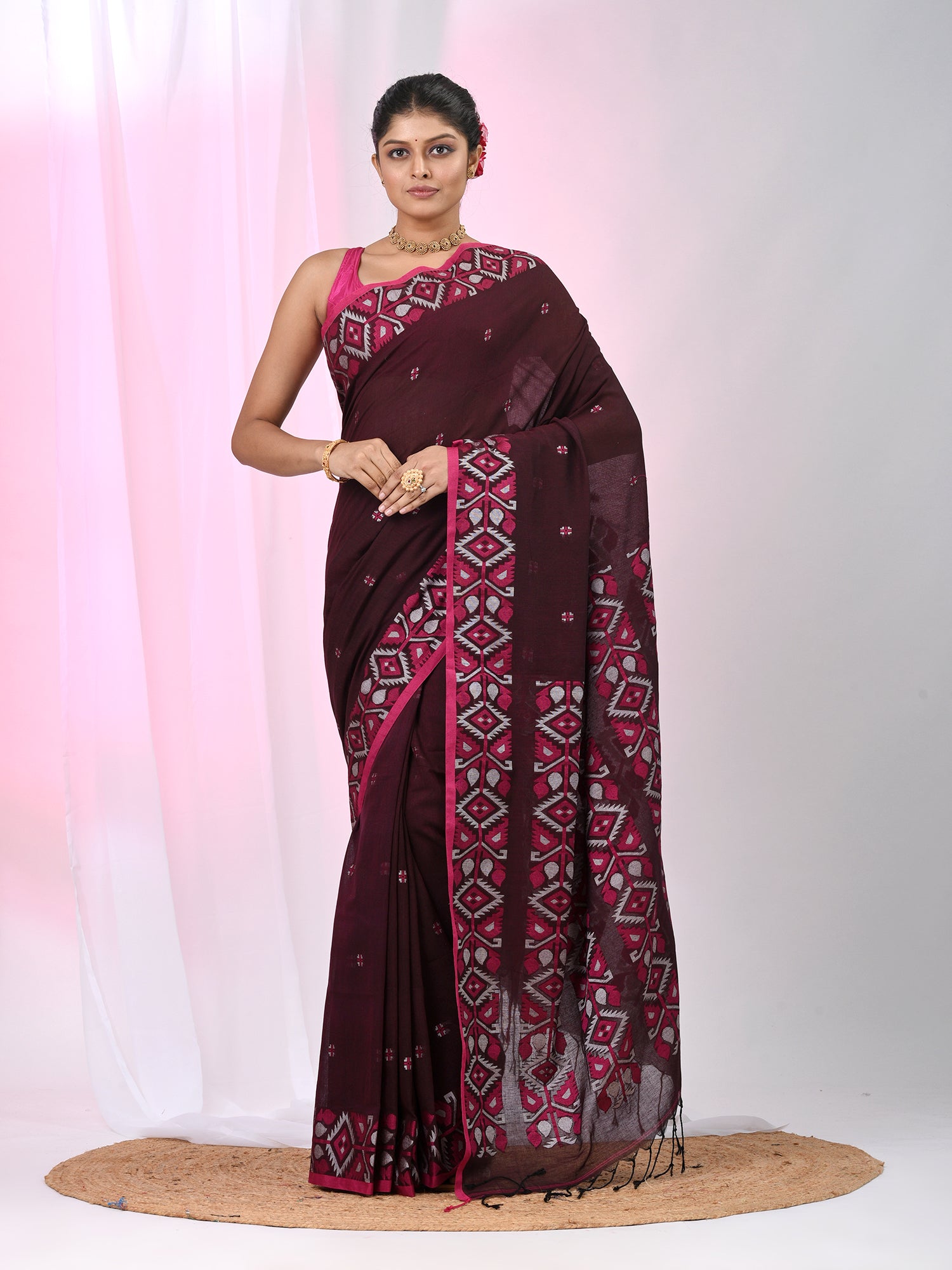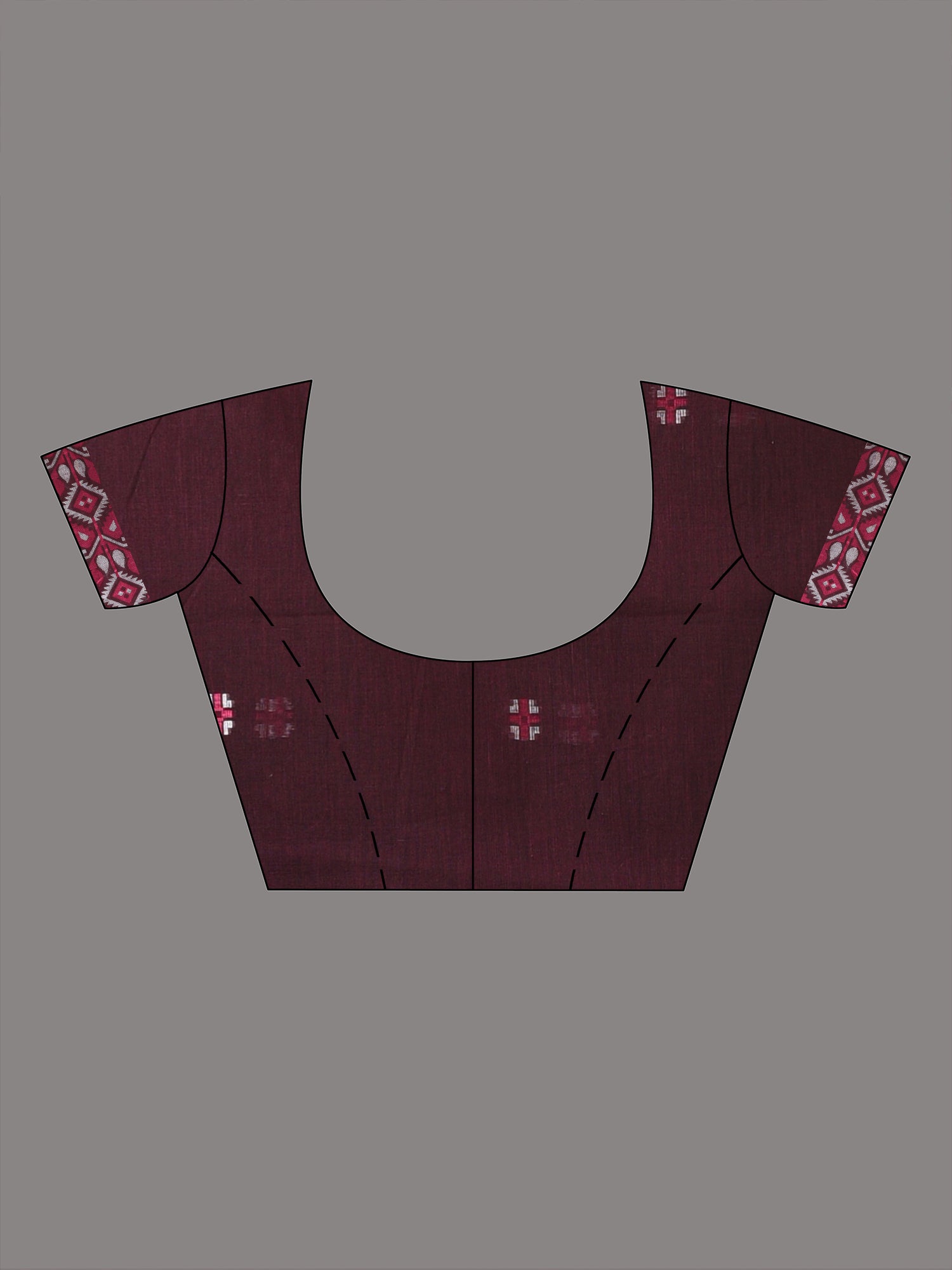This stunning maroon cotton saree combines grace and modern elegance, featuring bold geometric floral patterns along the border. The rich maroon base is paired with a contrasting pink border that highlights the intricate design, creating a harmonious and vibrant look. The saree’s soft cotton fabric ensures maximum comfort, while the geometric motifs add a contemporary twist to traditional style. Perfect for festive occasions, family gatherings, and cultural celebrations, this saree is a beautiful choice for anyone seeking a sophisticated yet bold look.