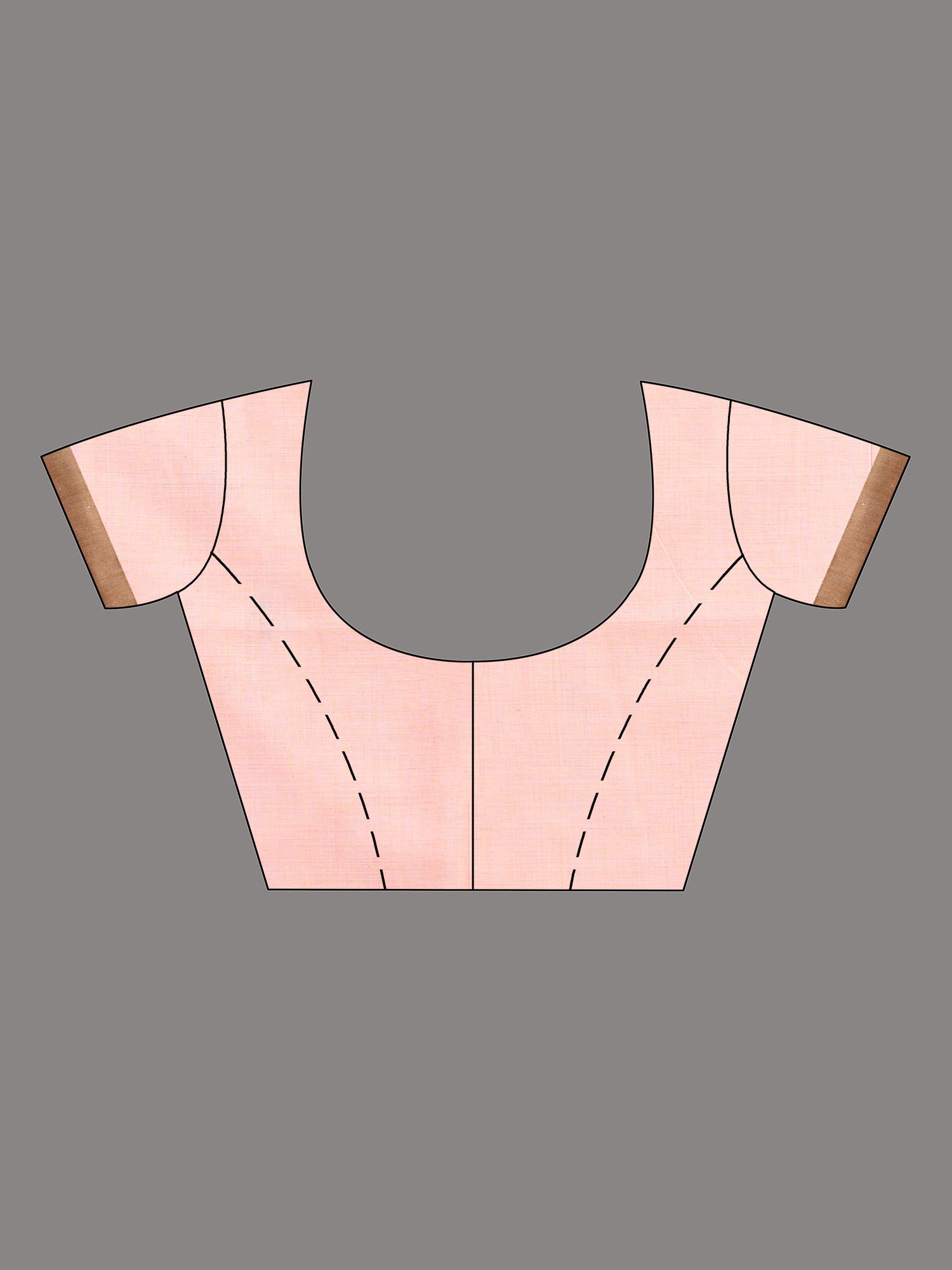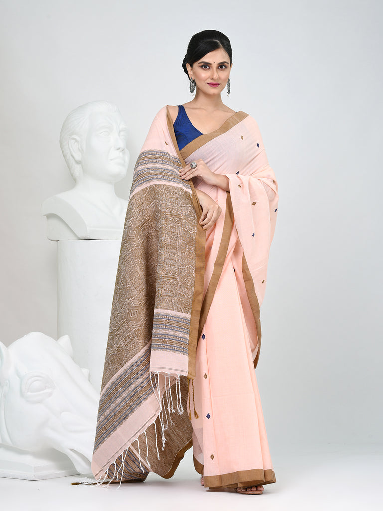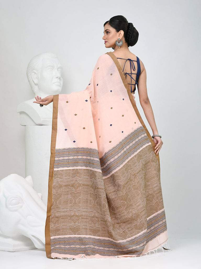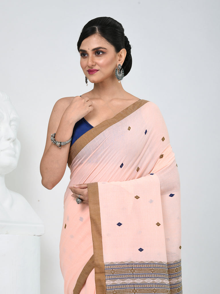 This refined peach cotton saree is a blend of simplicity and elegance, featuring beautifully arranged brown and black diamond motifs. The delicate accents add a touch of vibrancy to the soft, breathable fabric, making it perfect for everyday wear or casual gatherings. The saree is finished with a contrasting brown border that enhances the overall design, giving it a classic yet contemporary look. Lightweight and comfortable, this saree is ideal for those who seek understated elegance in their wardrobe.