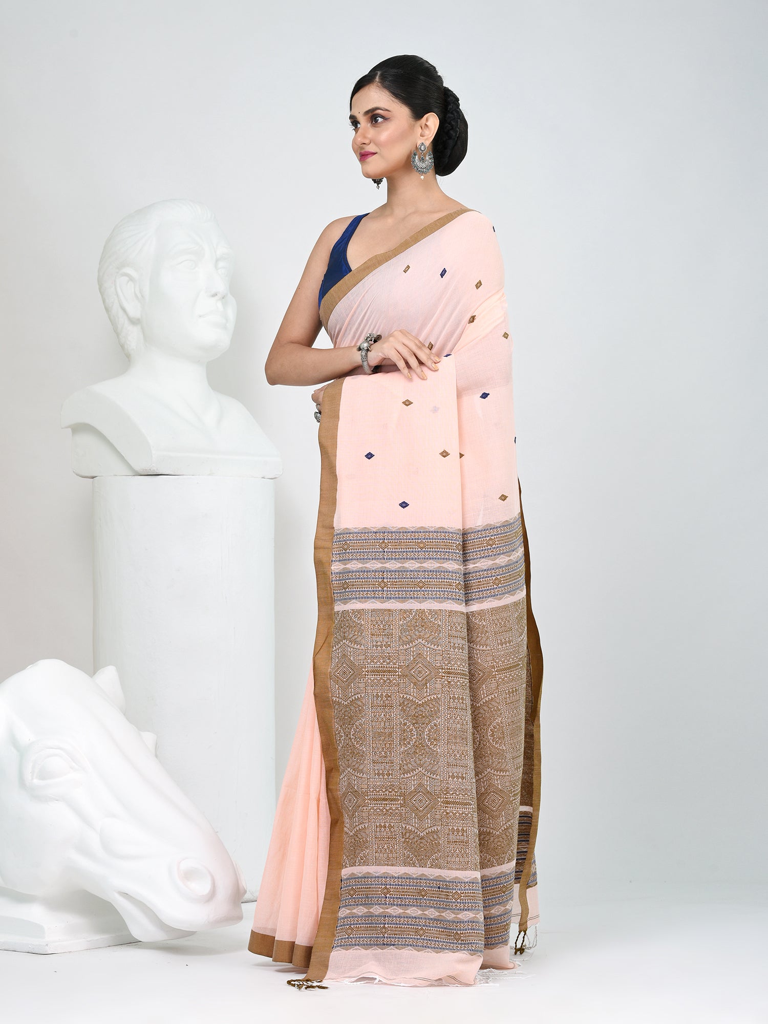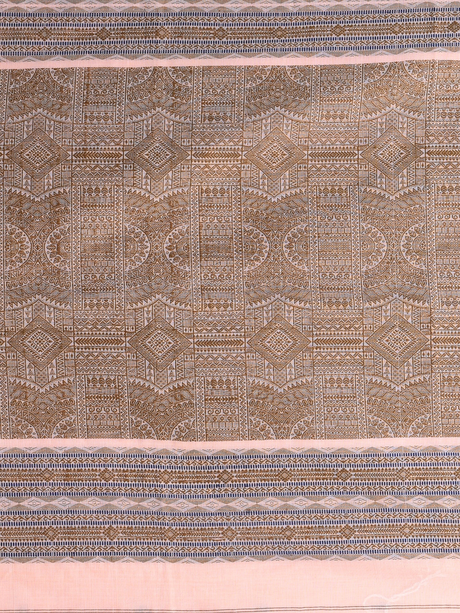 Elegant Peach Cotton Saree with Brown and Black Diamond Motifs