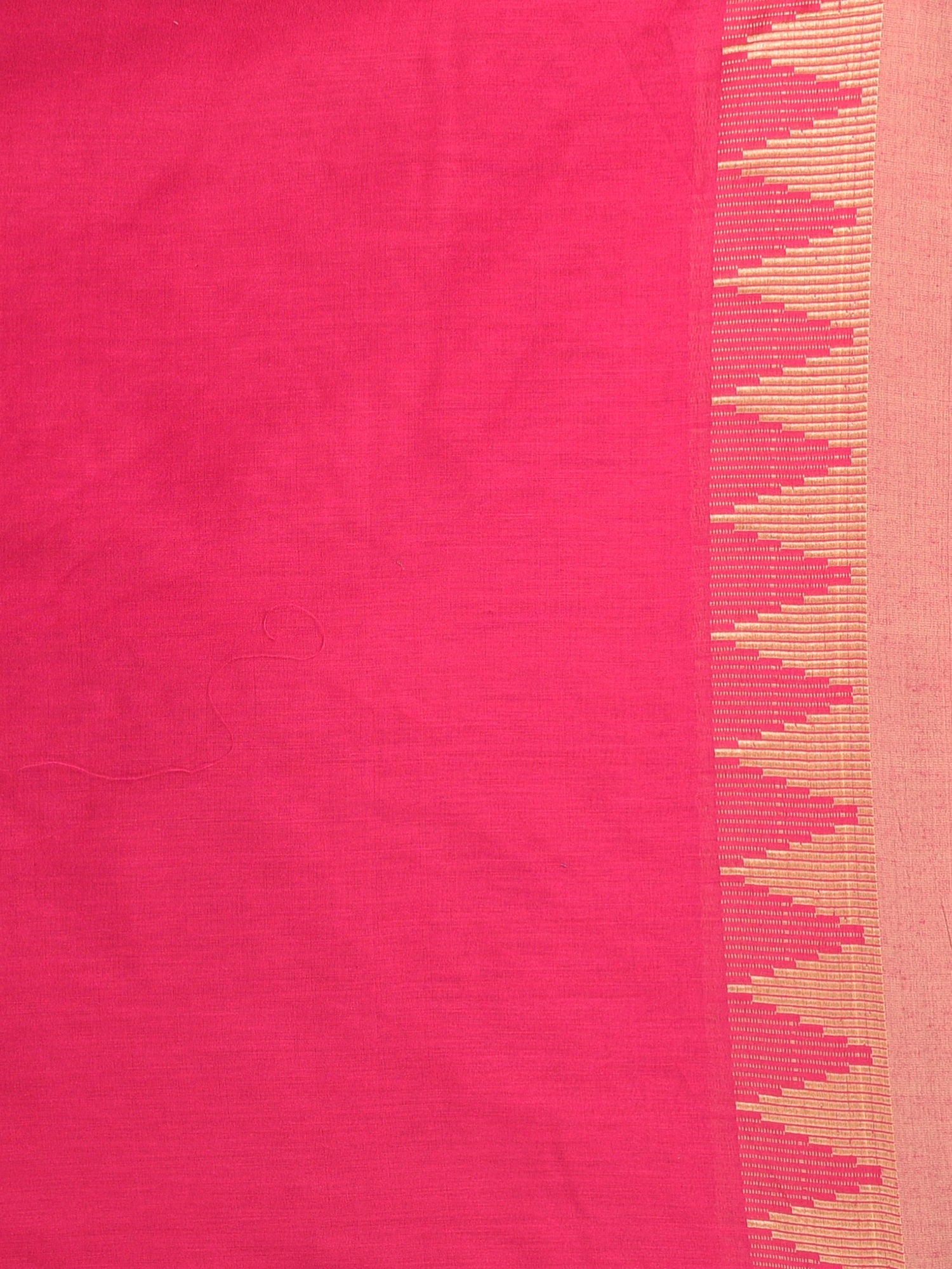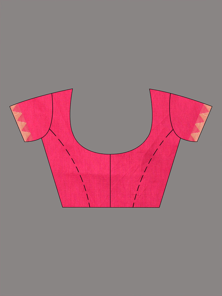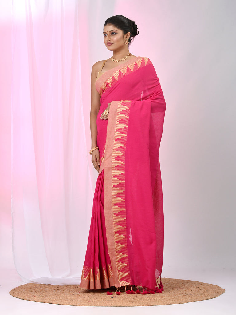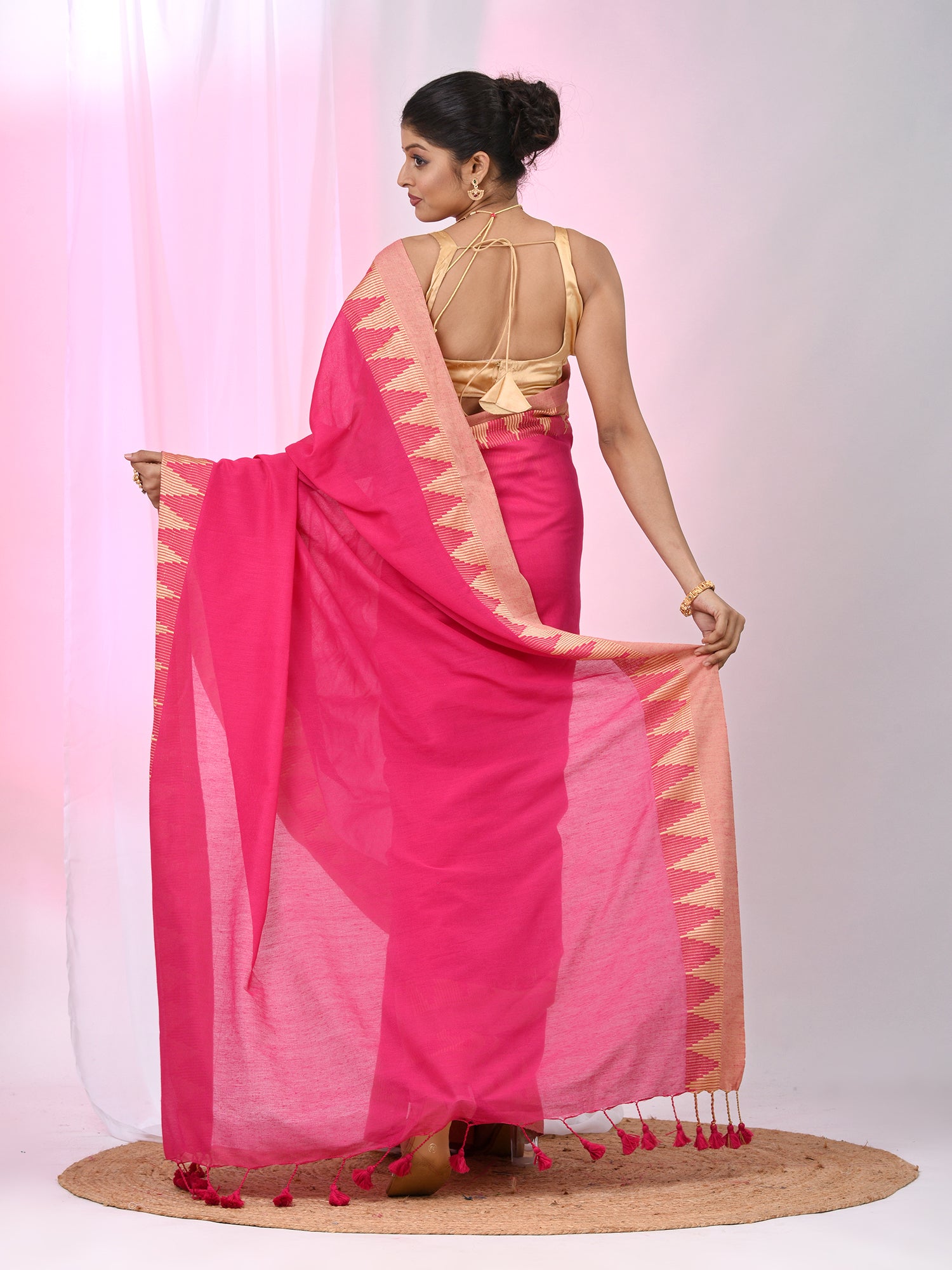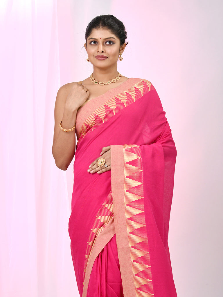 Add a vibrant touch to your wardrobe with this beautiful pink cotton saree, featuring a striking geometric border that enhances its traditional appeal. The saree is meticulously crafted from soft, breathable cotton, offering comfort and ease throughout the day. The playful pom pom at the pallu bring a chic finish to the design, making it perfect for casual gatherings, festive occasions, or evening wear. Its rich pink color and unique border design make it a perfect blend of simplicity and elegance. Pair it with a matching blouse to complete the look!