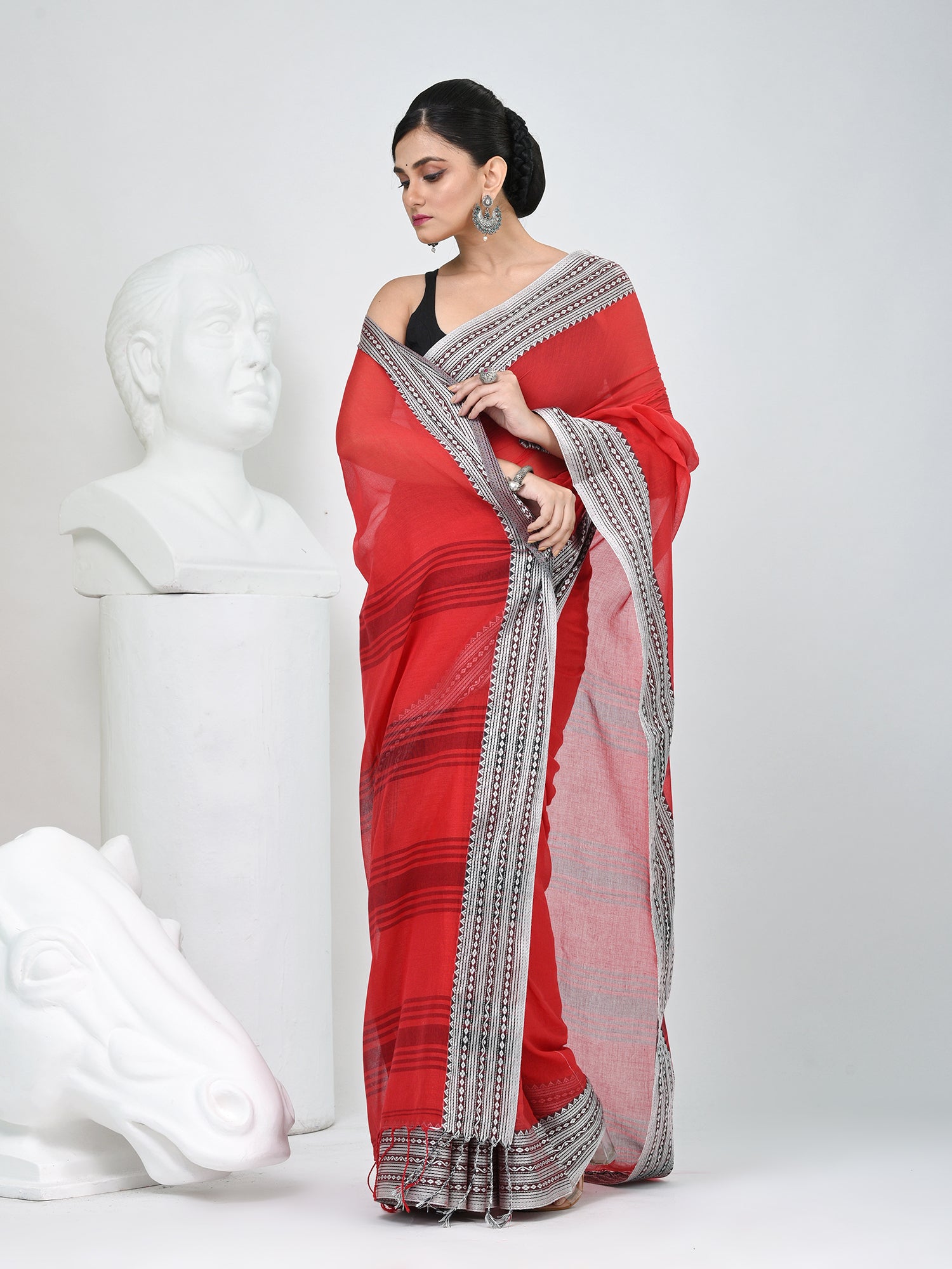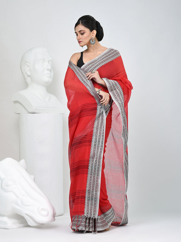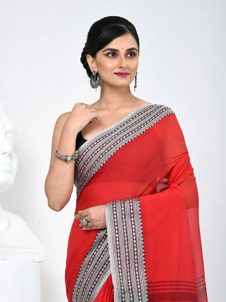 Elegant Red Mulmul Cotton Saree with Black & White Woven Border