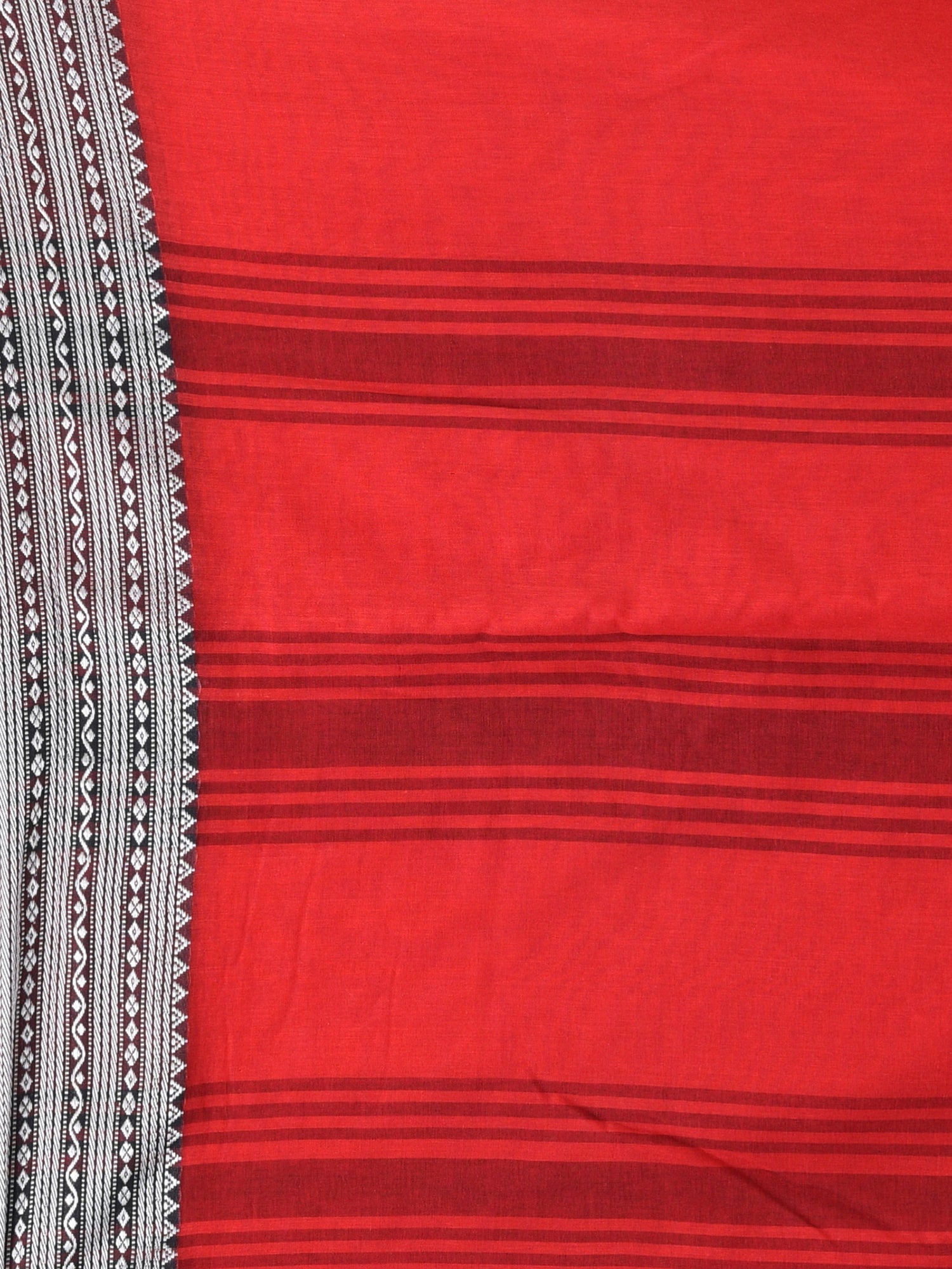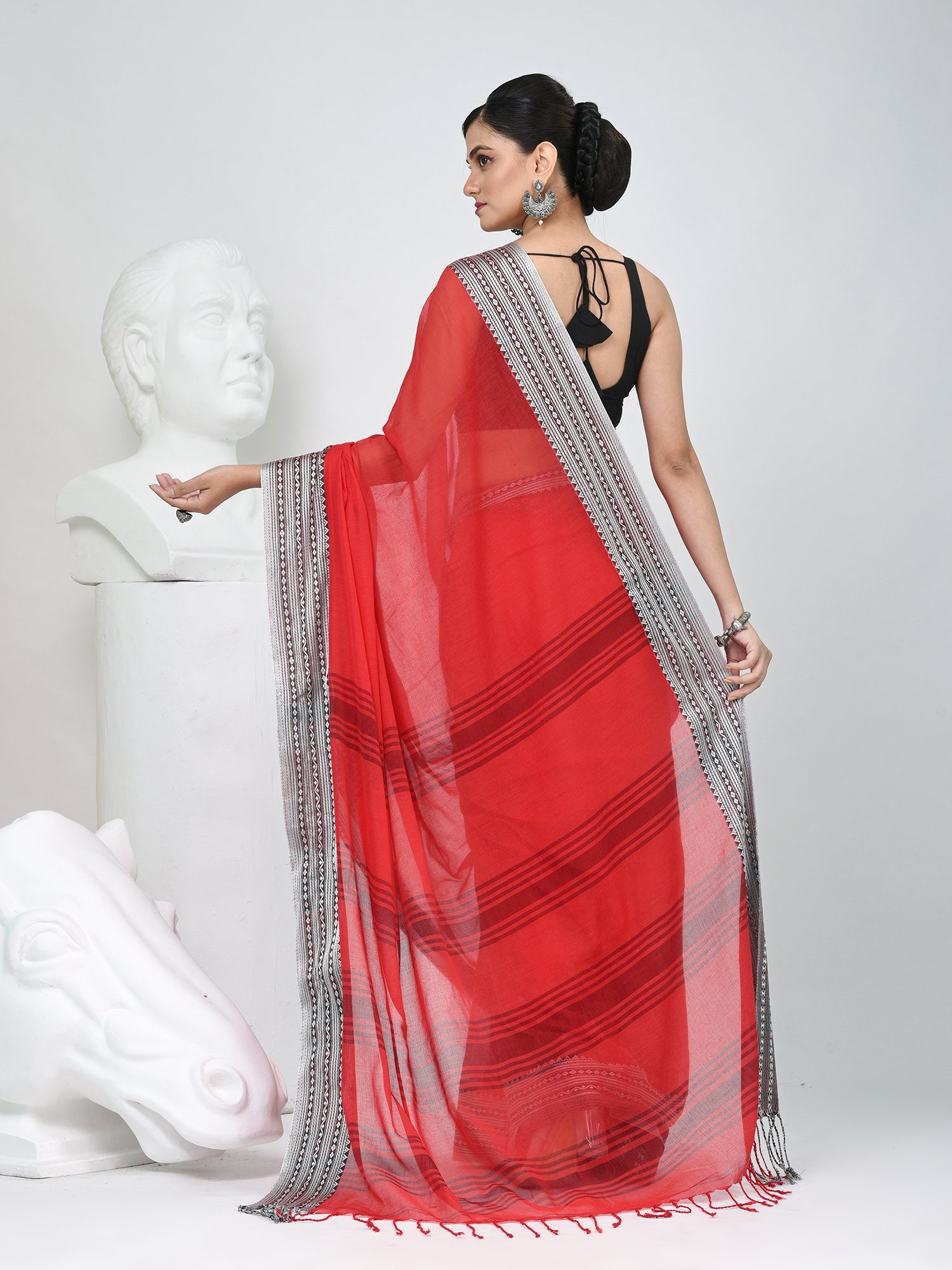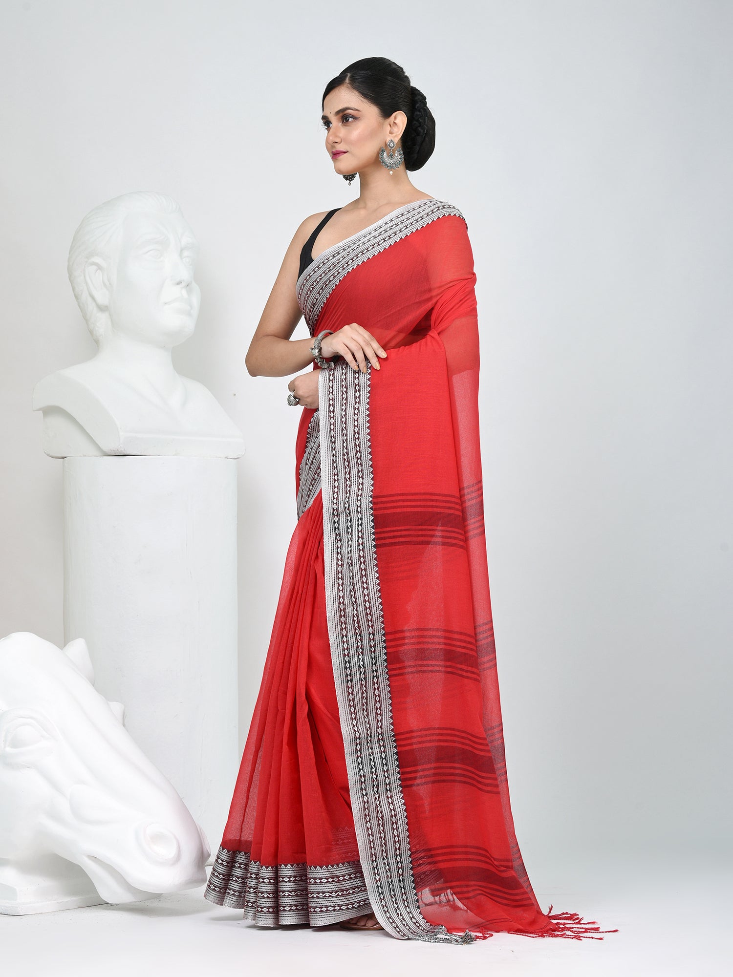 Elegant Red Mulmul Cotton Saree with Black & White Woven Border