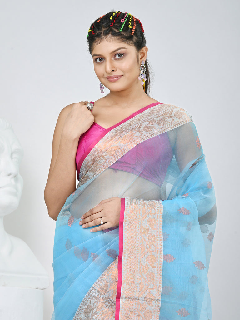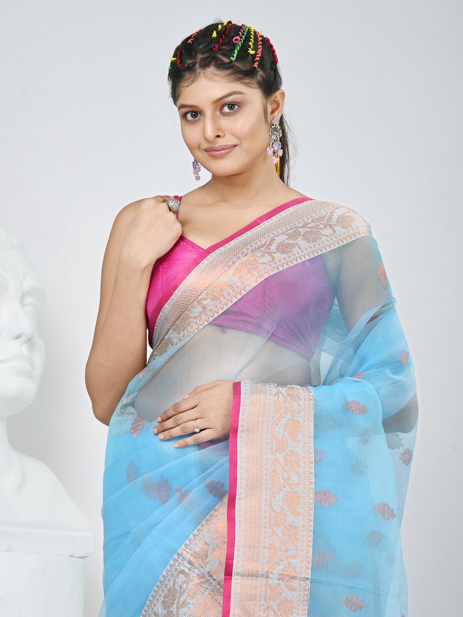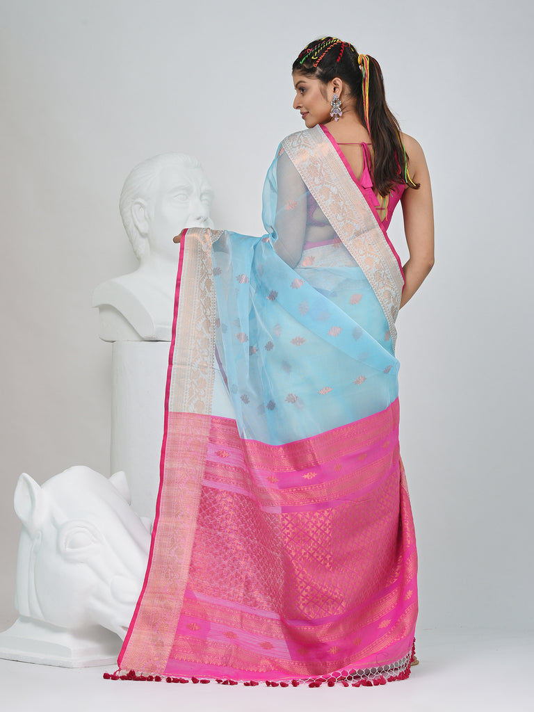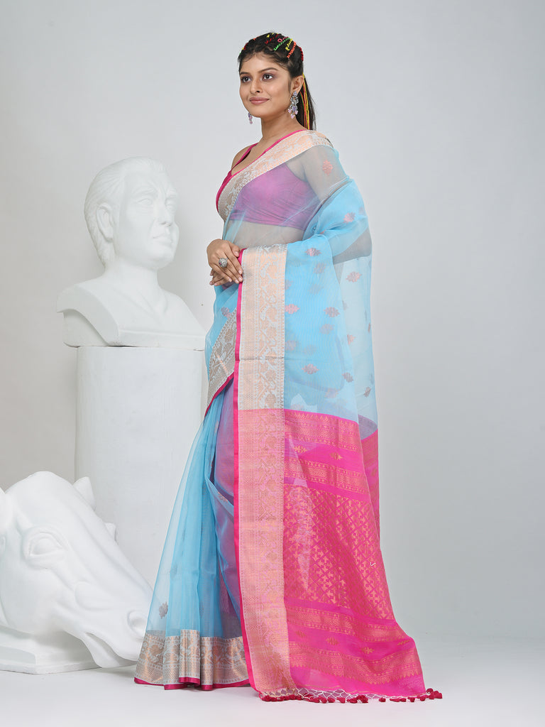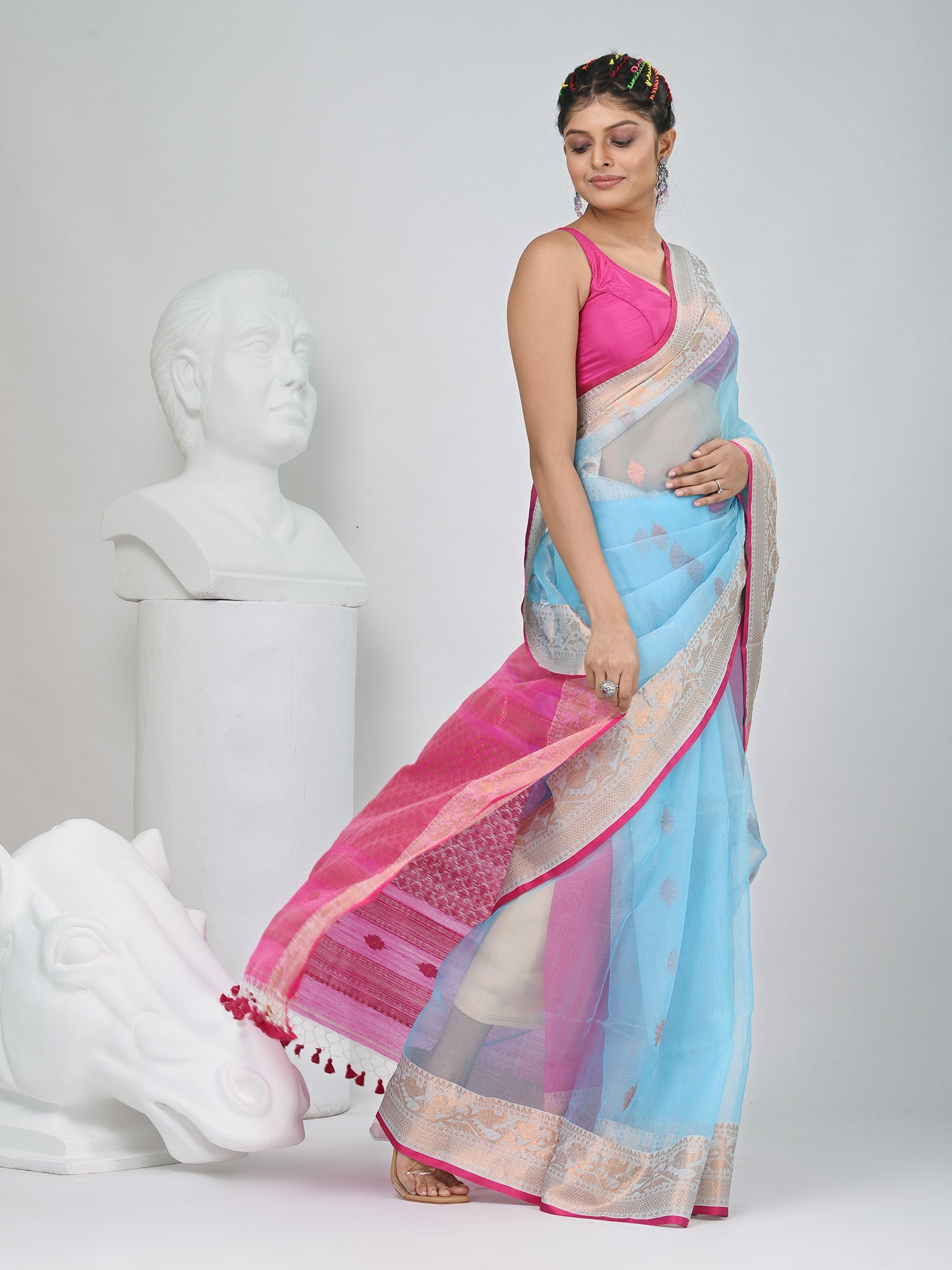 Step into timeless elegance with this exquisite sky blue resham saree, beautifully complemented by a striking pink pallu. The saree features intricate zari weaving along the borders and pallu, adding a rich traditional charm. Crafted from premium resham fabric, it drapes gracefully, making it perfect for festive occasions, weddings, and cultural celebrations. The contrast pink blouse piece enhances its vibrant appeal, ensuring you stand out with sophistication and style.