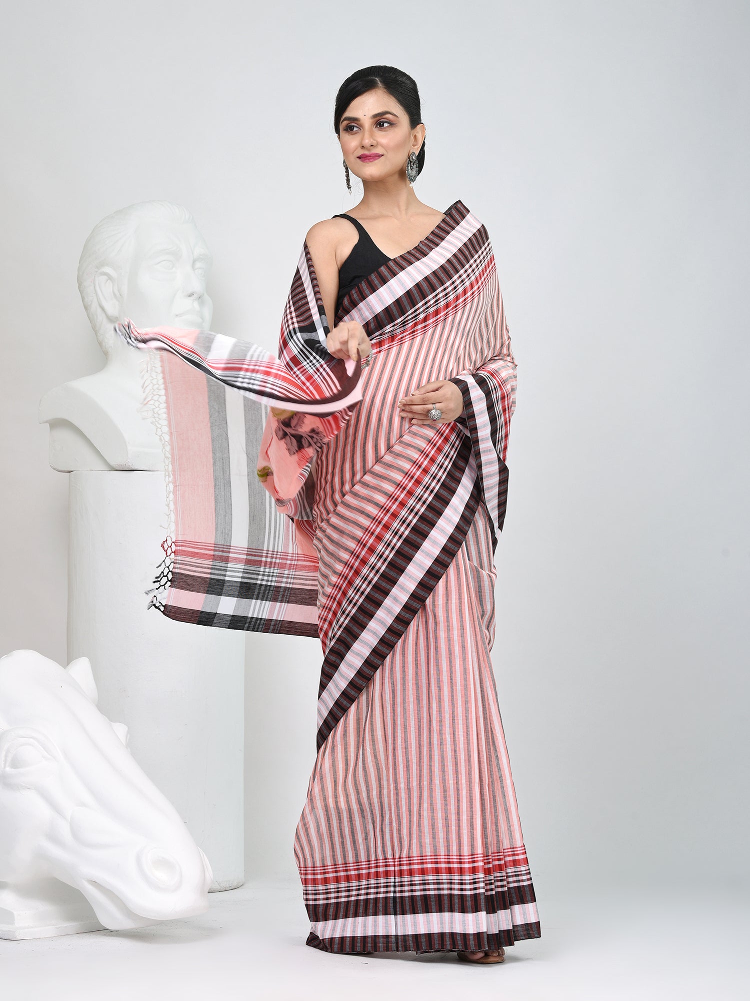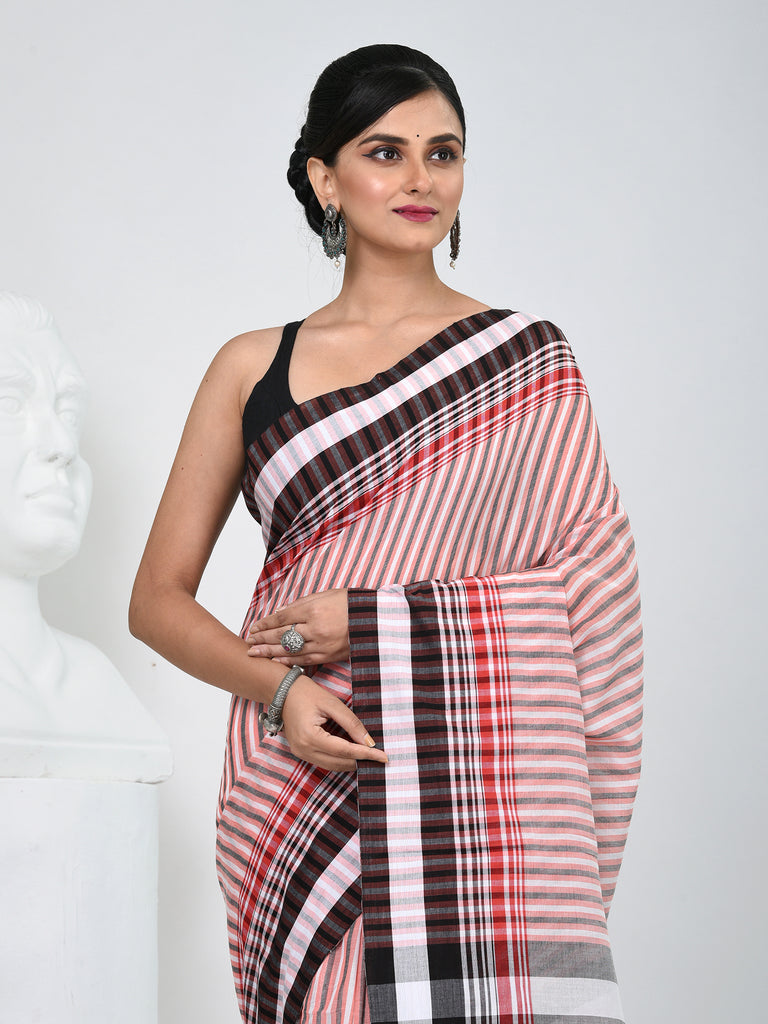 Elegant Striped Cotton Saree in Black, White & Red Combination