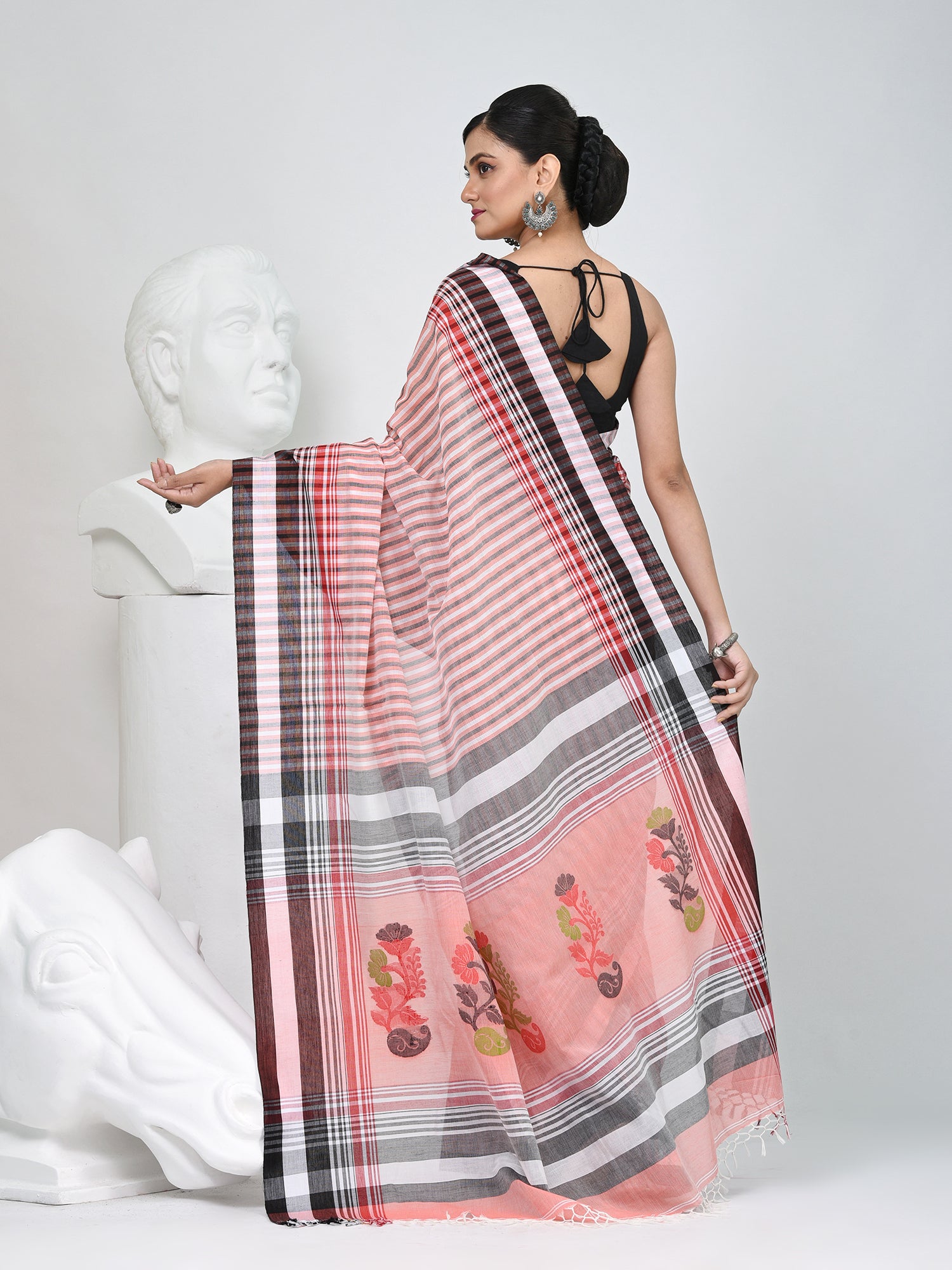 Bring home timeless elegance with this classic striped cotton saree, featuring a graceful blend of black, white, and red tones. Crafted from soft and breathable cotton, it ensures day-long comfort while offering a sophisticated drape. The saree’s vertical stripe design enhances the overall look, while the bold black and red borders add a striking contrast. Perfect for office wear, casual outings, or traditional gatherings, this saree beautifully balances simplicity with style.
