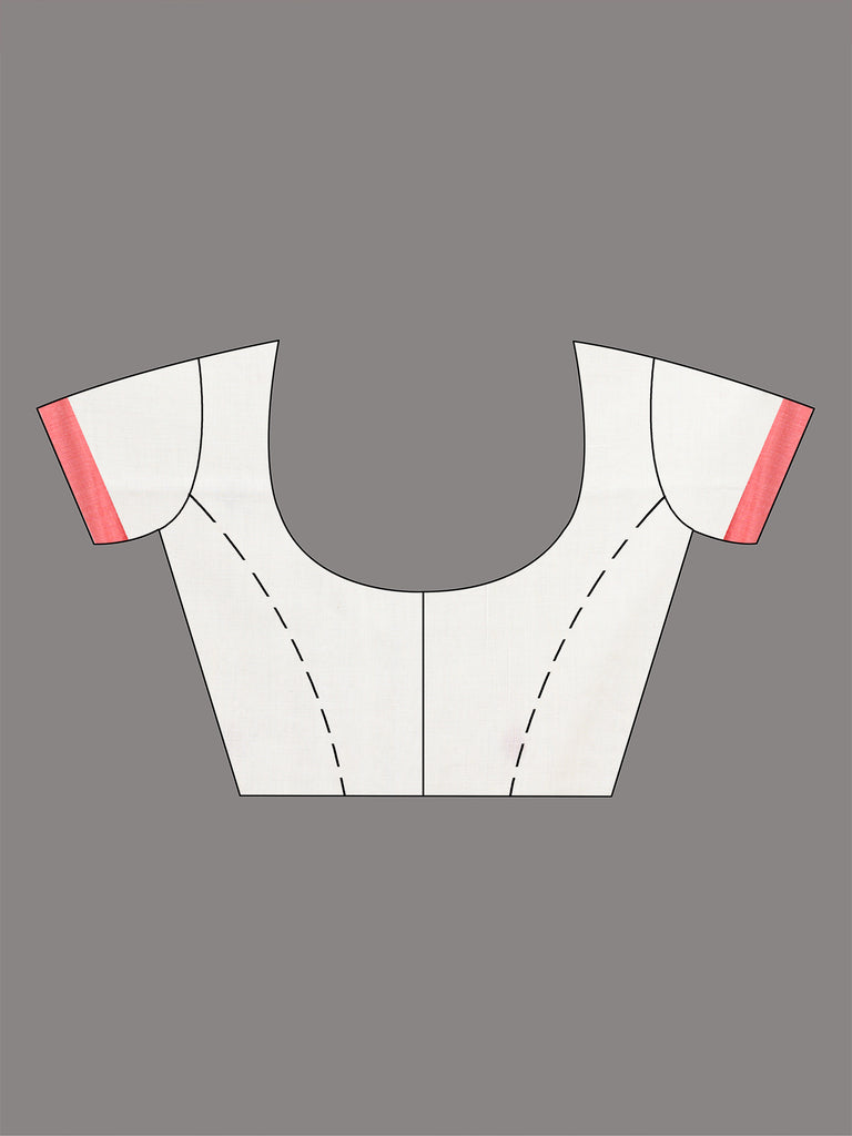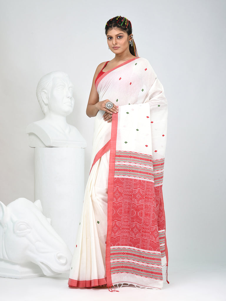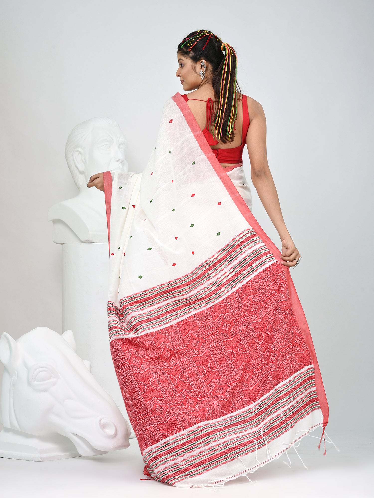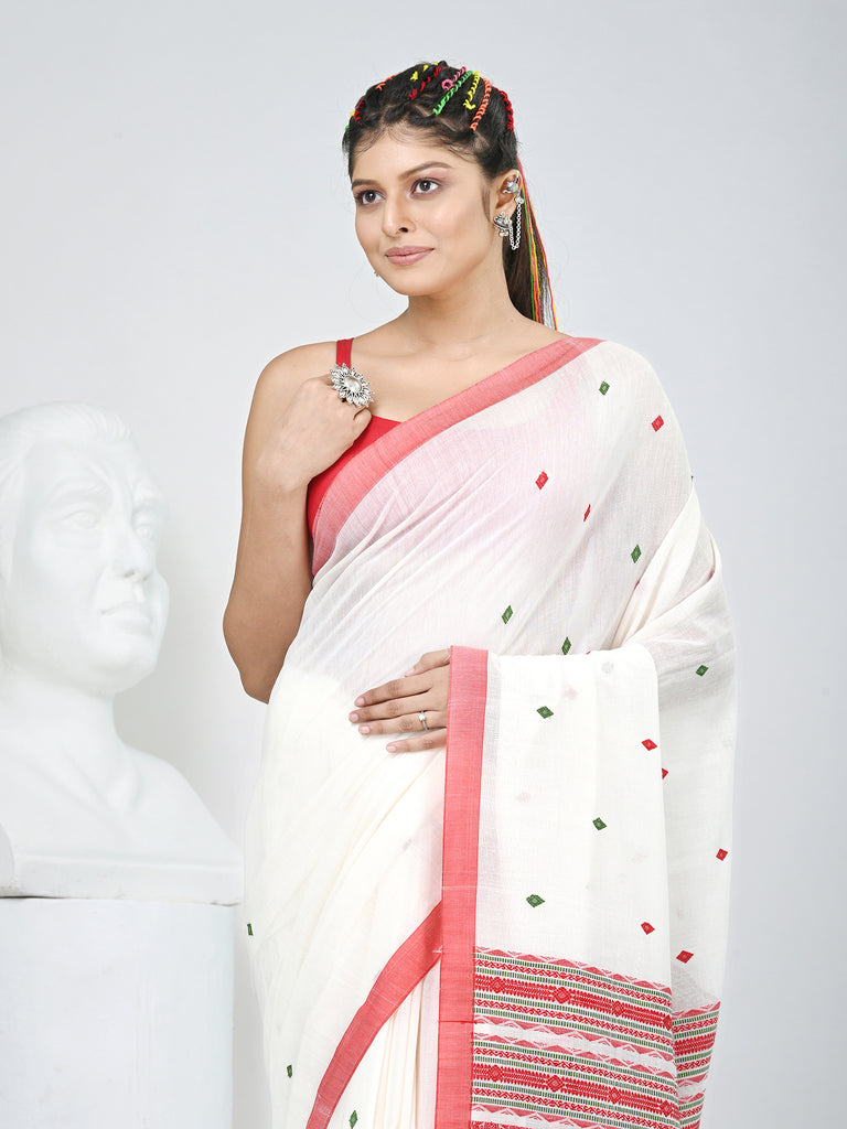This refined white cotton saree is a blend of simplicity and elegance, featuring beautifully arranged red and green diamond motifs. The delicate accents add a touch of vibrancy to the soft, breathable fabric, making it perfect for everyday wear or casual gatherings. The saree is finished with a contrasting red border that enhances the overall design, giving it a classic yet contemporary look. Lightweight and comfortable, this saree is ideal for those who seek understated elegance in their wardrobe.