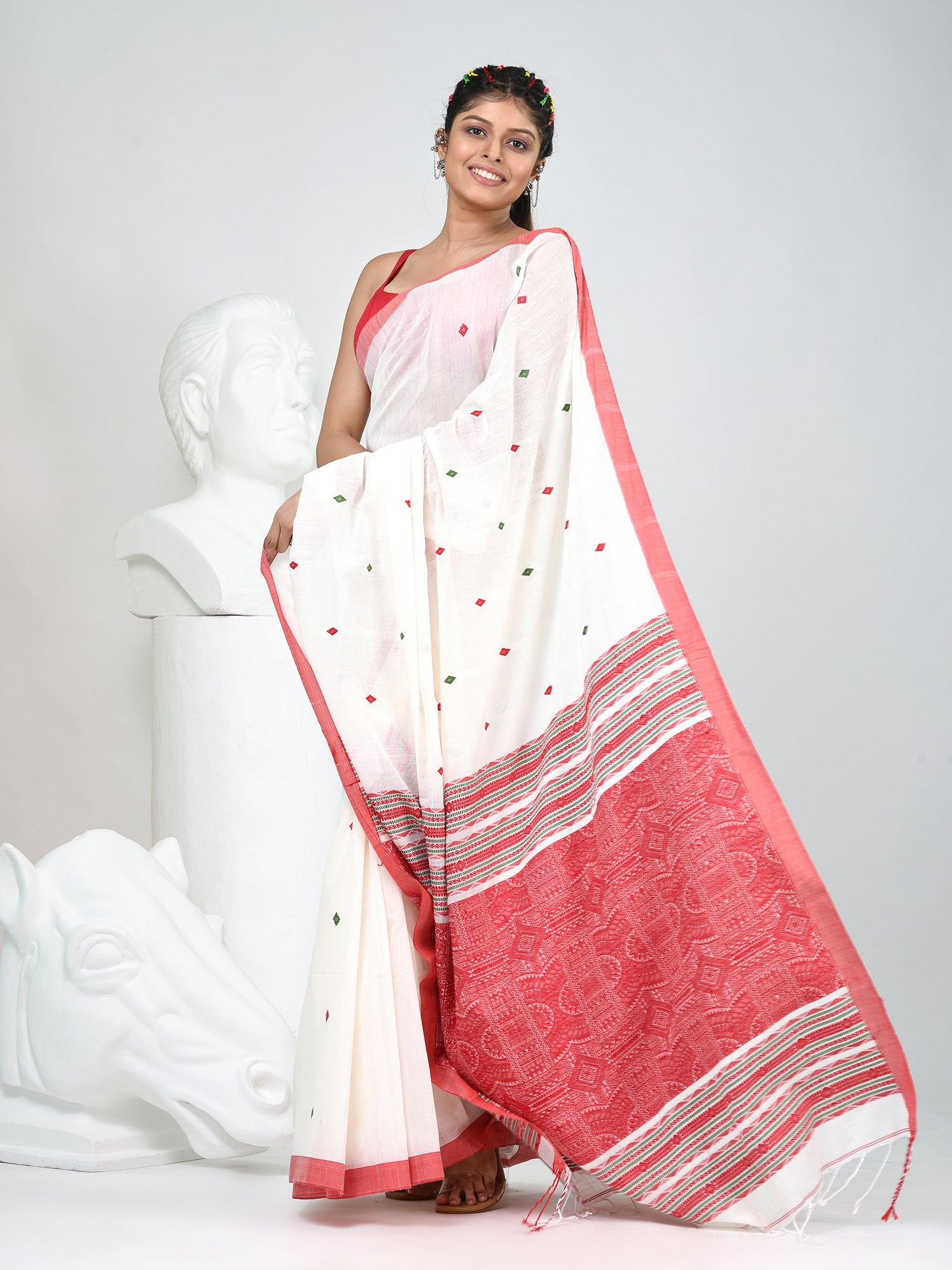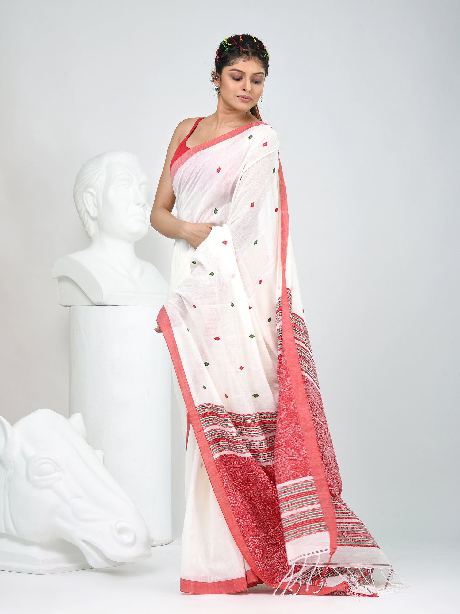 Elegant White Cotton Saree with Red and Green Diamond Motifs