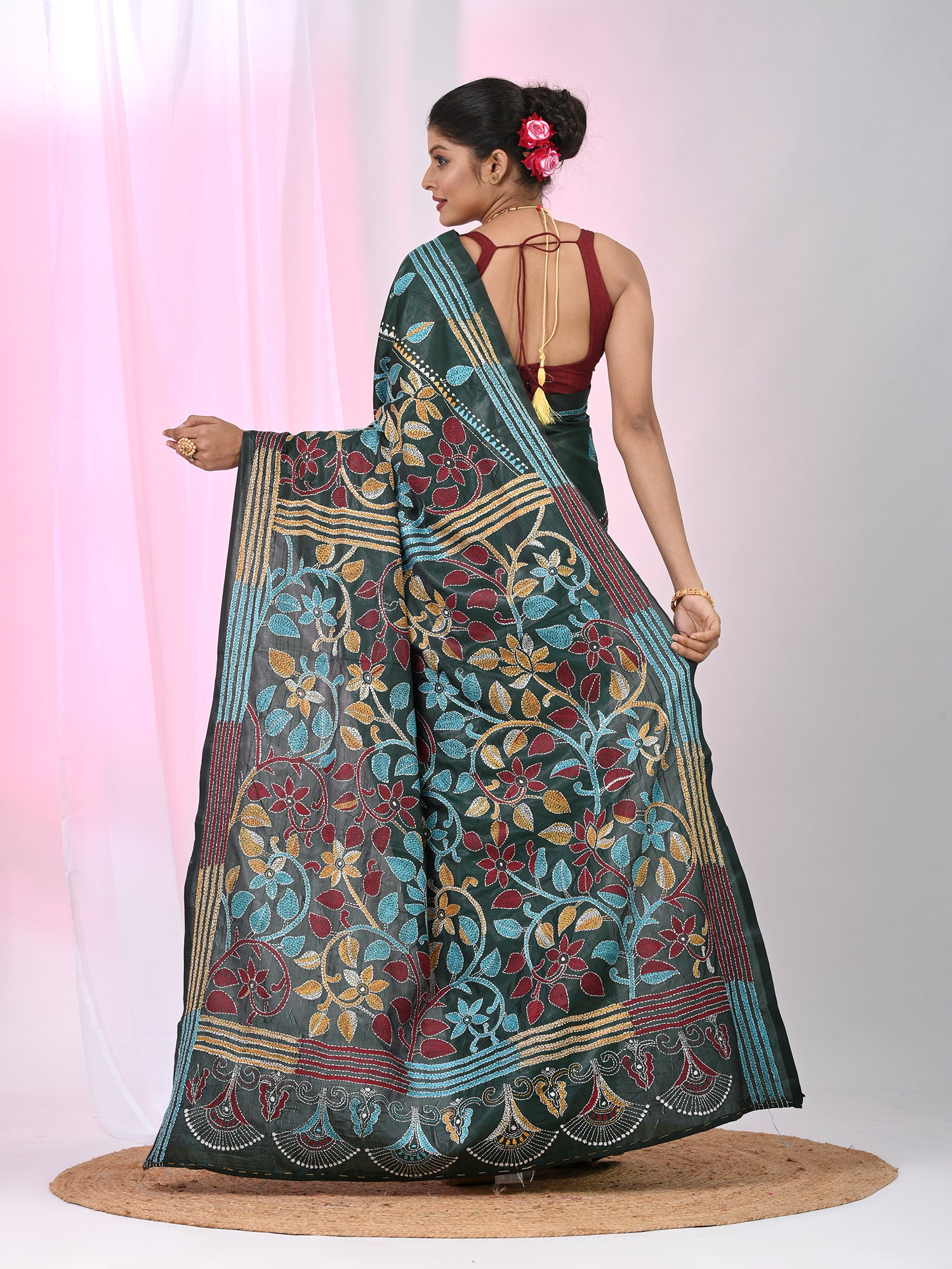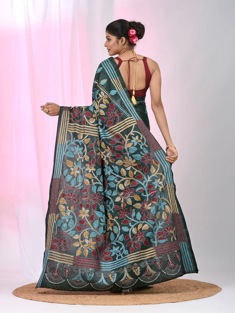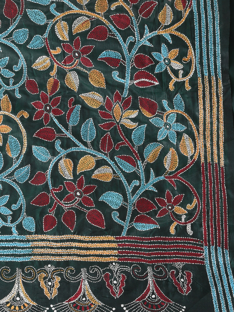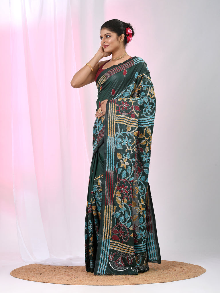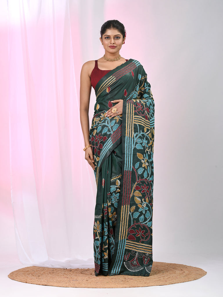 Emerald Green Silk Kantha Stitch Saree with Multicolor Thread Work