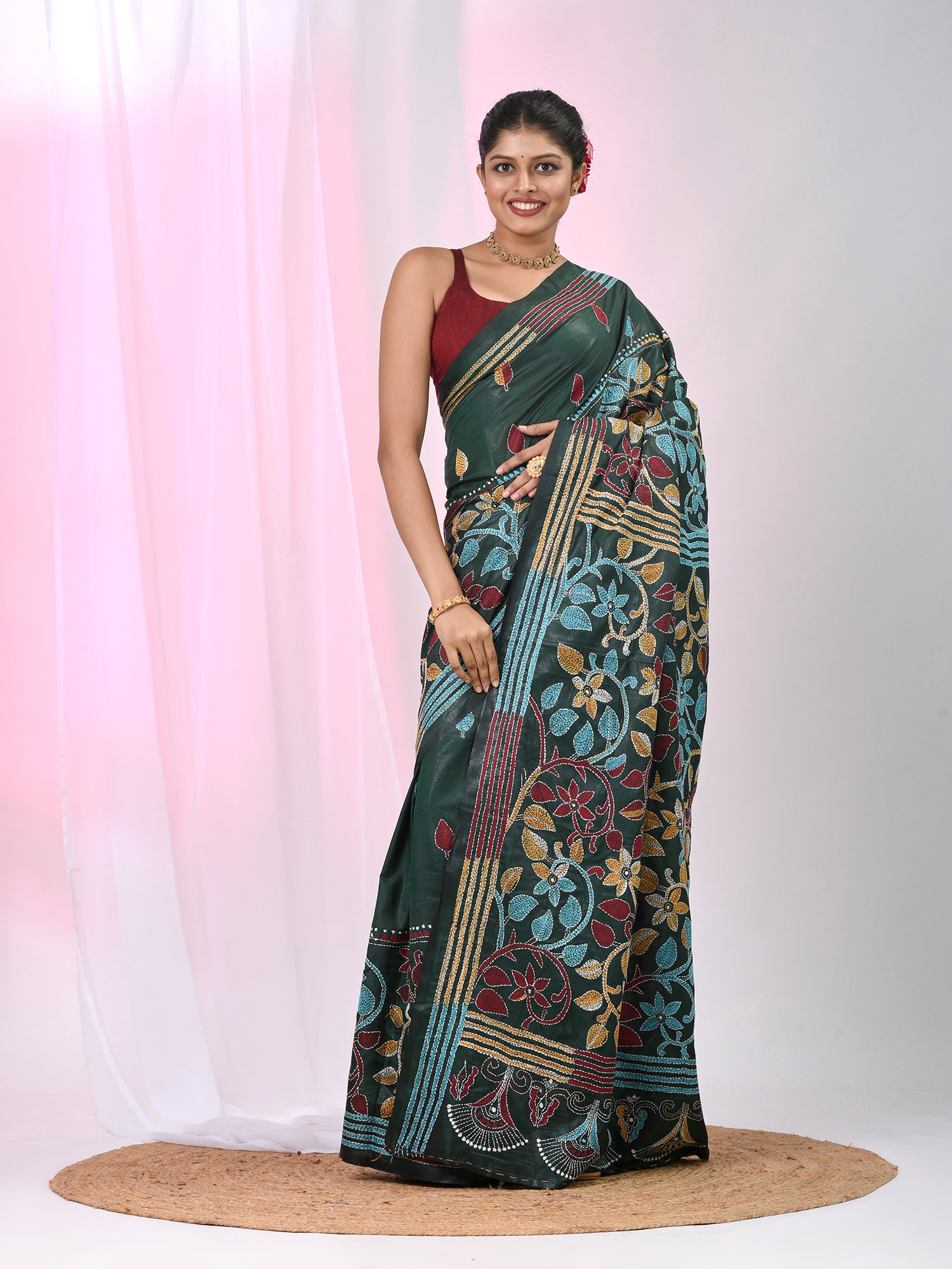 Embrace traditional artistry with this exquisite silk blend Kantha stitch saree in a rich emerald green hue. Adorned with vibrant multicolor thread work, this masterpiece beautifully blends heritage craftsmanship with modern elegance. The intricate Kantha hand-stitch detailing across the pallu and border enhances its timeless appeal, making it perfect for festive occasions, weddings, and cultural celebrations. Crafted from a premium silk blend fabric, the saree drapes gracefully, offering both comfort and sophistication. Pair it with a golden or contrasting blouse to create a stunning statement look.