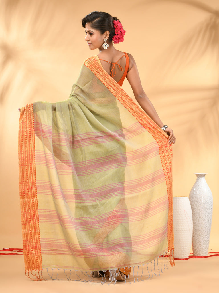 Elevate your ethnic wardrobe with the timeless charm of the green Soft Mulmul Cotton Saree. Crafted from soft, breathable mulmul cotton, this saree features a soothing green base complemented by vibrant borders and a contrasting pallu adorned with traditional woven stripes. Lightweight and elegant, it's perfect for everyday elegance, festive gatherings, or summer occasions. The saree drapes effortlessly, offering comfort without compromising on style.