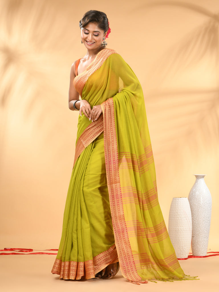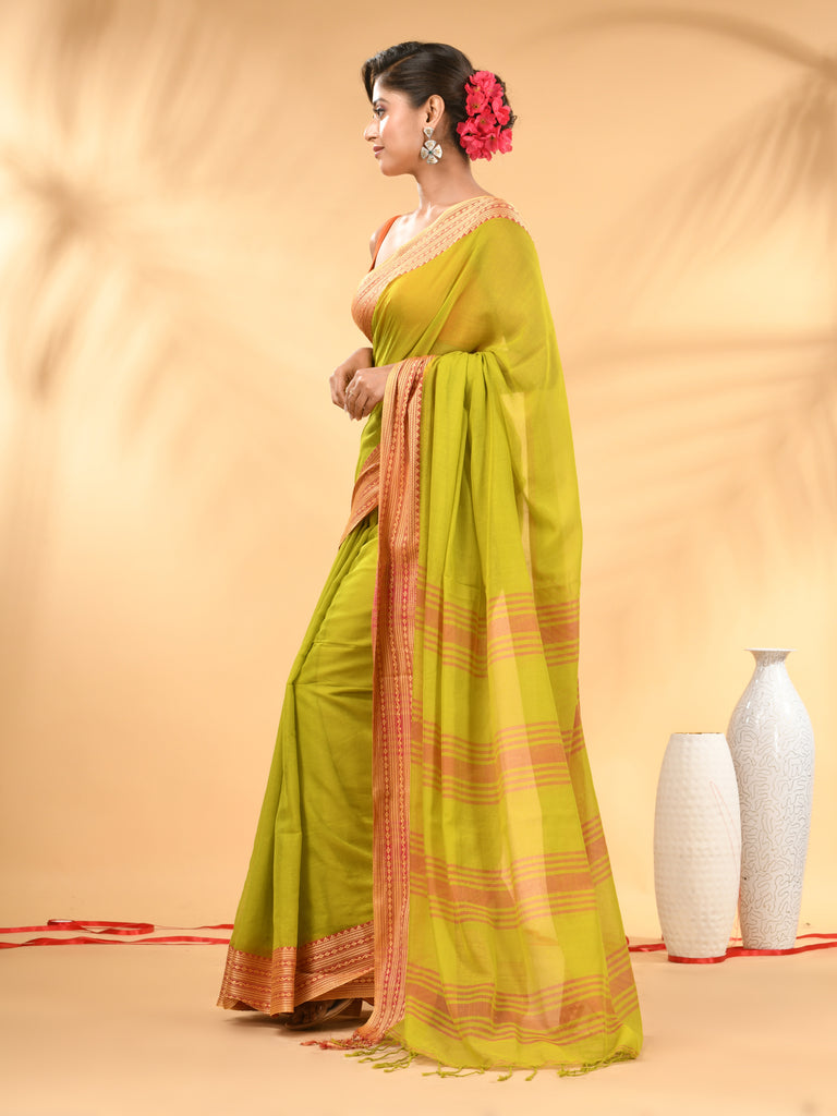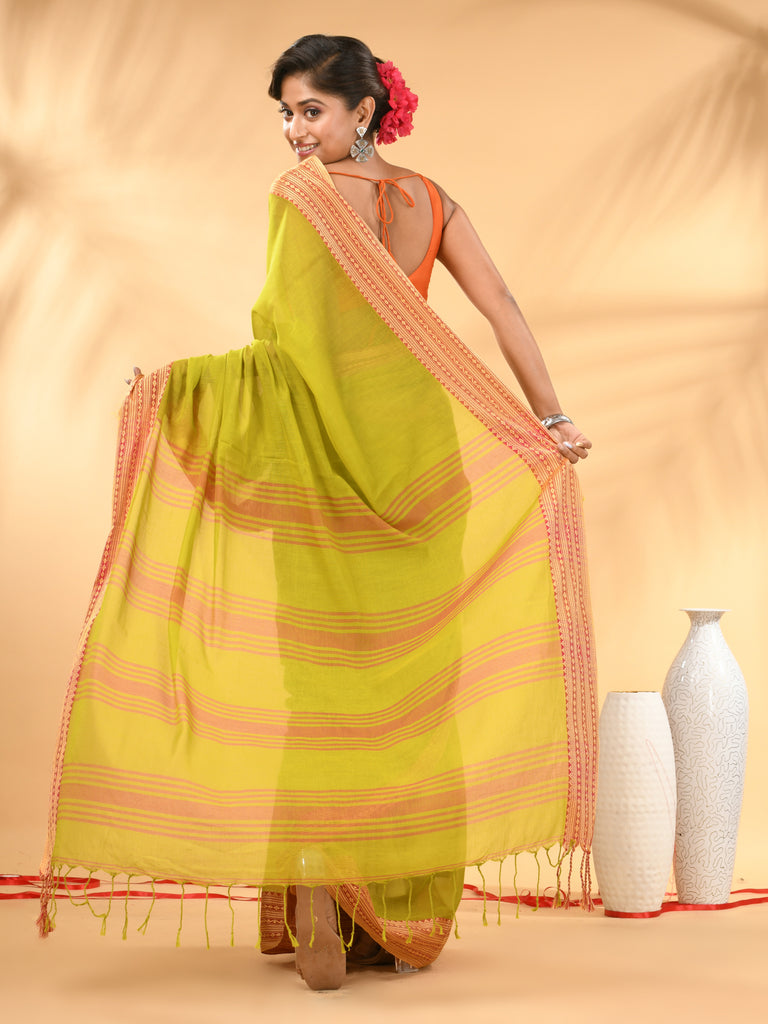 Elevate your ethnic wardrobe with the timeless charm of the Lime Green Soft Mulmul Cotton Saree. Crafted from soft, breathable mulmul cotton, this saree features a soothing lime green base complemented by vibrant borders and a contrasting pallu adorned with traditional woven stripes. Lightweight and elegant, it's perfect for everyday elegance, festive gatherings, or summer occasions. The saree drapes effortlessly, offering comfort without compromising on style.