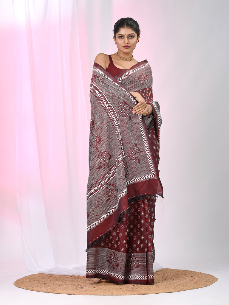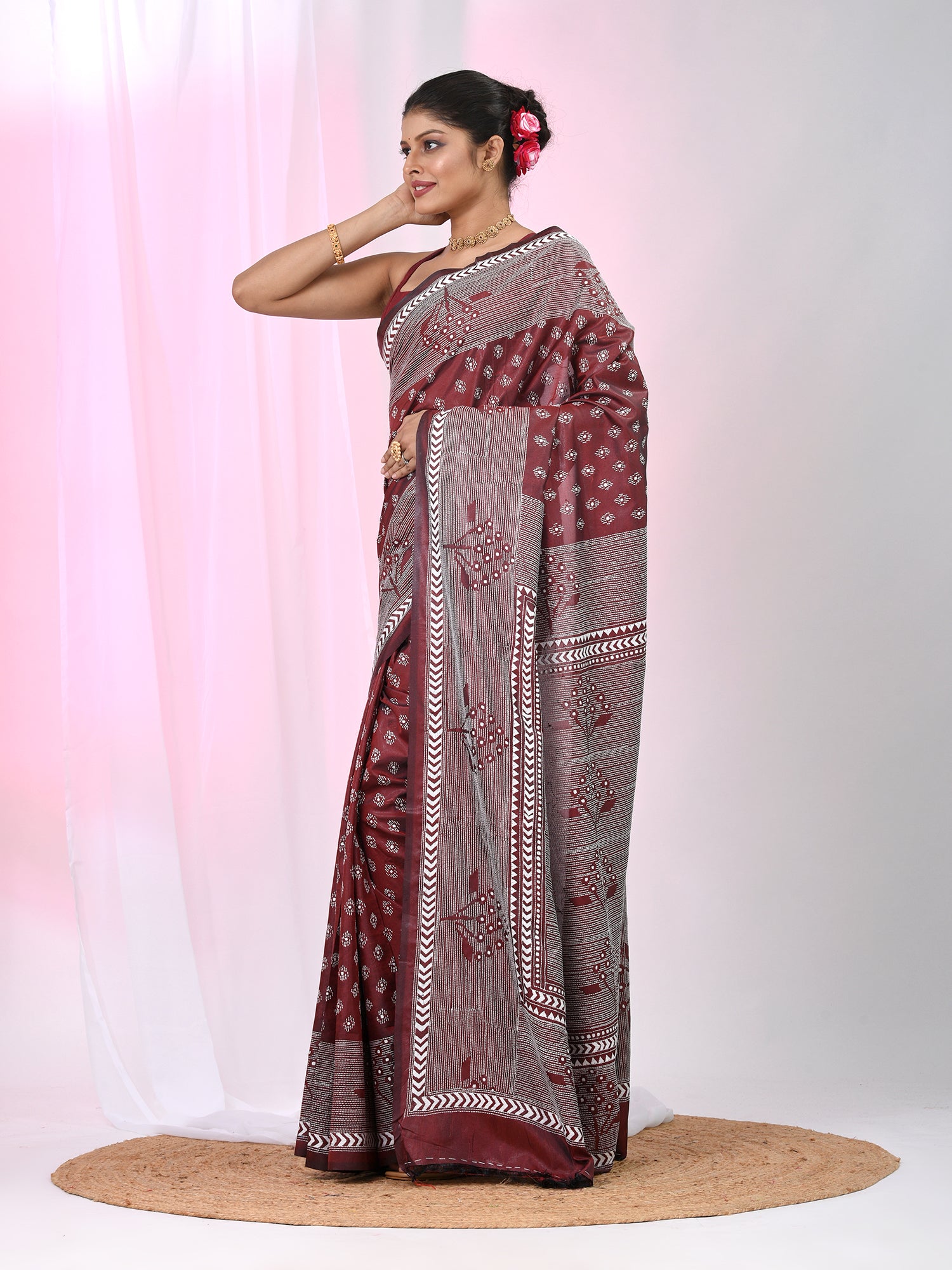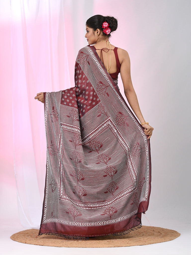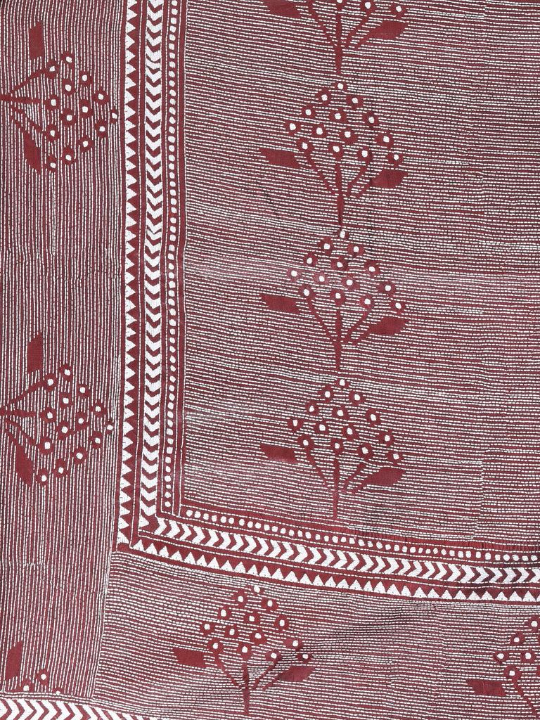 Maroon Silk Kantha Stitch Saree with Geometric & Floral Thread Work