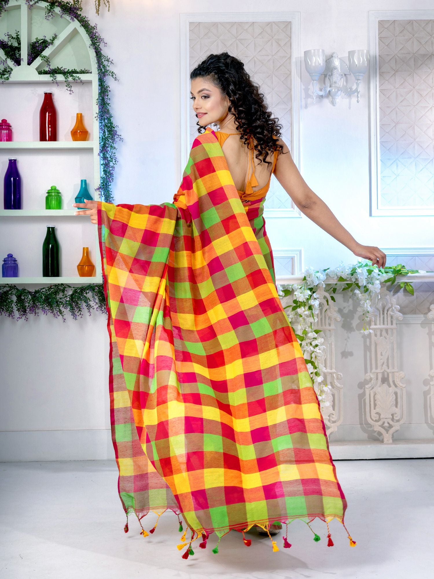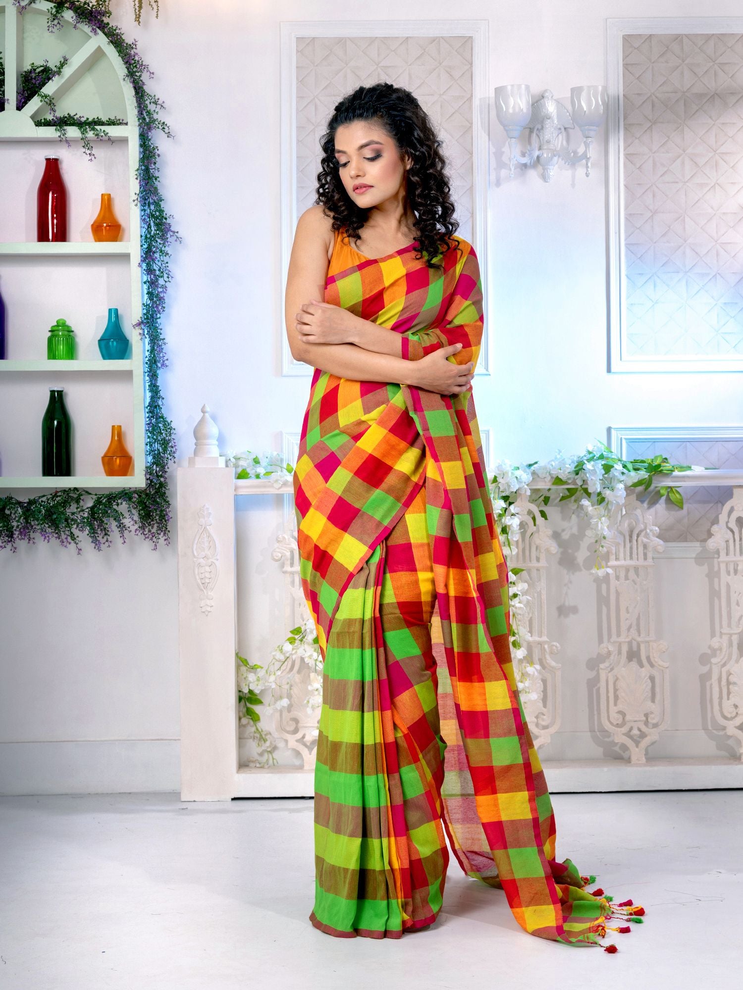 This summer season, flaunt your curves in the freshly arrived handloom sarees. Crafted in pure cotton fabric, this saree is perfect for casual wear. The multi-color cotton saree has box pattern all over the body that gives this saree a classic look. And multi-color pompom in pallu is enhancing the look of the saree. The saree comes with a matching unstitched blouse piece.