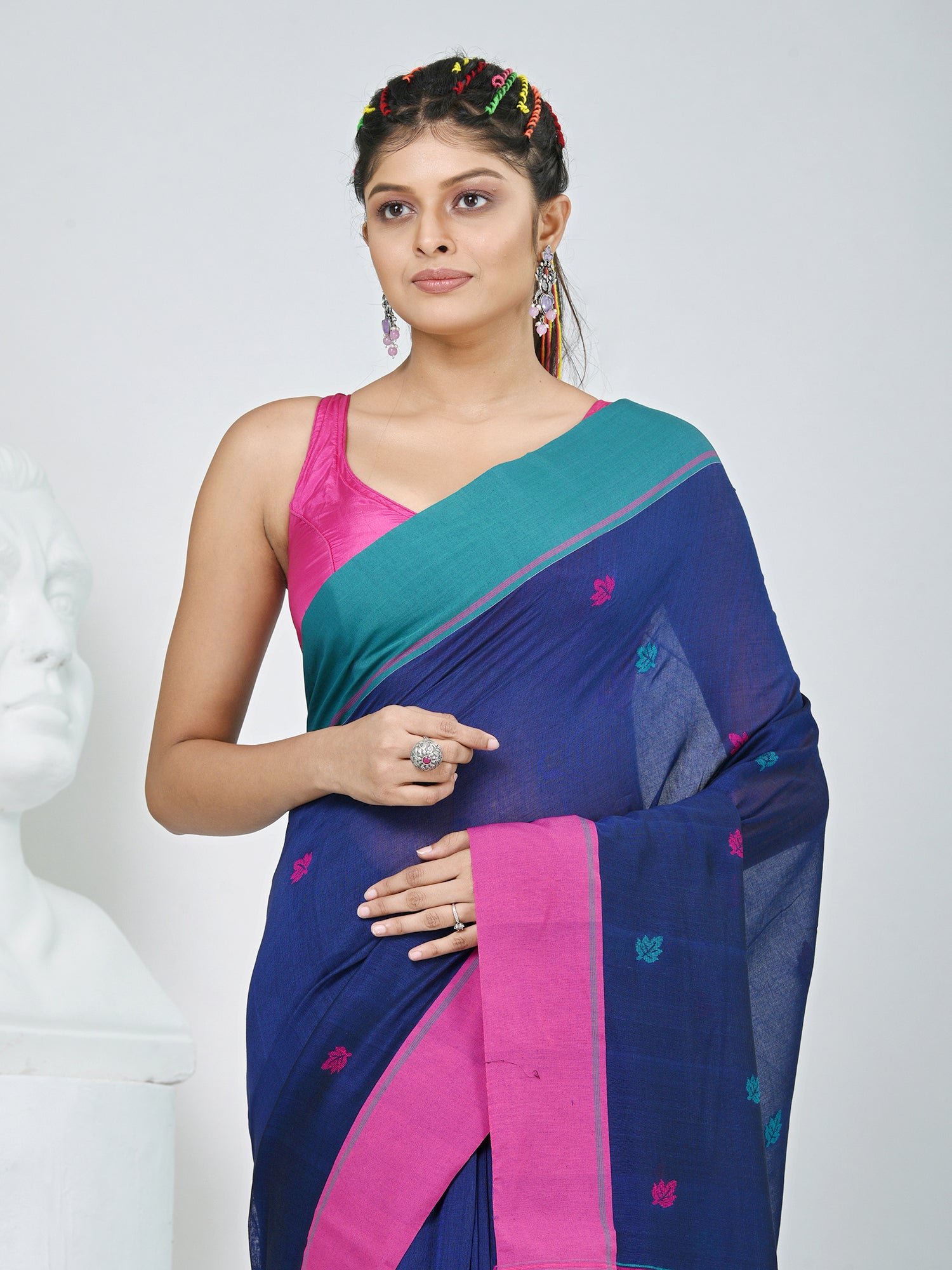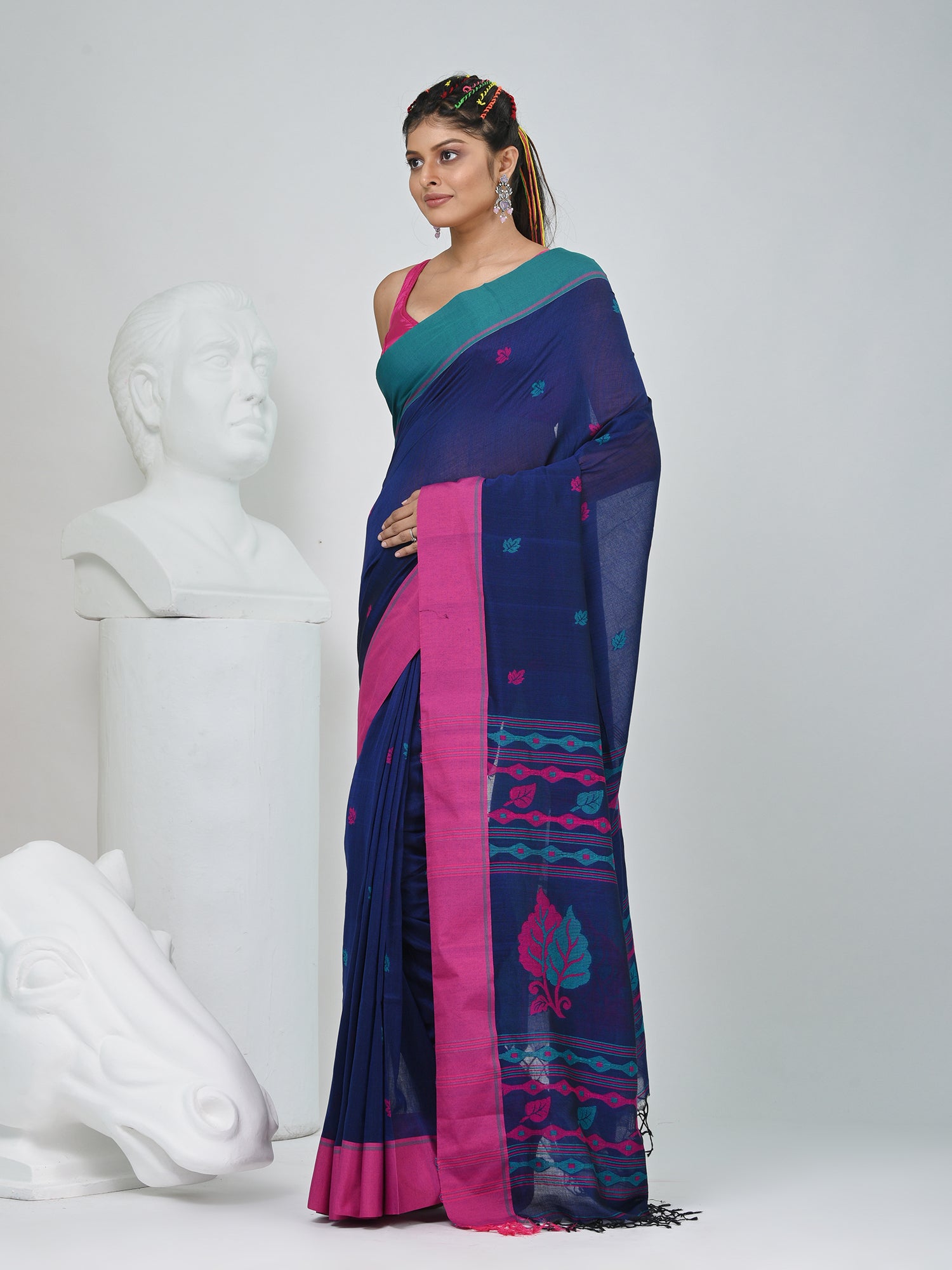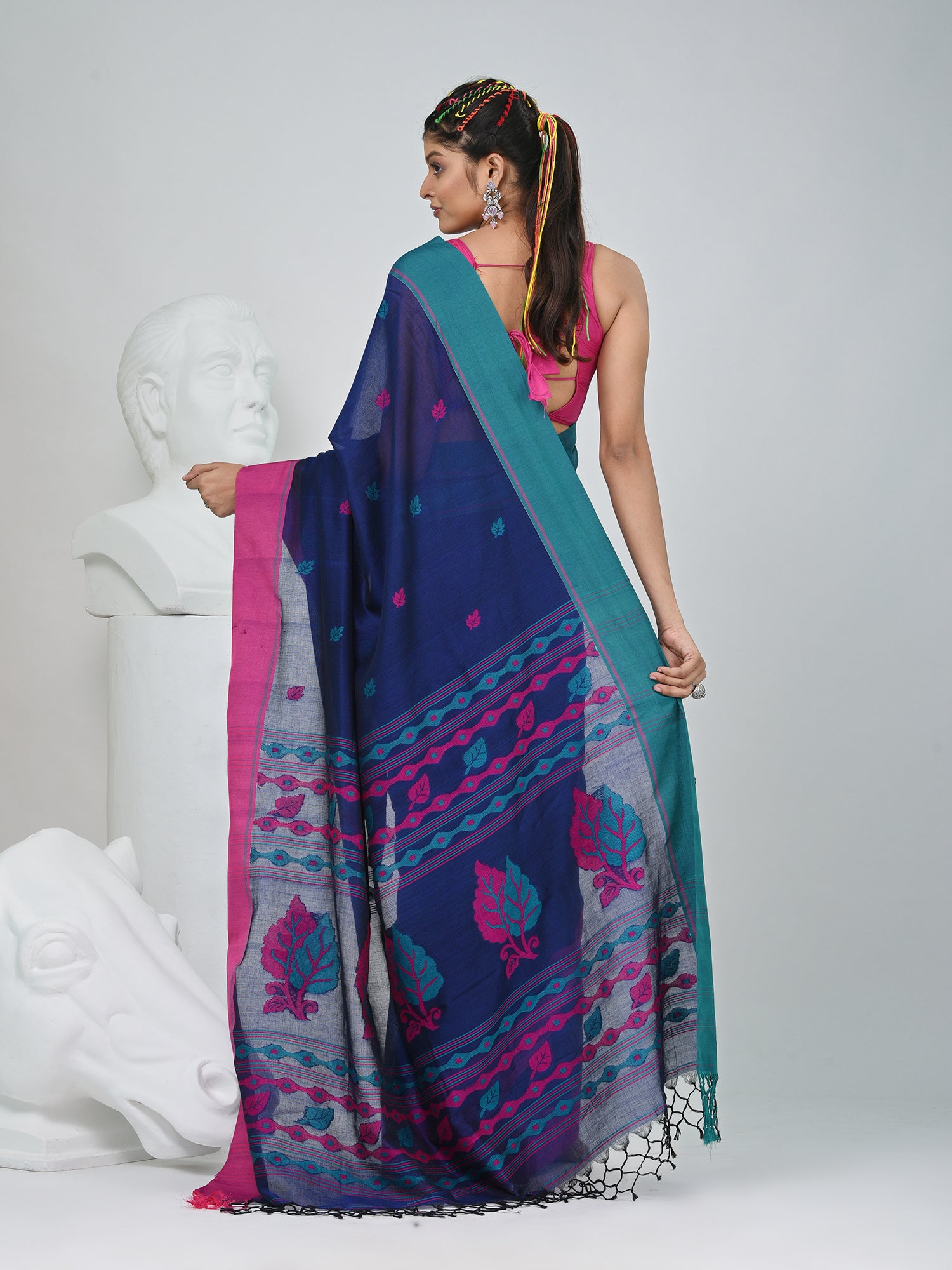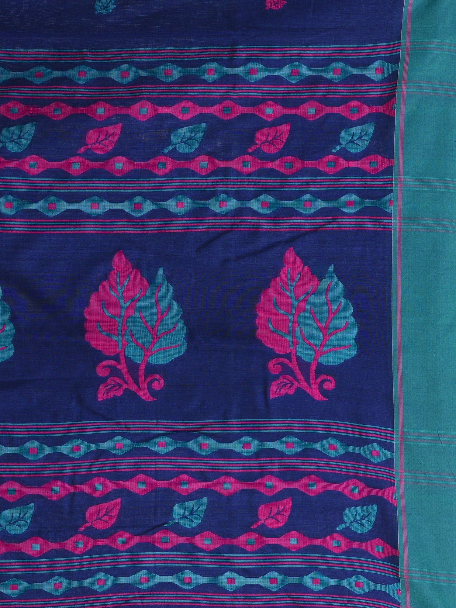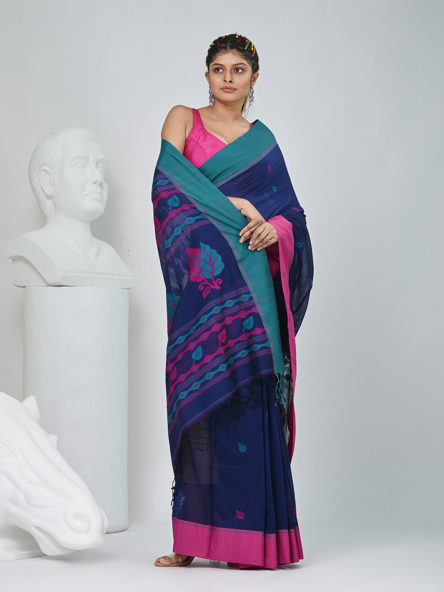 Navy Blue Cotton Saree with Pink And Teal Border & Leaf Design