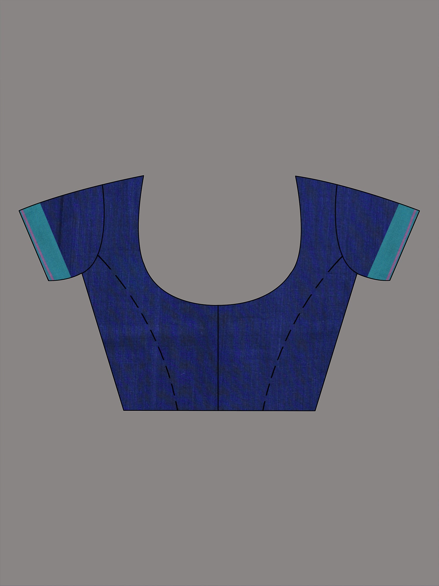 Add a vibrant touch to your ethnic collection with this elegant navy blue cotton saree, beautifully contrasted with a pink and teal border. The saree features woven leaf motifs and patterned detailing on the pallu, giving it a perfect blend of tradition and contemporary style. Made from soft, breathable cotton, it drapes comfortably and is ideal for festive occasions, office wear, or casual gatherings. The touch of teal-green accent on the pallu further enhances its charm, making it a versatile addition to your wardrobe.