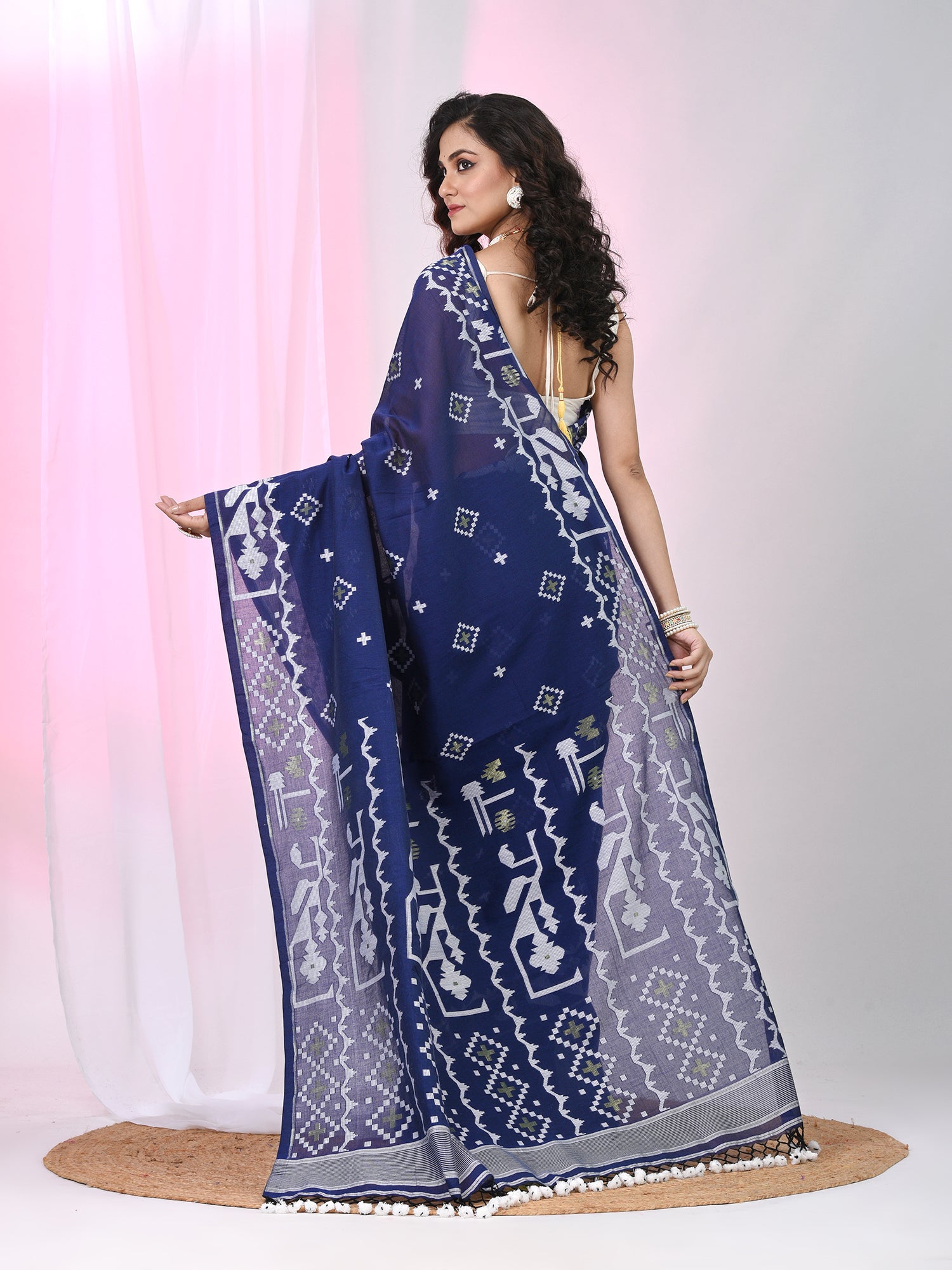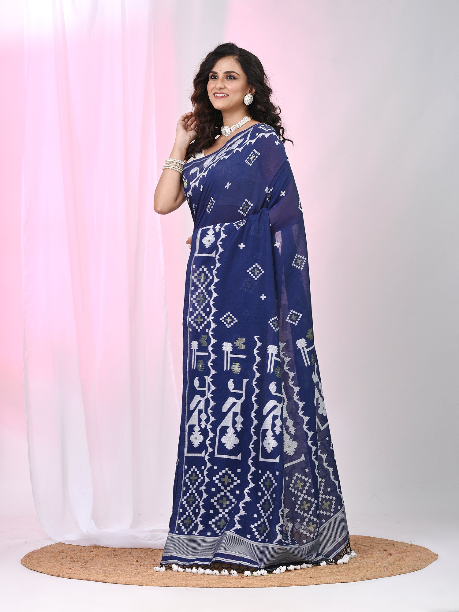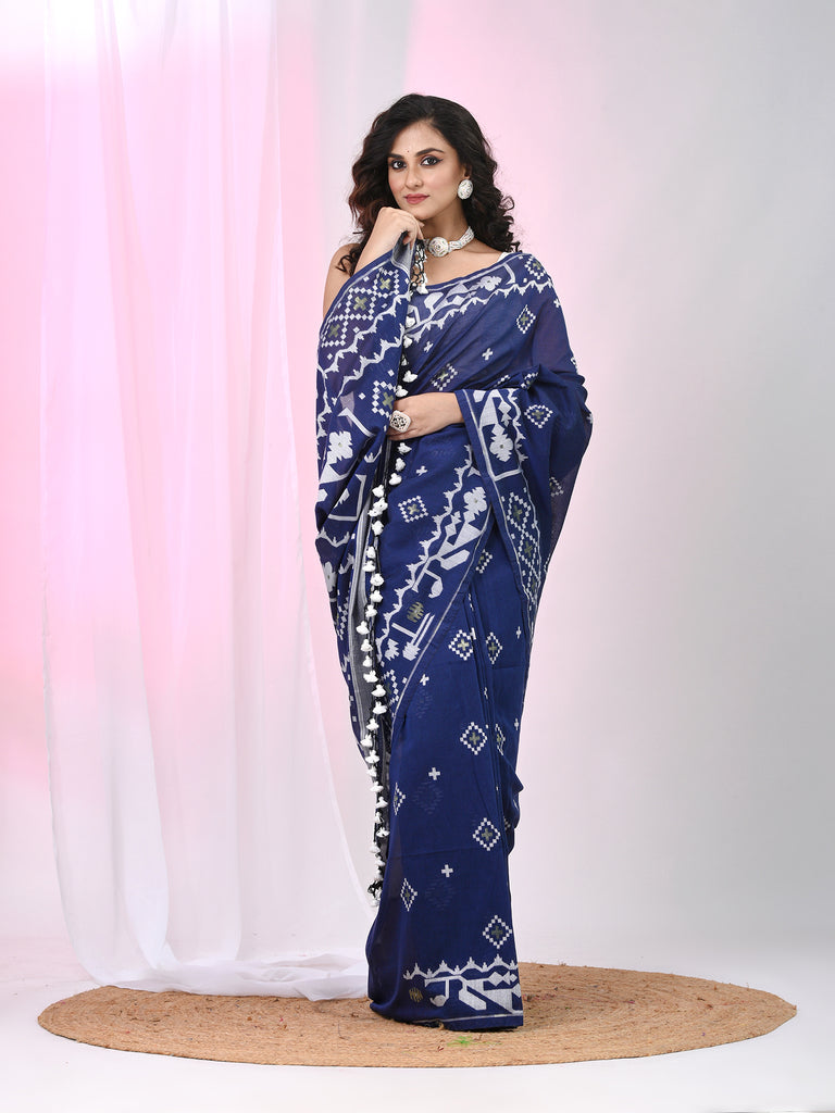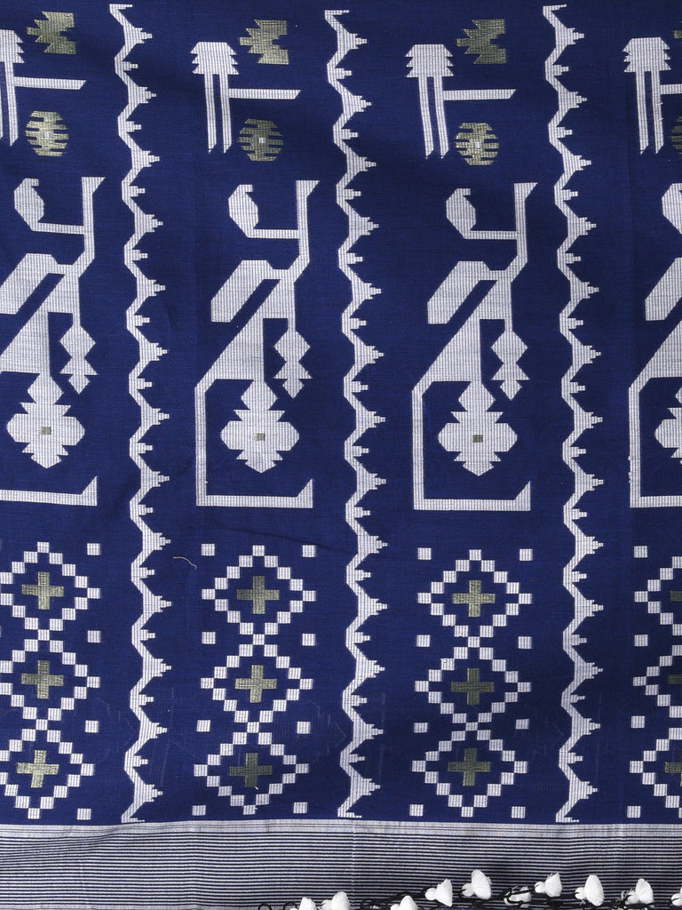 Navy Blue Cotton Saree with Traditional Woven Patterns and Tassel Border