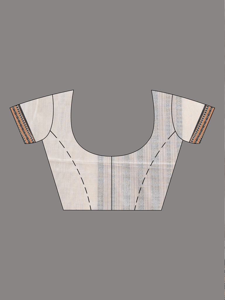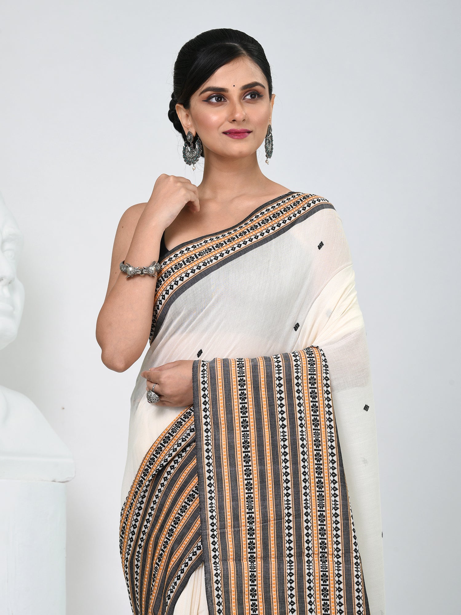 Embrace timeless elegance with this exquisite off white cotton saree, perfect for all occasions. The soft, breathable fabric ensures comfort, while the beautiful, intricately designed striped border adds a modern touch. Subtle dot patterns throughout the saree add depth, making this piece perfect for both festive and everyday wear. Finished with delicate tassels, this saree is a true blend of traditional charm and contemporary style. Pair it with bold or minimal accessories to elevate your look.