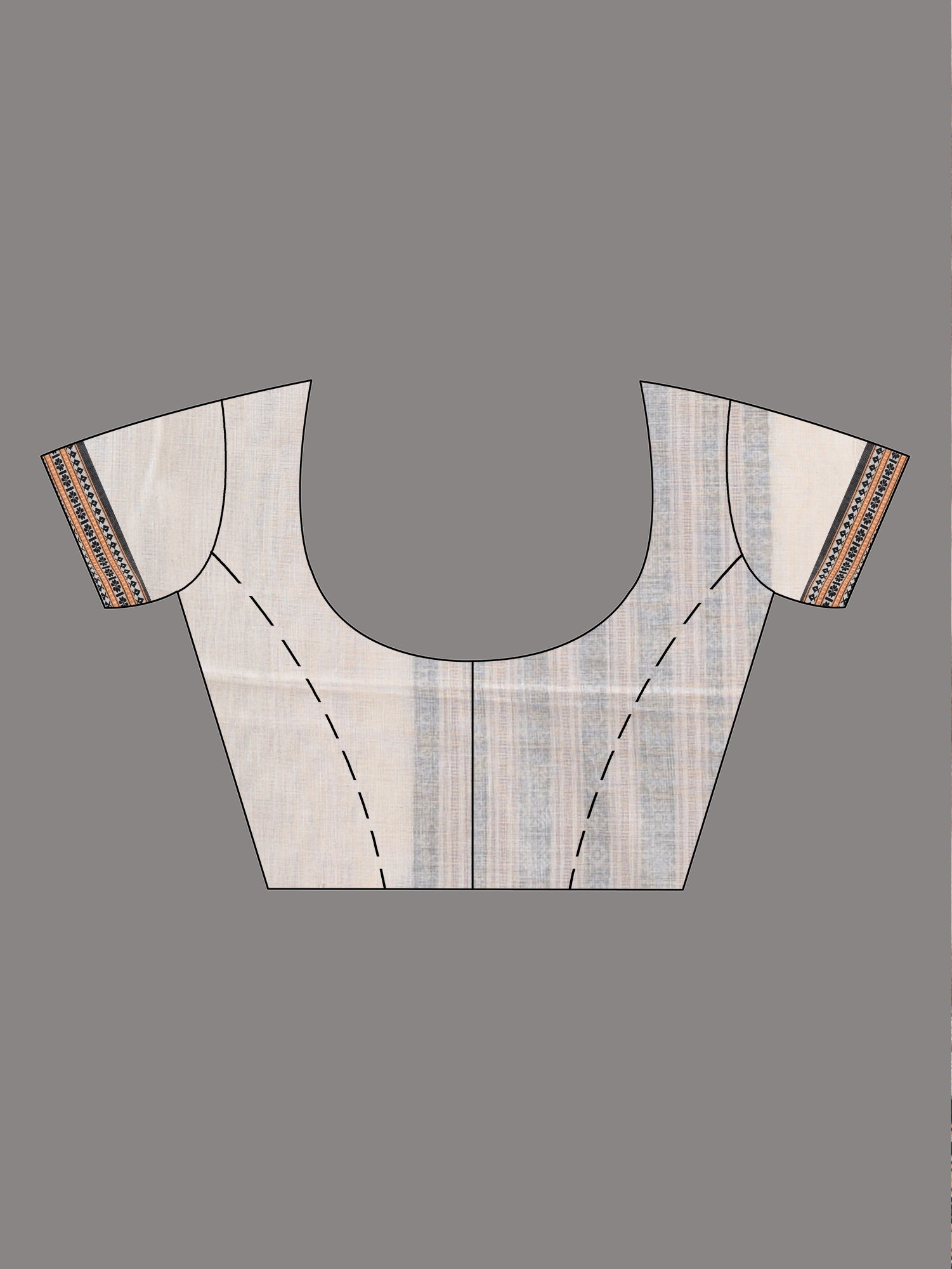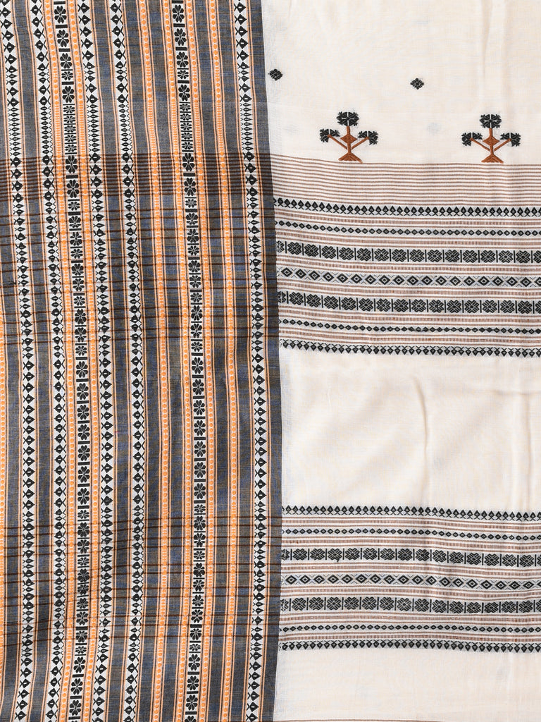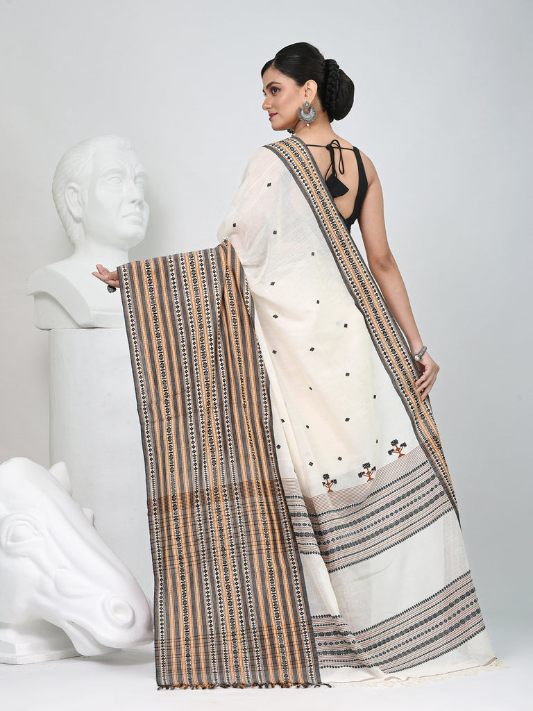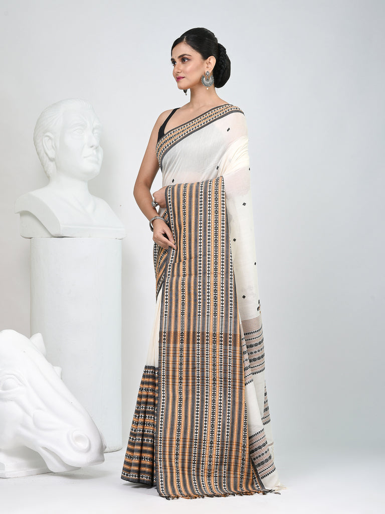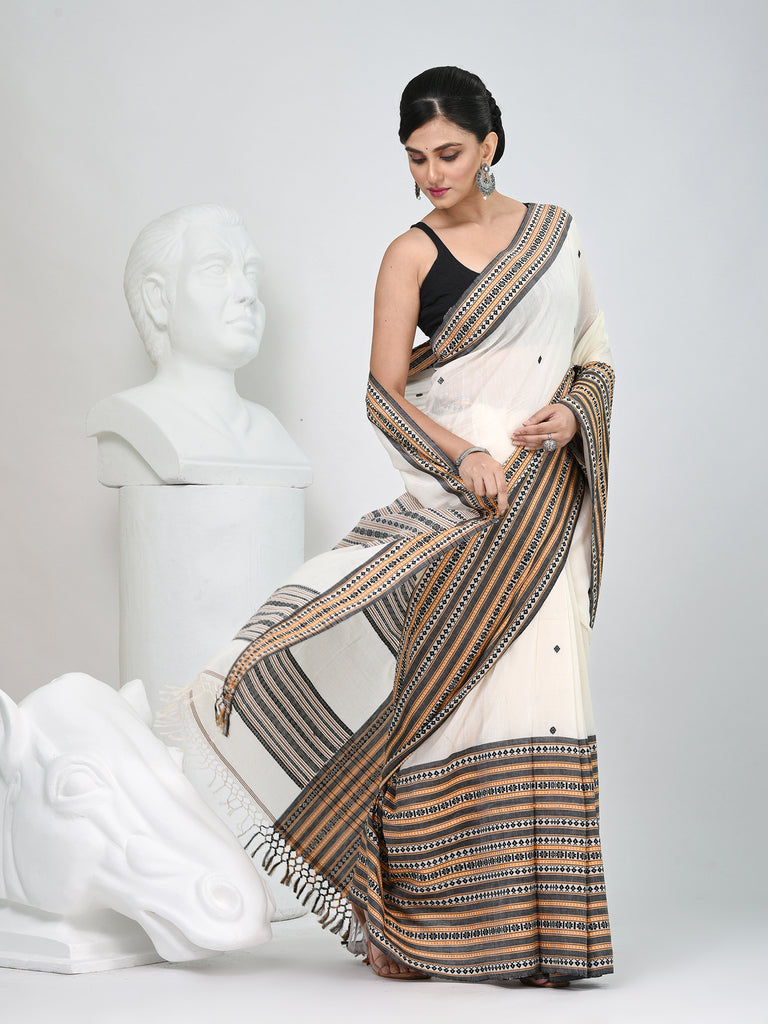 Off White Cotton Saree with Intricate Striped Border and Tassels