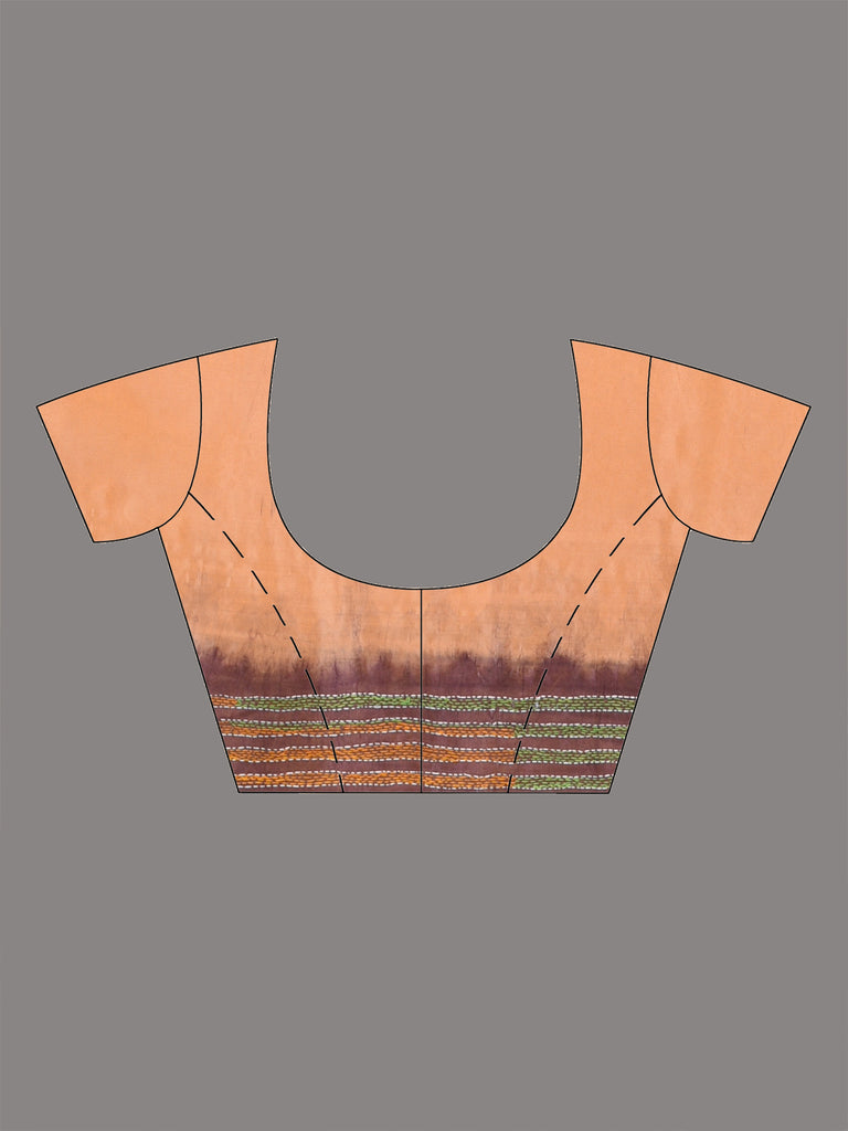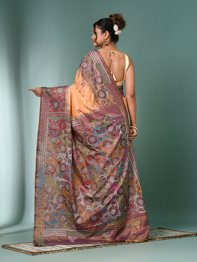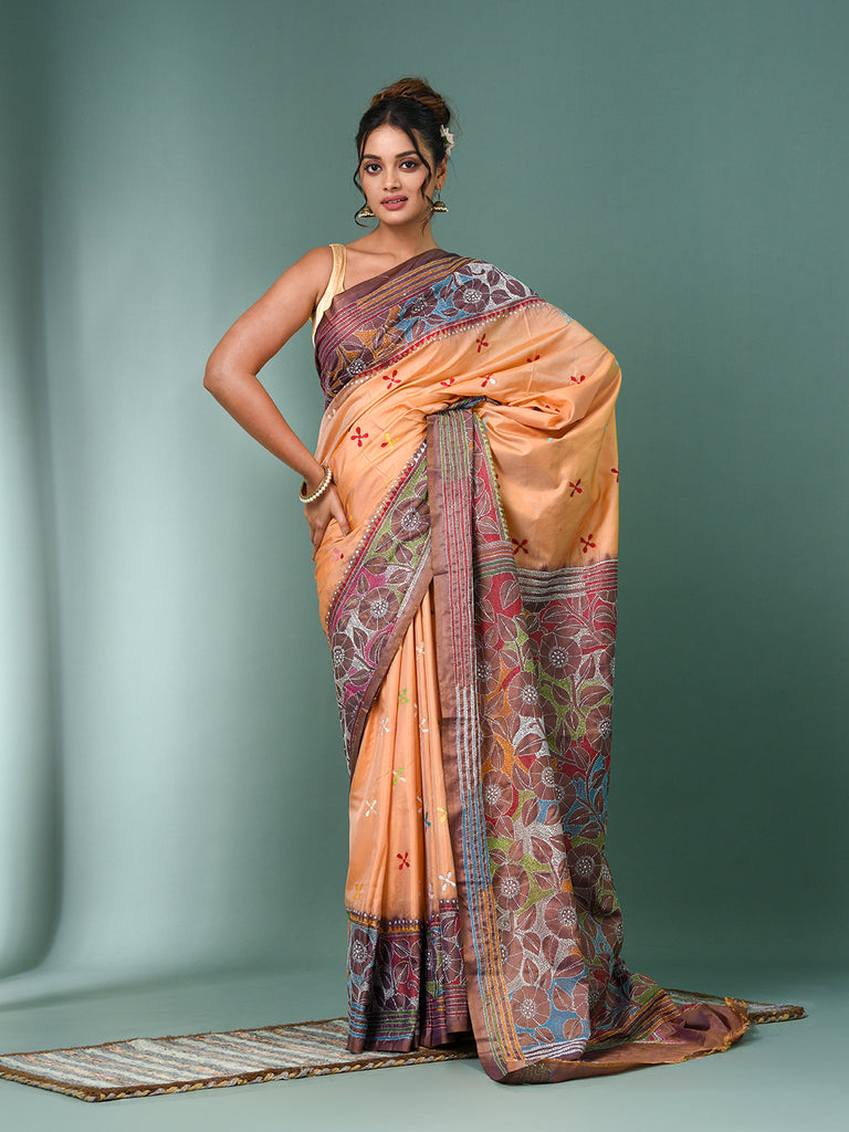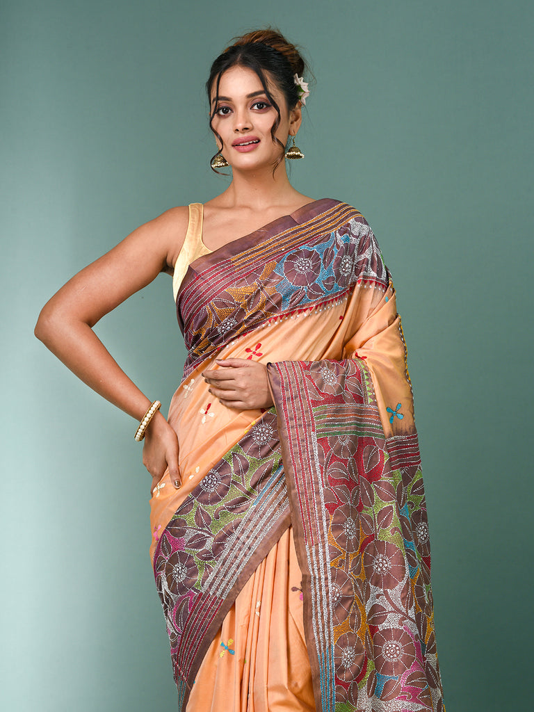 Peach Kantha Stitch Silk Soft Saree