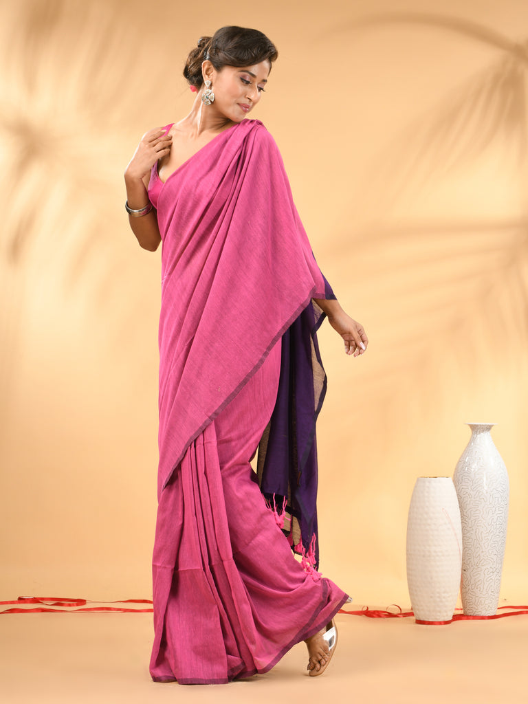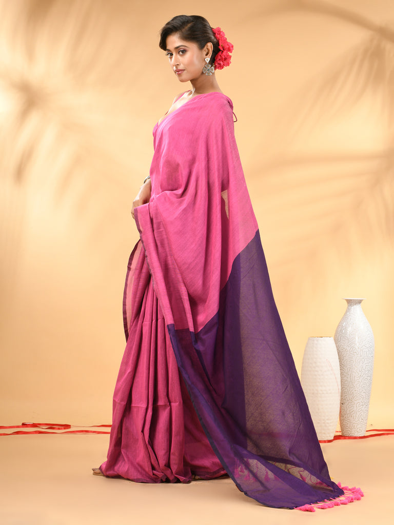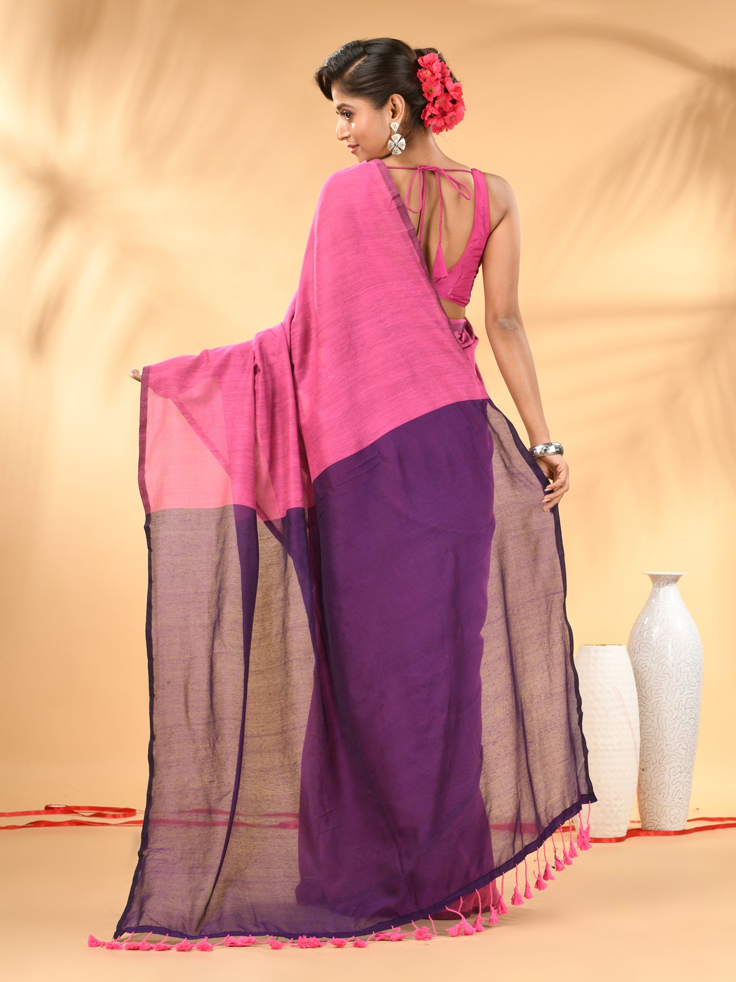 Pink and Purple Cotton Handspun Saree with Tassel Detailing