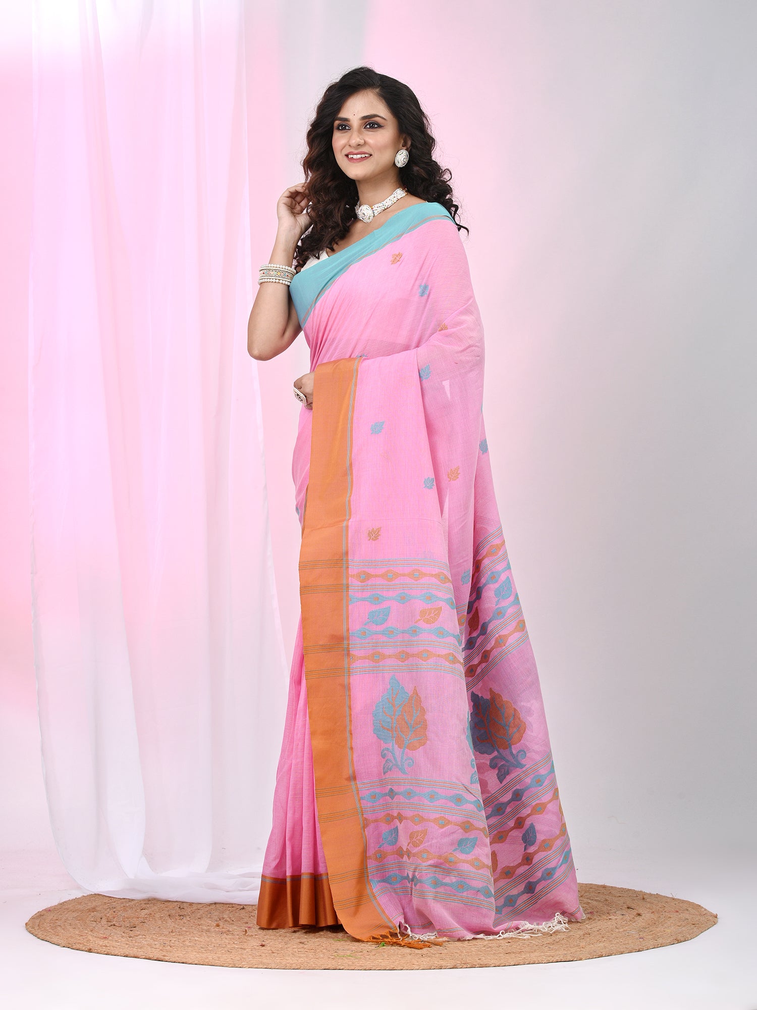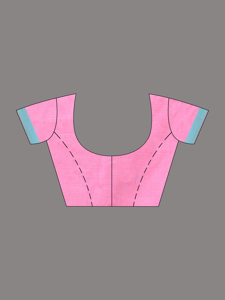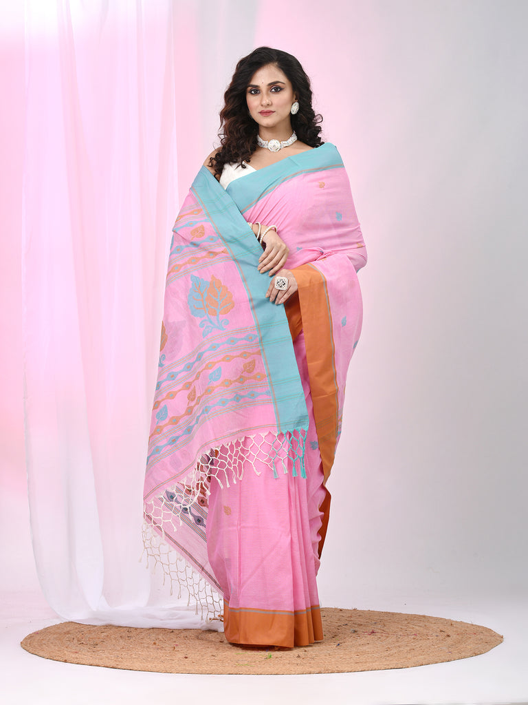 Add charm to your ethnic wardrobe with this elegant pink cotton saree, highlighted with a rich mustard border and contrasting blue pallu accent. The saree features woven leaf motifs and patterned detailing that bring out a graceful traditional appeal. Crafted from breathable cotton, it drapes effortlessly and ensures comfort throughout the day. Perfect for festive occasions, cultural gatherings, and office wear, this saree blends classic elegance with modern style.