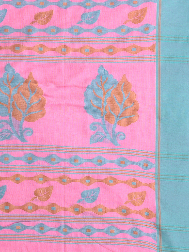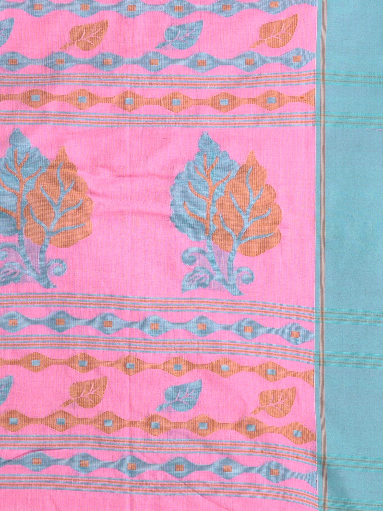 Pink Cotton Leaf Motifs Saree with Mastard And Blue Border