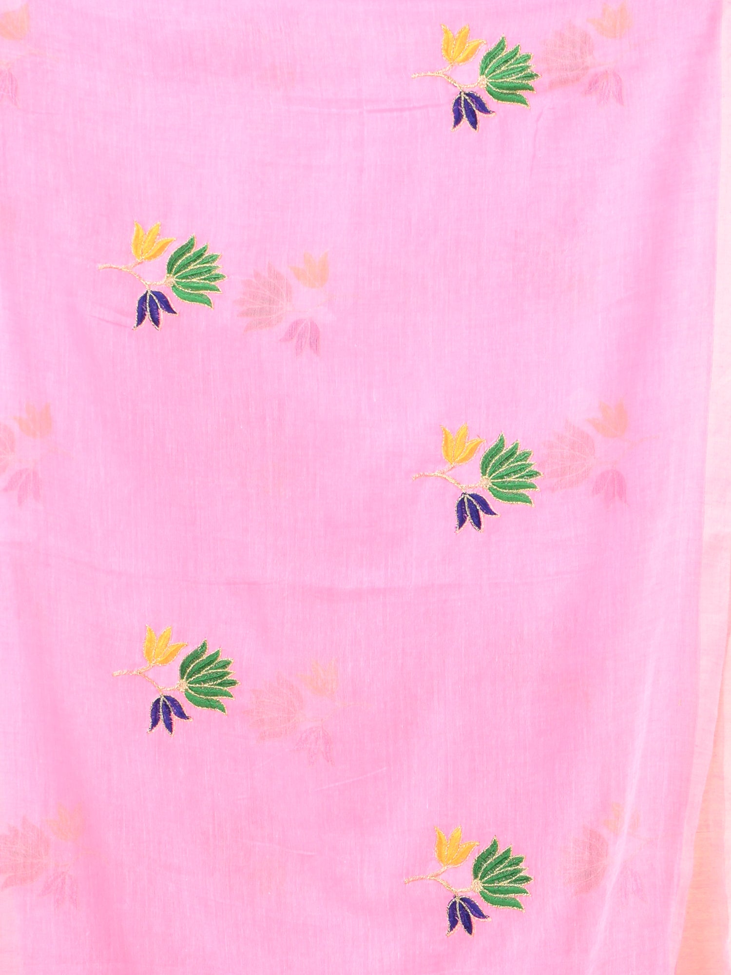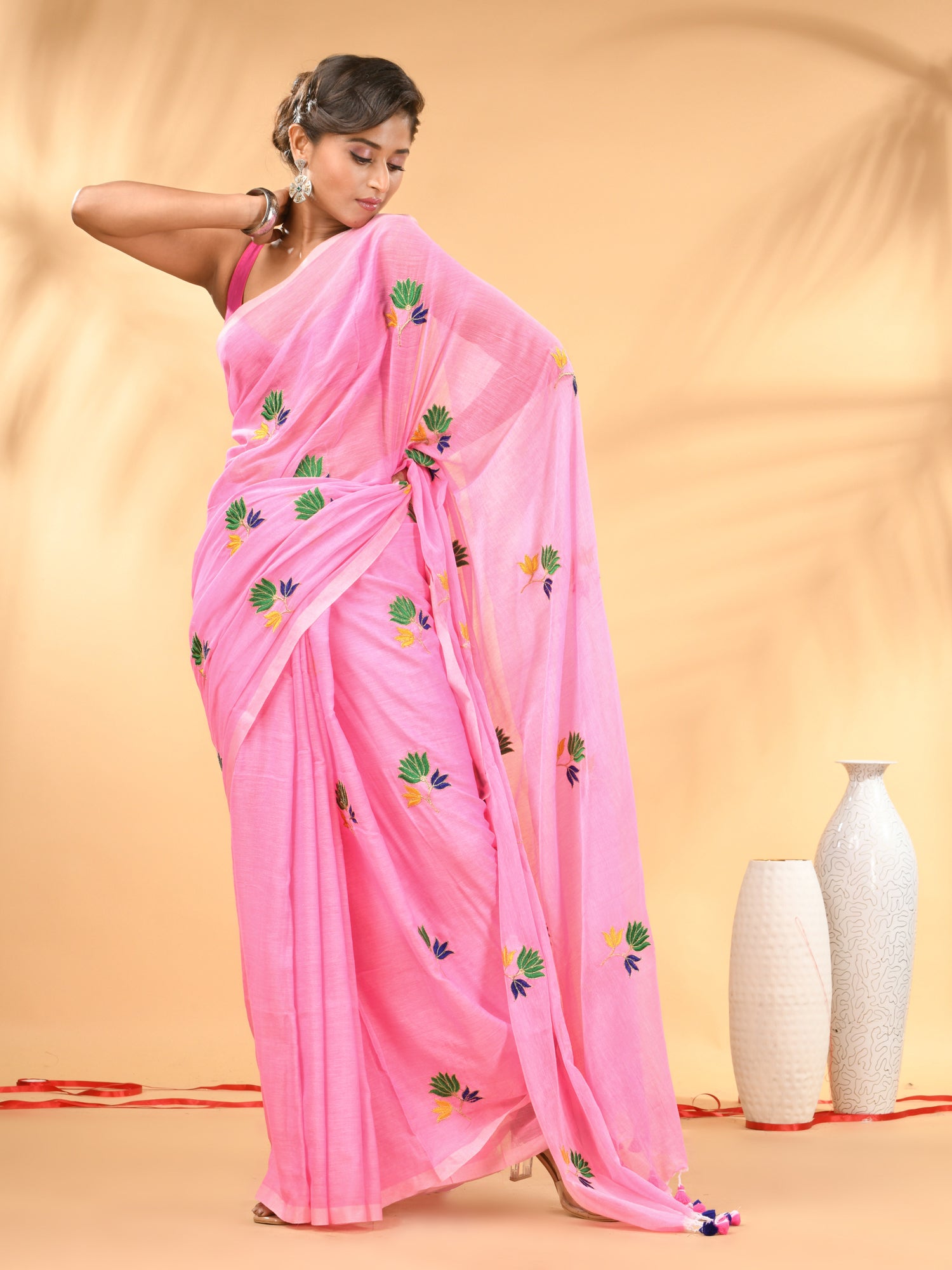 Pink Mulmul Cotton Saree with Floral Embroidery and Tassel Detailing