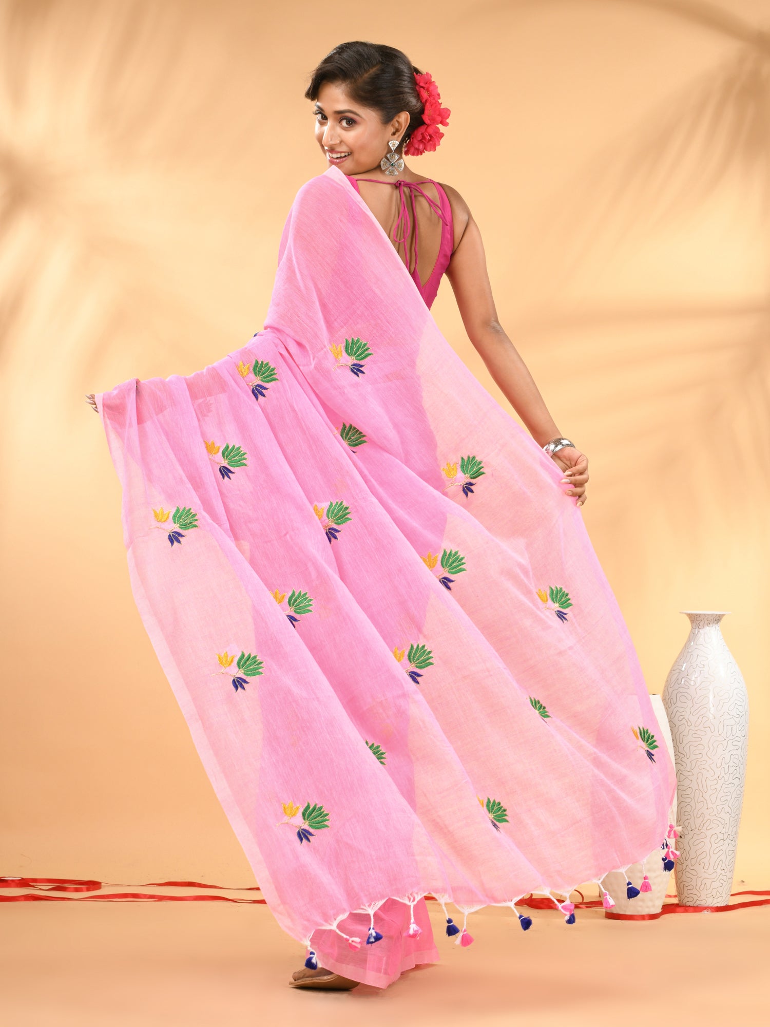Embrace elegance and comfort with this stunning pink mulmul cotton saree, perfect for any casual or festive occasion. The soft and breathable mulmul fabric offers a light and airy feel, making it a perfect choice for warmer climates. The saree is beautifully adorned with vibrant floral embroidery, giving it a refreshing, lively look. The saree’s edges are embellished with charming tassel detailing, adding a playful and chic touch to the overall design. This saree is ideal for those looking to combine tradition with a contemporary flair.