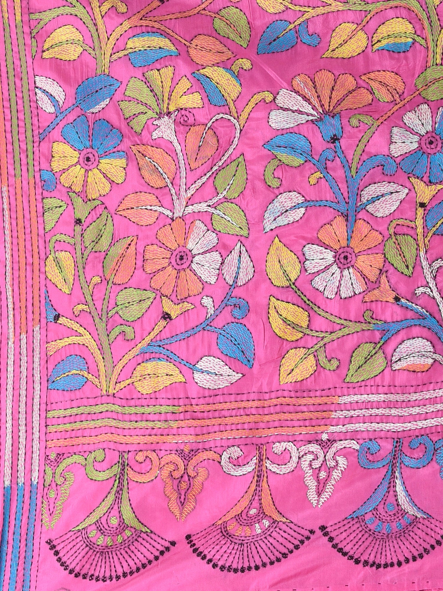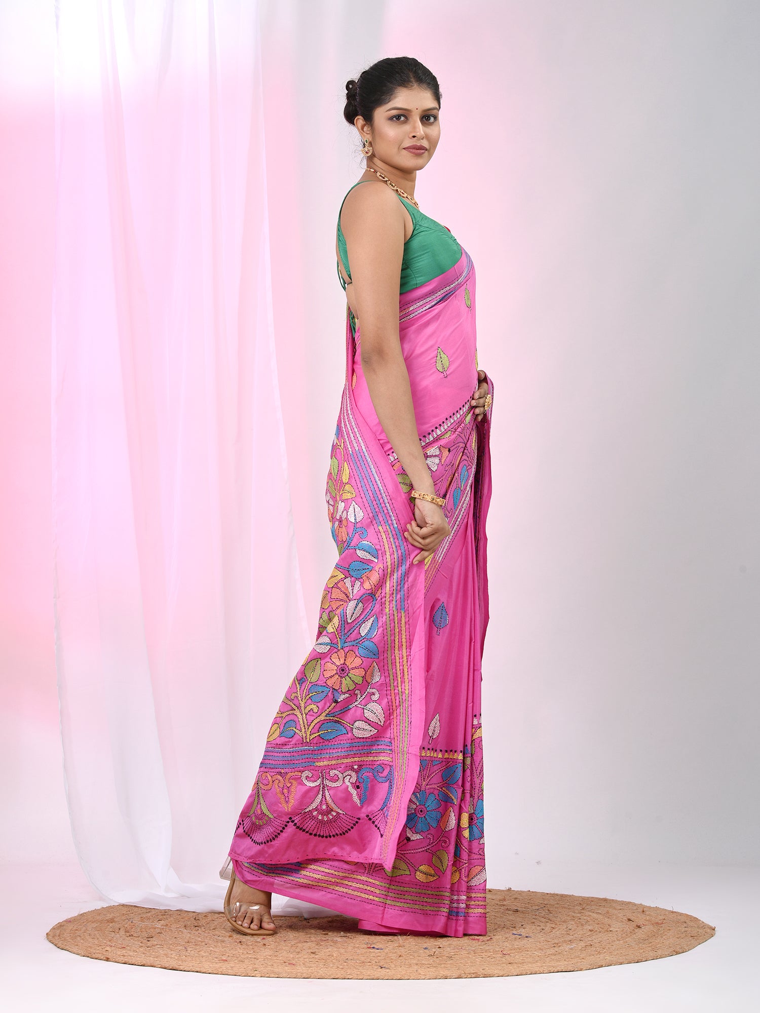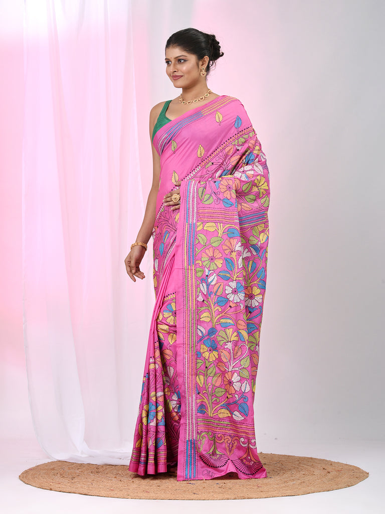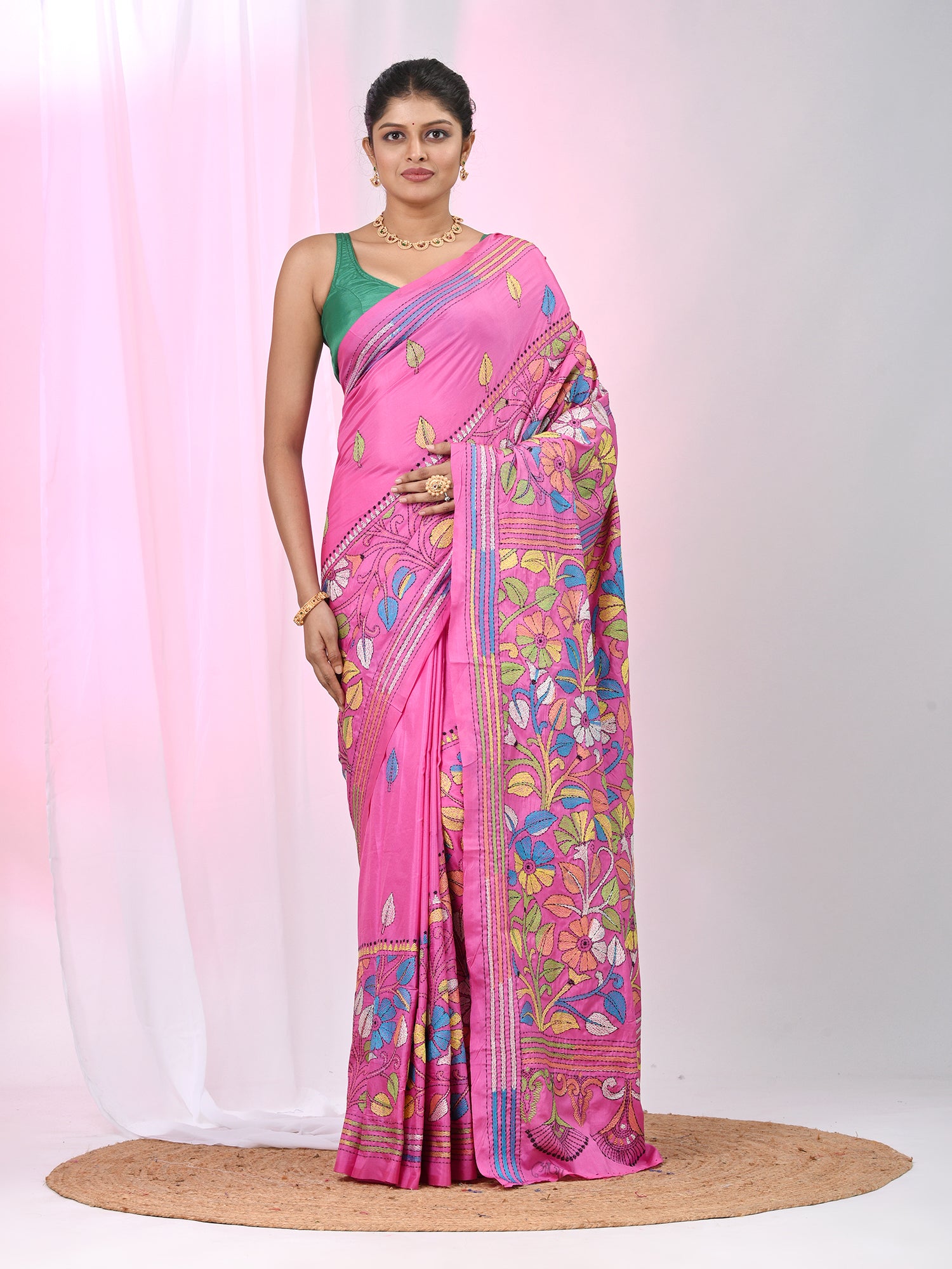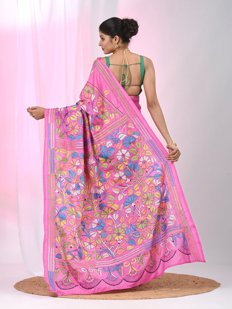 Pink Silk Kantha Stitch Saree with Multicolor Thread Work