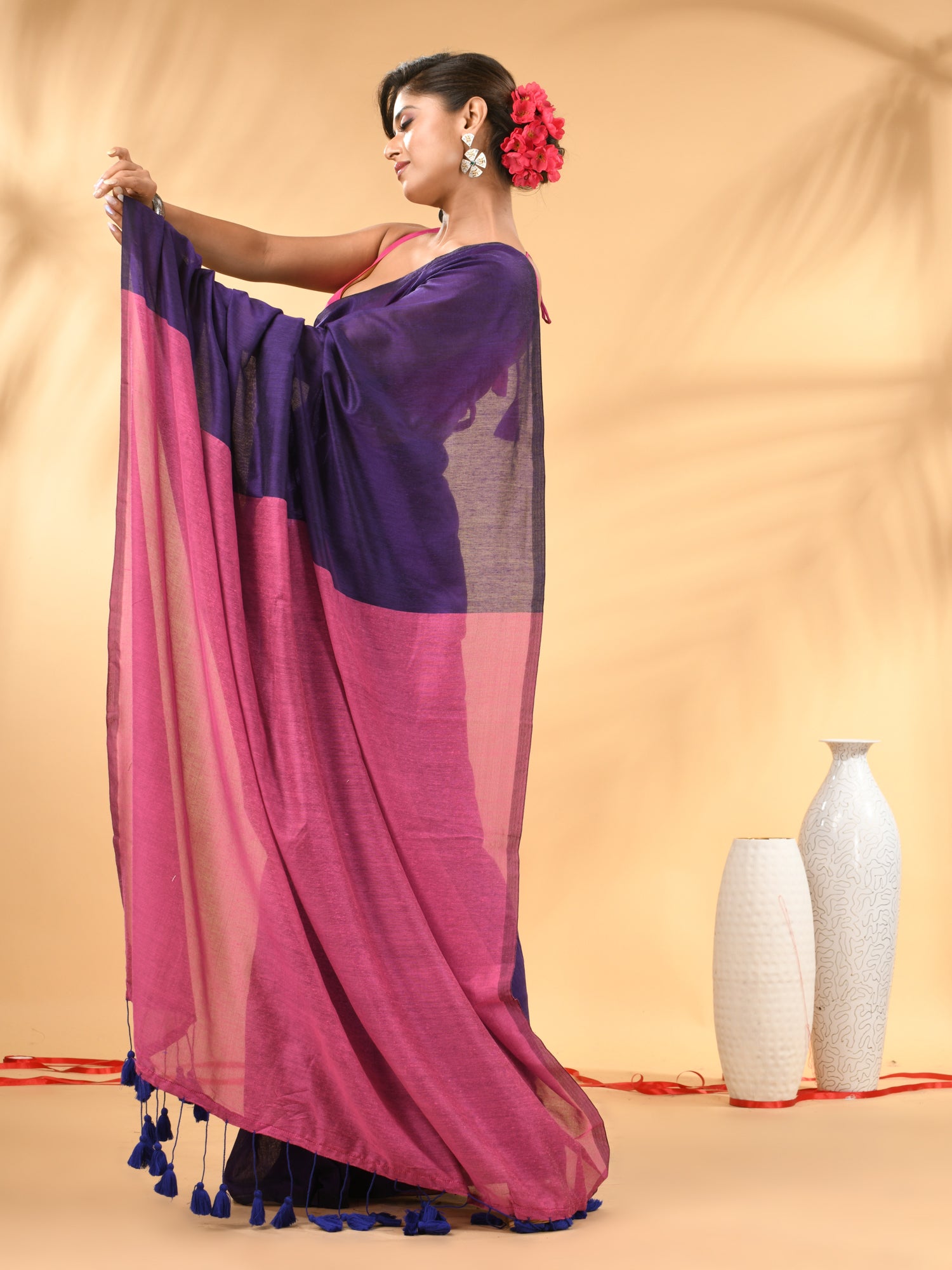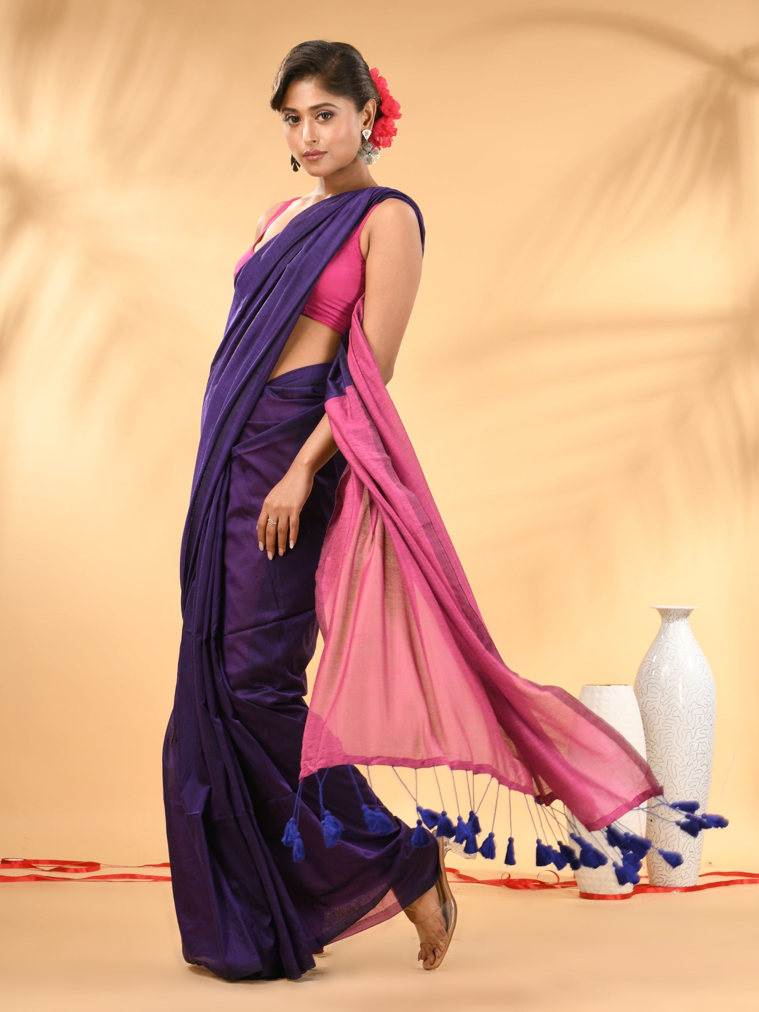 Purple And Pink Cotton Handspun Saree with Tassel Detailing