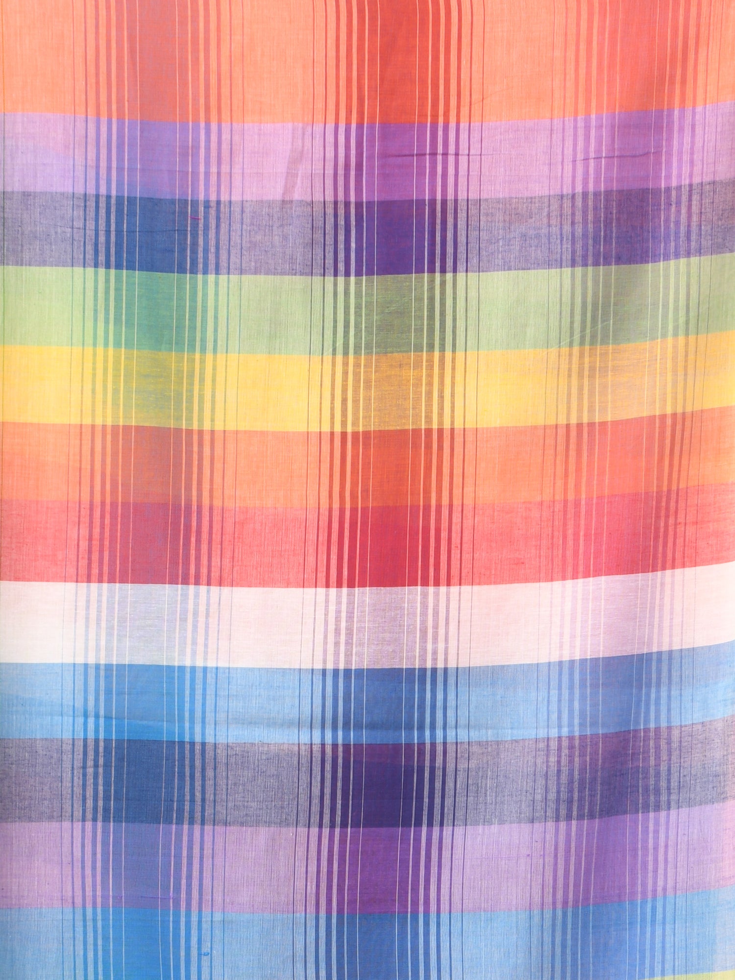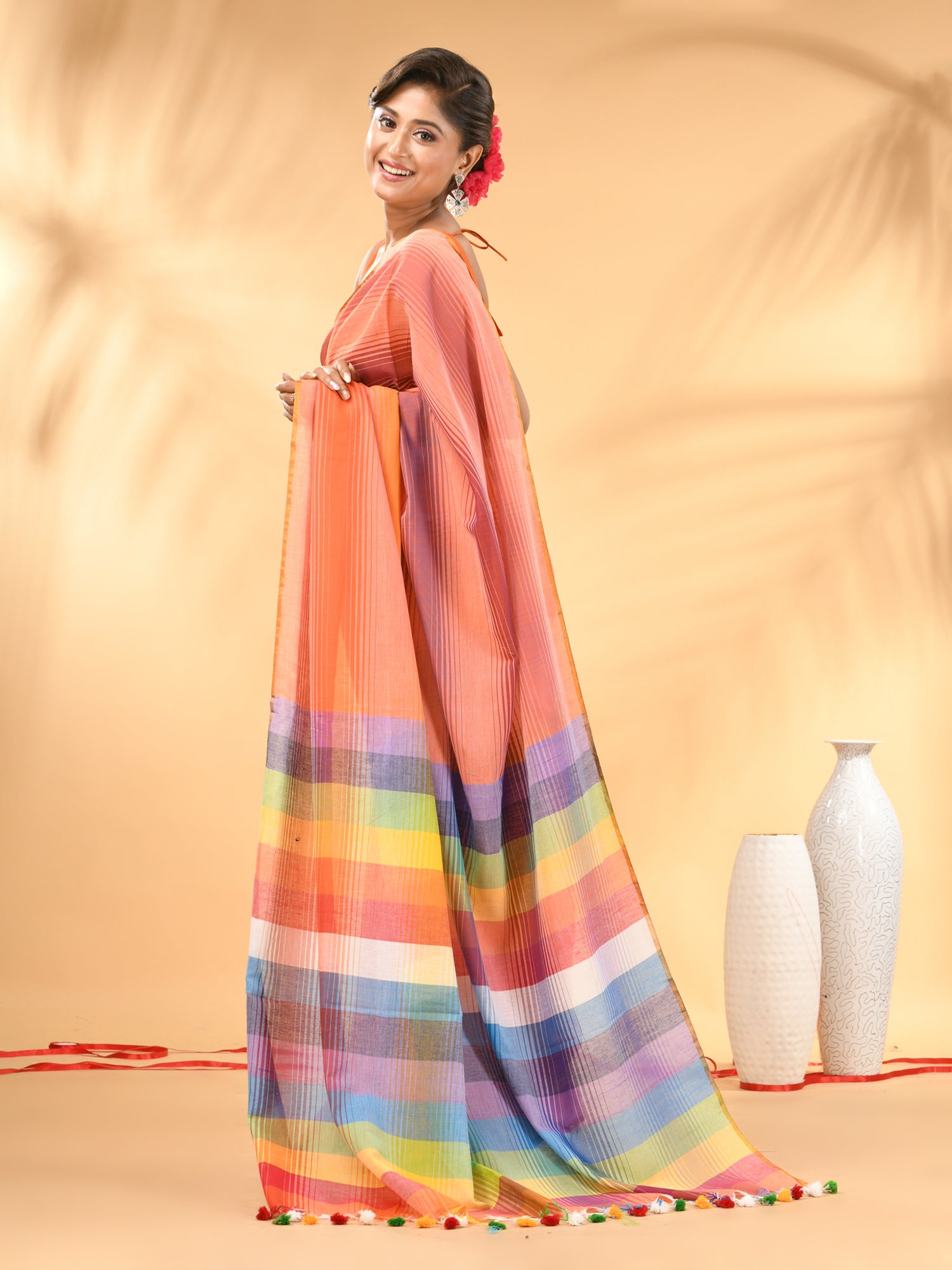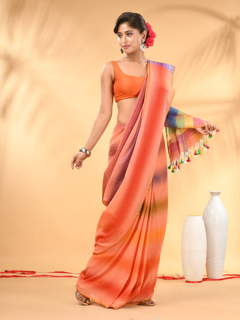 Rainbow Stripes Peach Mulmul Cotton Saree with Tassel Border