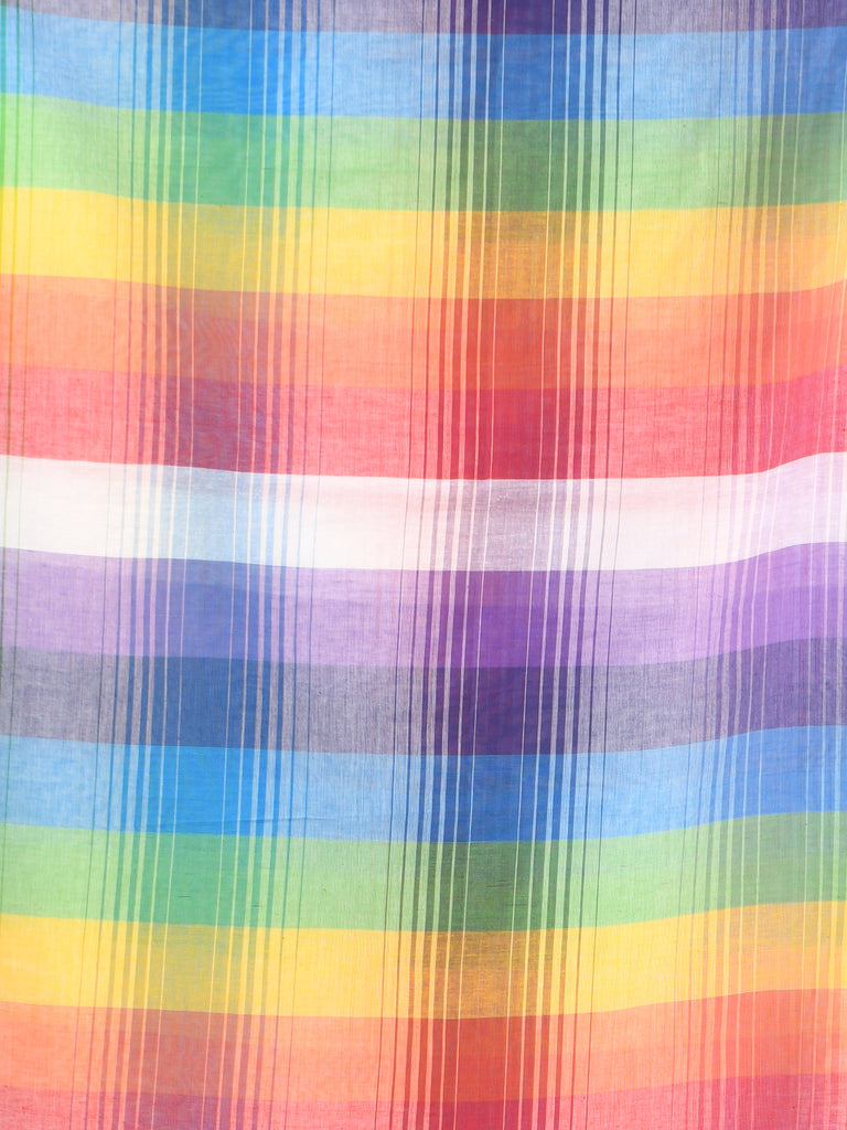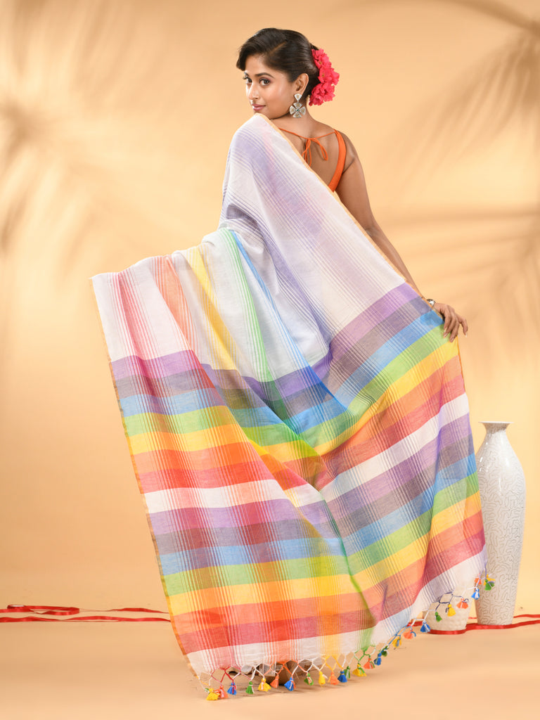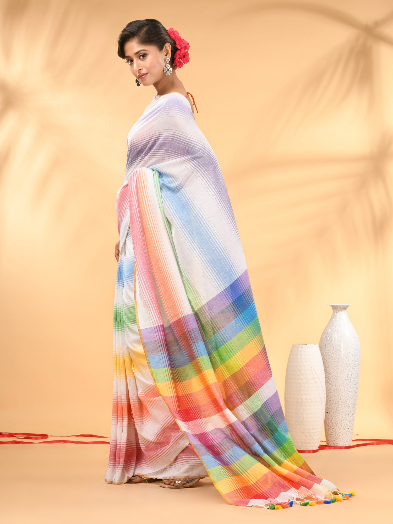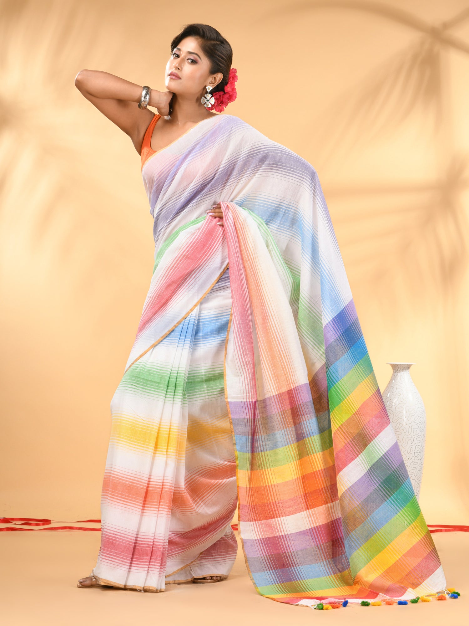 Rainbow Stripes White Mulmul Cotton Saree with Tassel Border