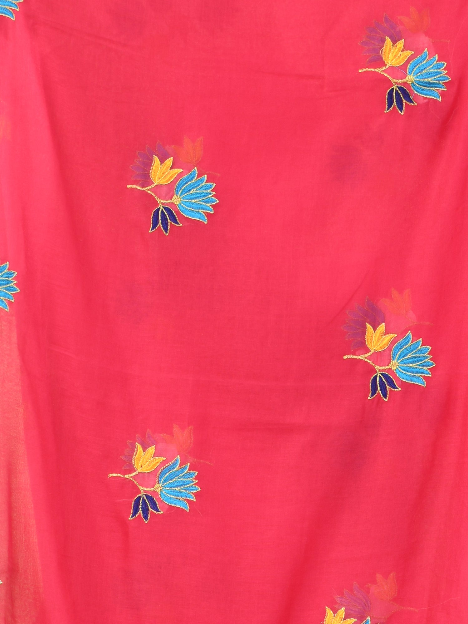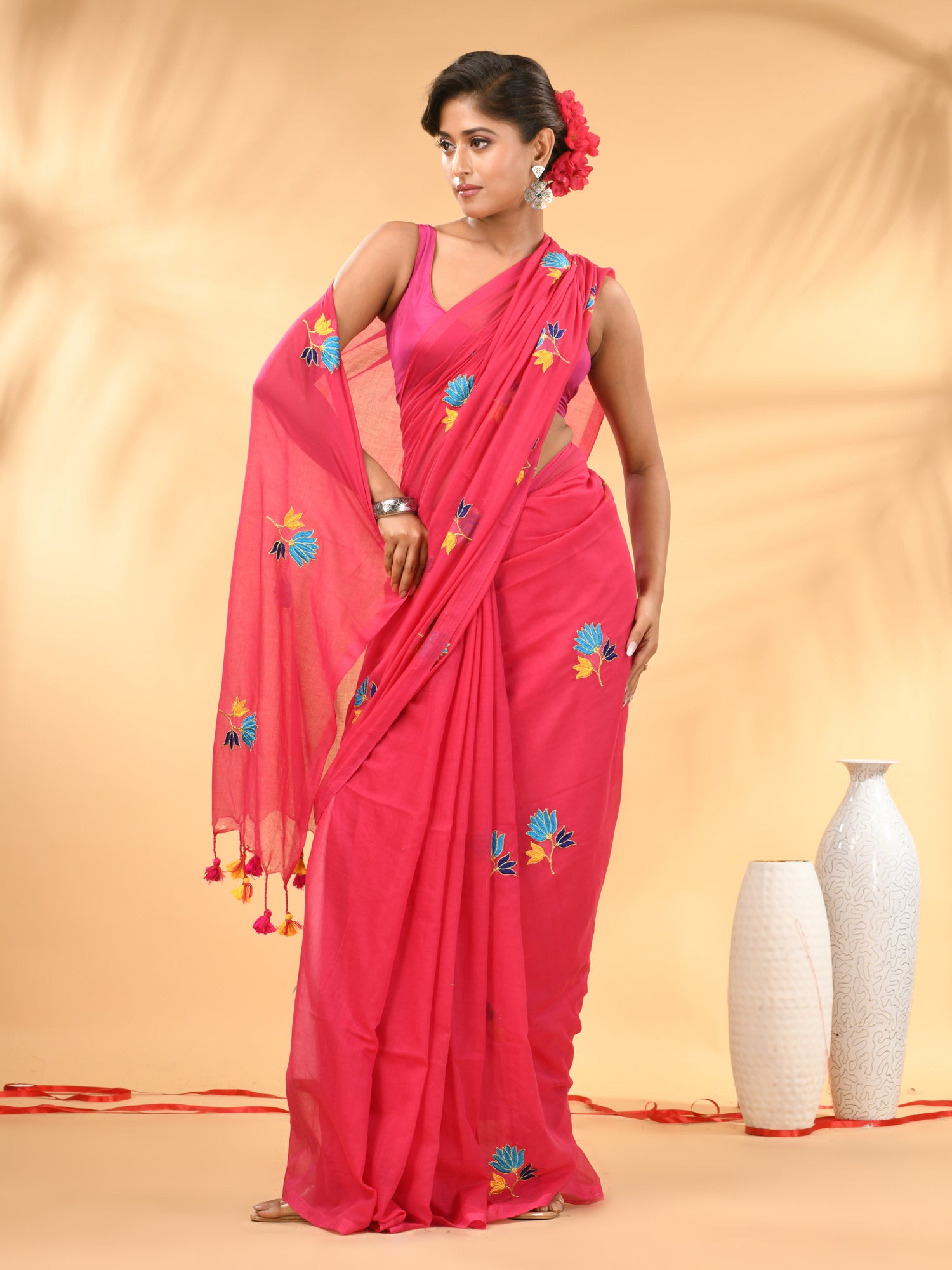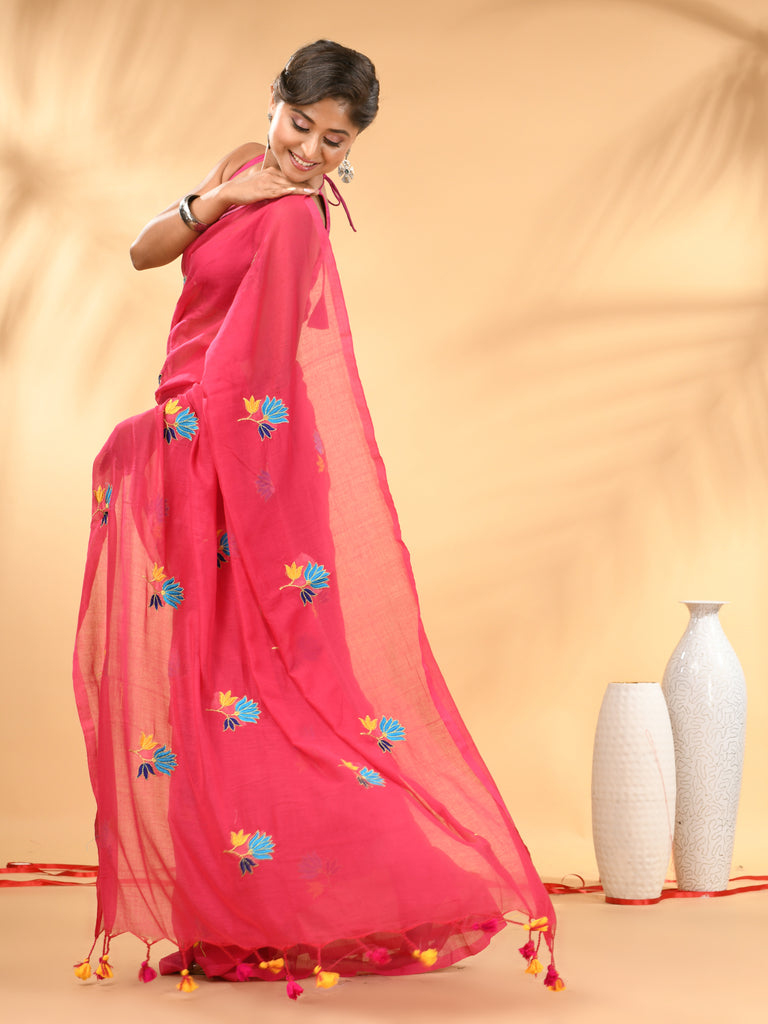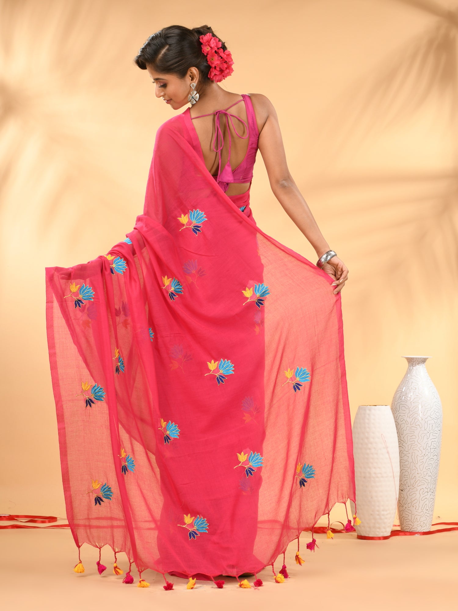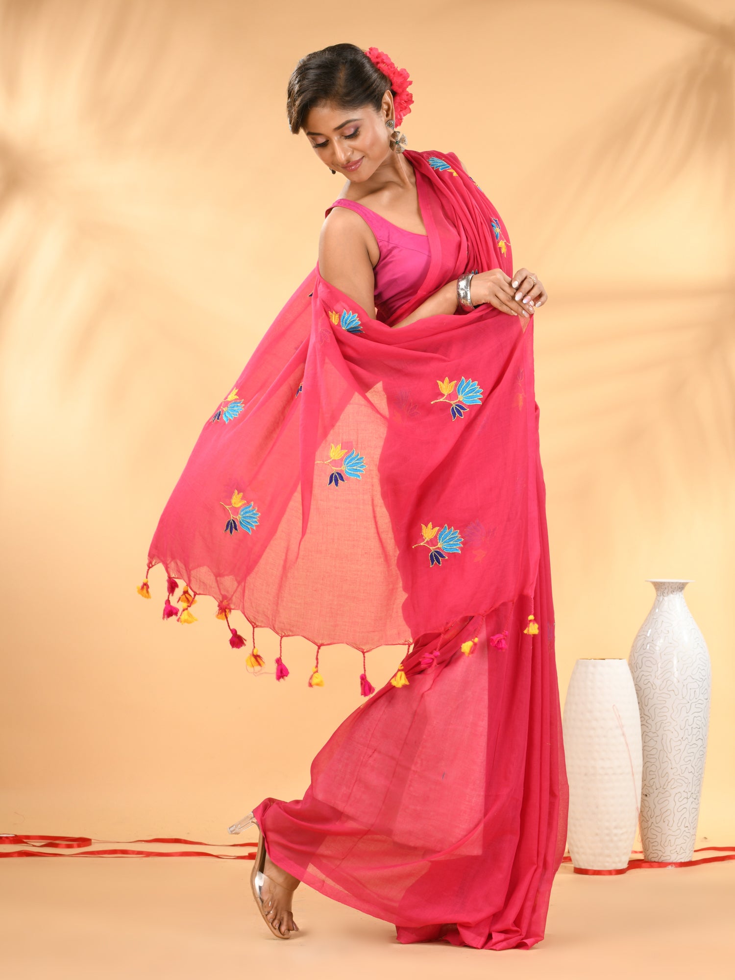 Rani Pink Mulmul Cotton Saree with Floral Embroidery and Tassel Detailing