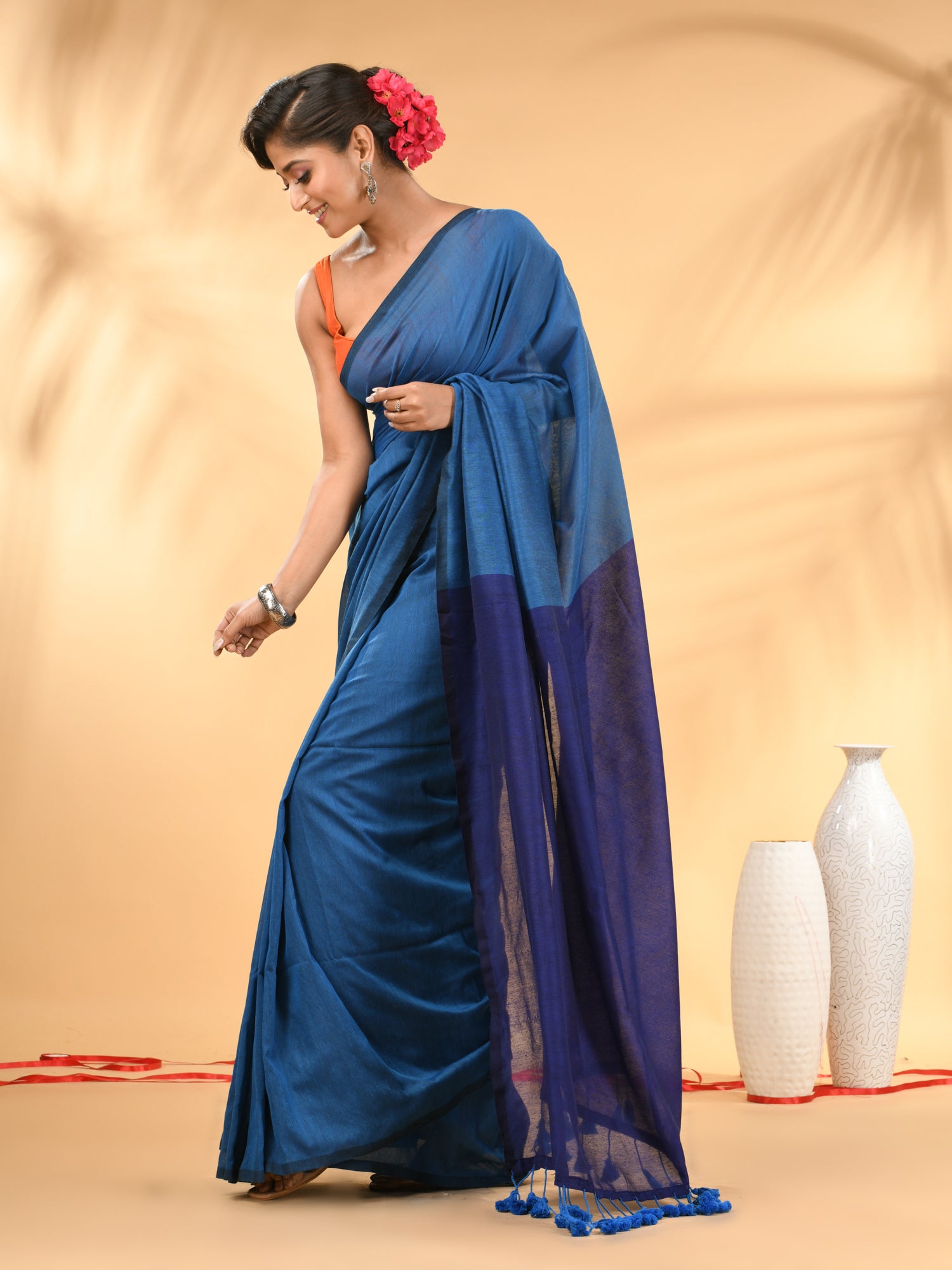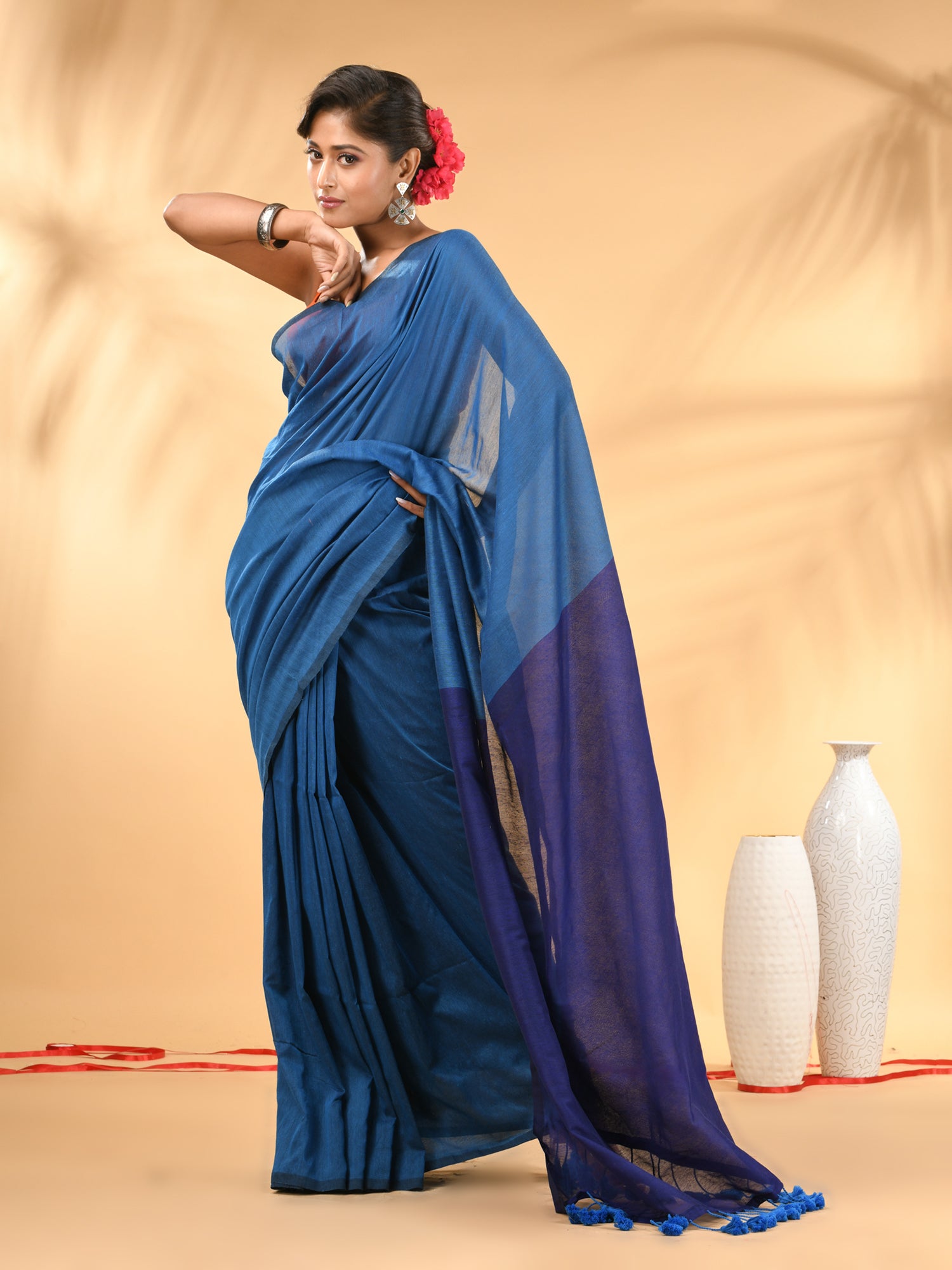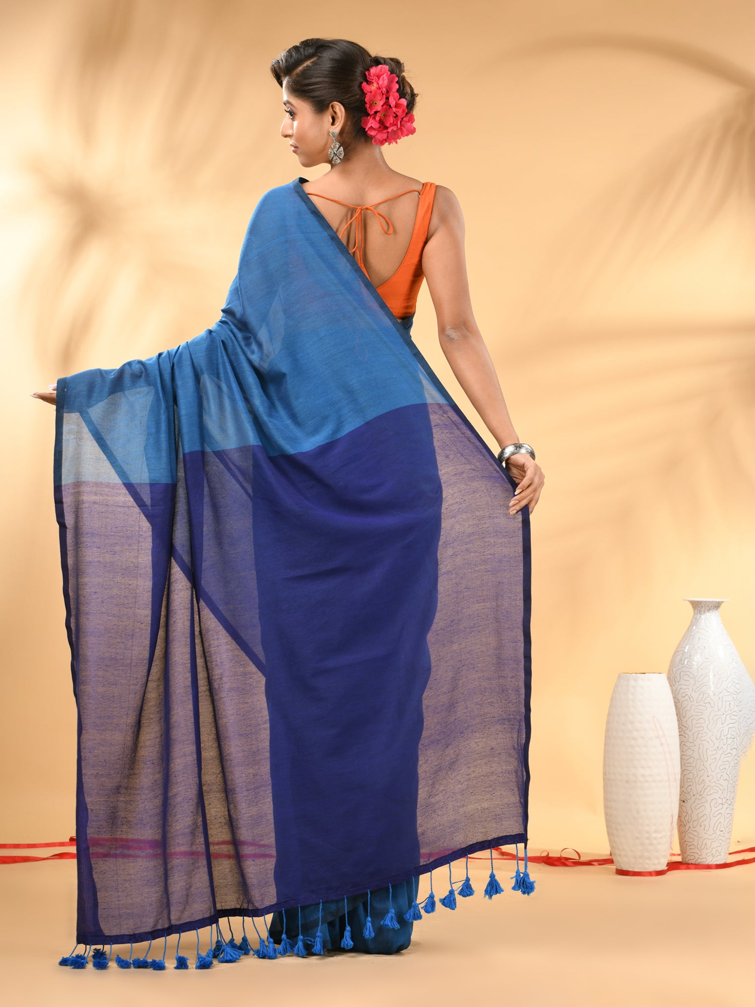 Celebrate timeless elegance with this beautifully crafted cotton handspun saree, designed to elevate your wardrobe. The saree features a stunning combination of sapphire blue and blue hues, seamlessly blending contemporary style with traditional charm. Its lightweight, breathable cotton handspun fabric ensures comfort all day long, making it perfect for both festive occasions and daily wear. The saree is adorned with delicate tassel detailing on the edges, adding a touch of sophistication. Pair it with traditional jewelry for a complete look.