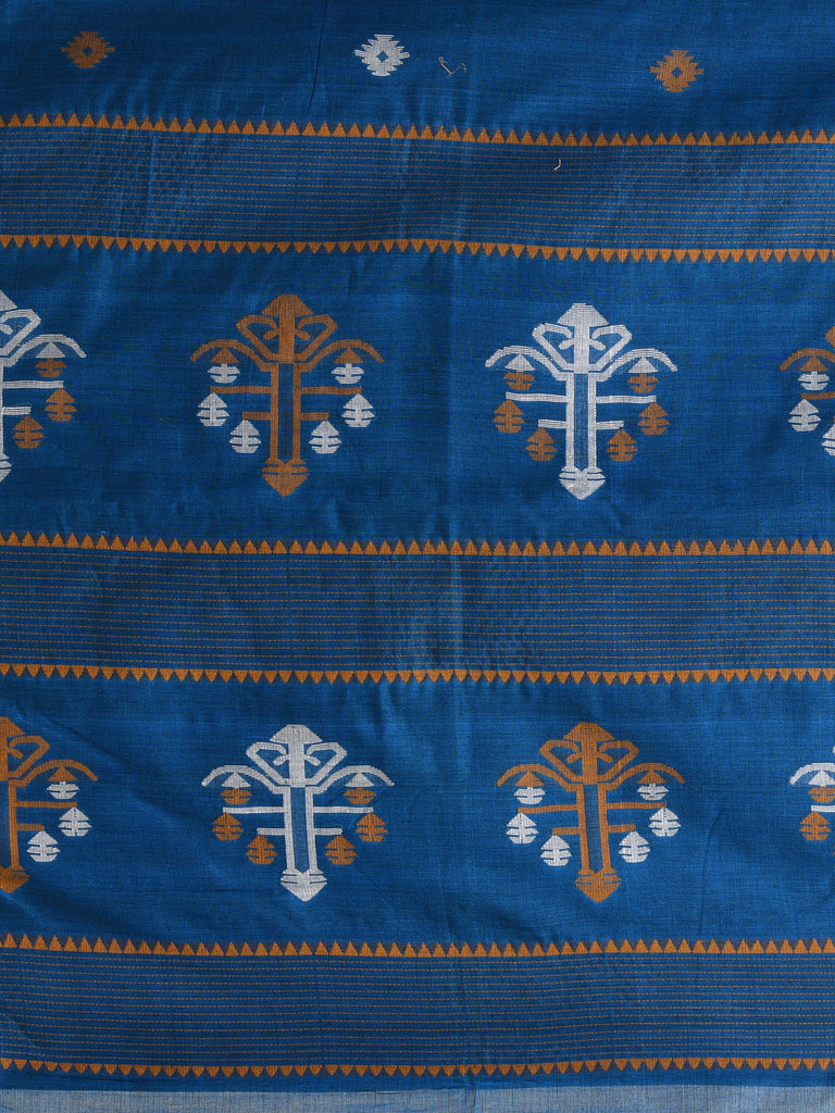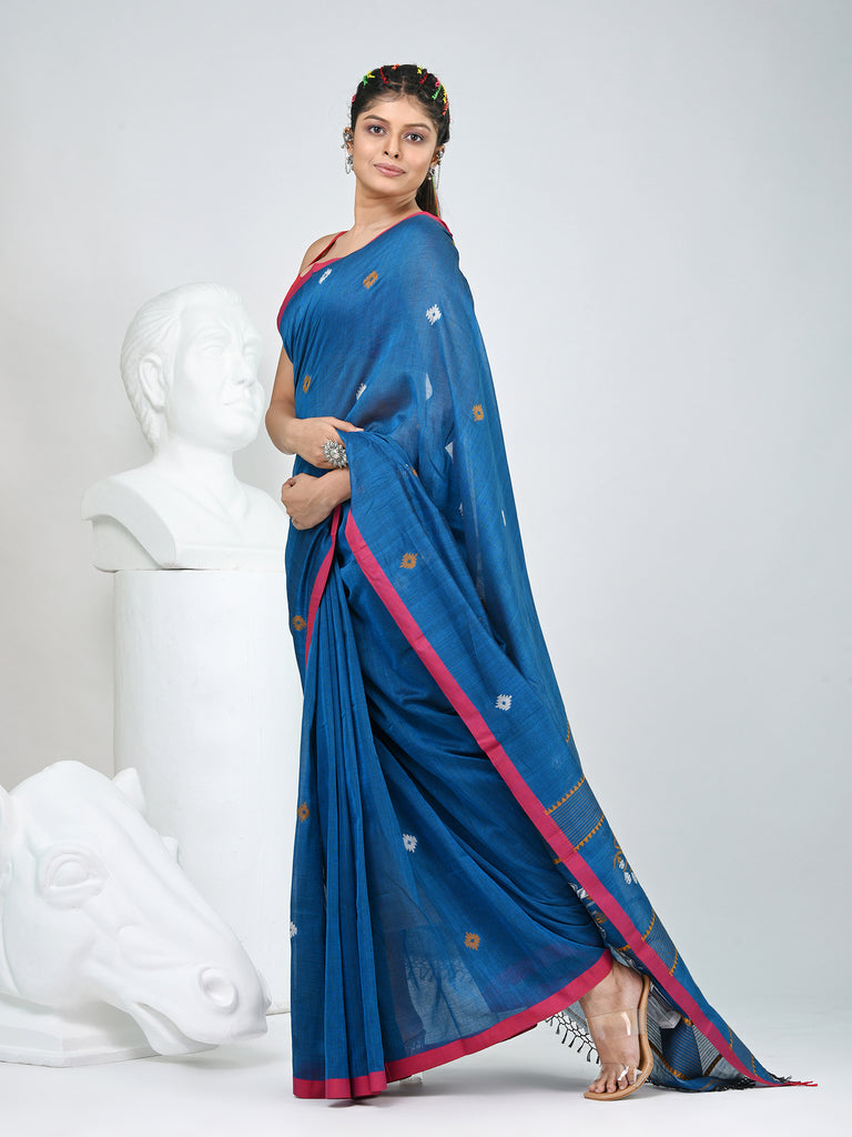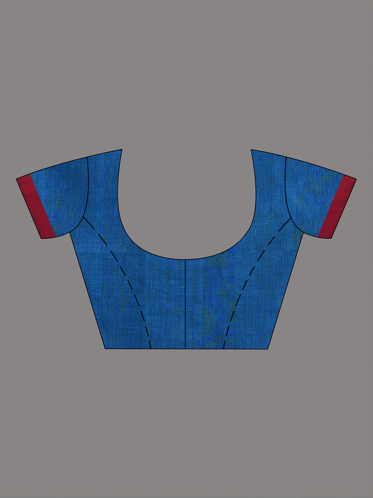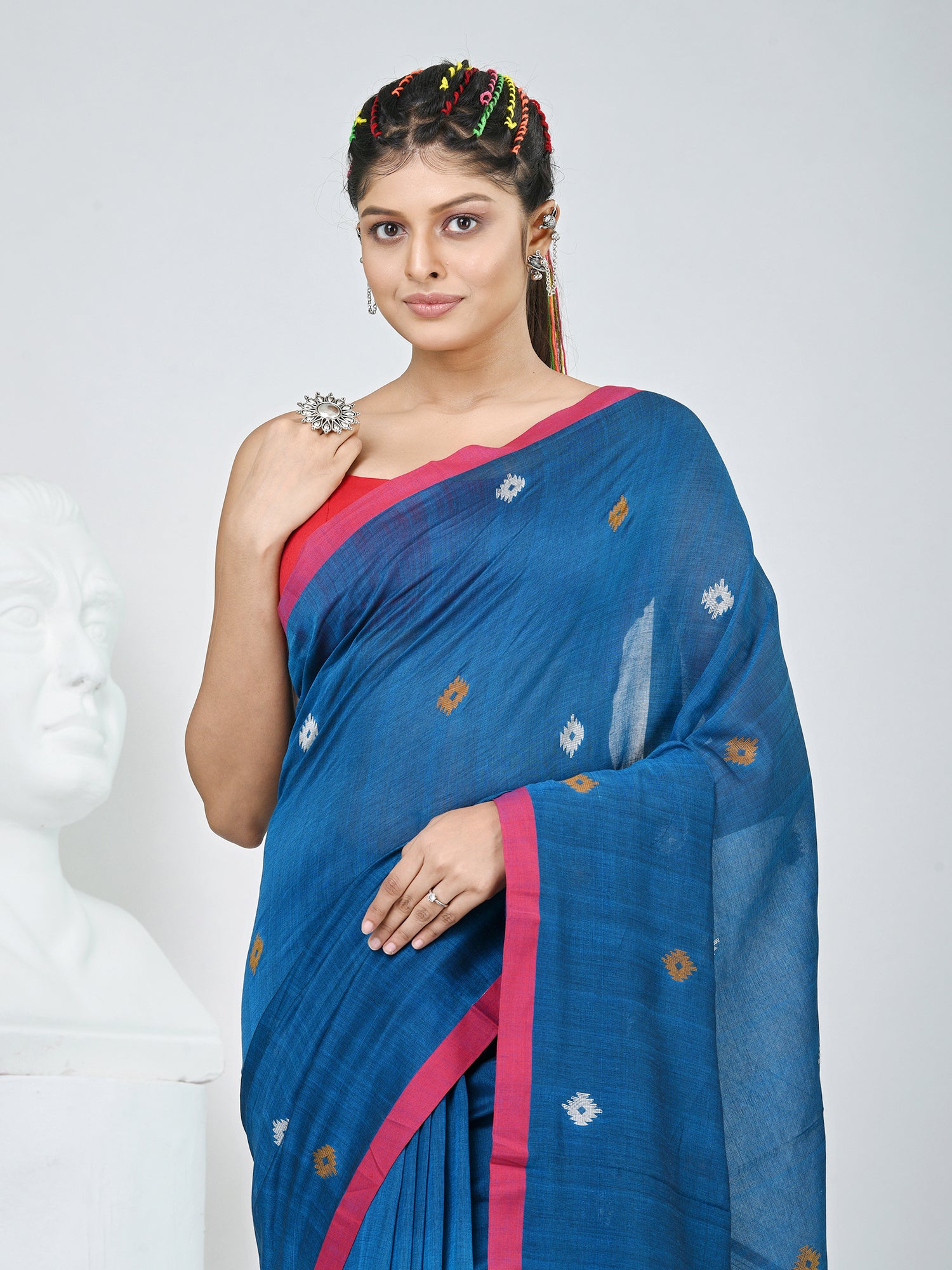 Bring elegance and tradition to your wardrobe with this beautiful sapphire blue handwoven cotton saree, accentuated by a charming pink border. The saree is adorned with intricate woven motifs in subtle geometric and floral-inspired patterns, showcasing fine craftsmanship. Made from pure handwoven cotton, it is soft, breathable, and comfortable for all-day wear. Perfect for festive occasions, office gatherings, and cultural celebrations, this saree blends timeless tradition with effortless style.