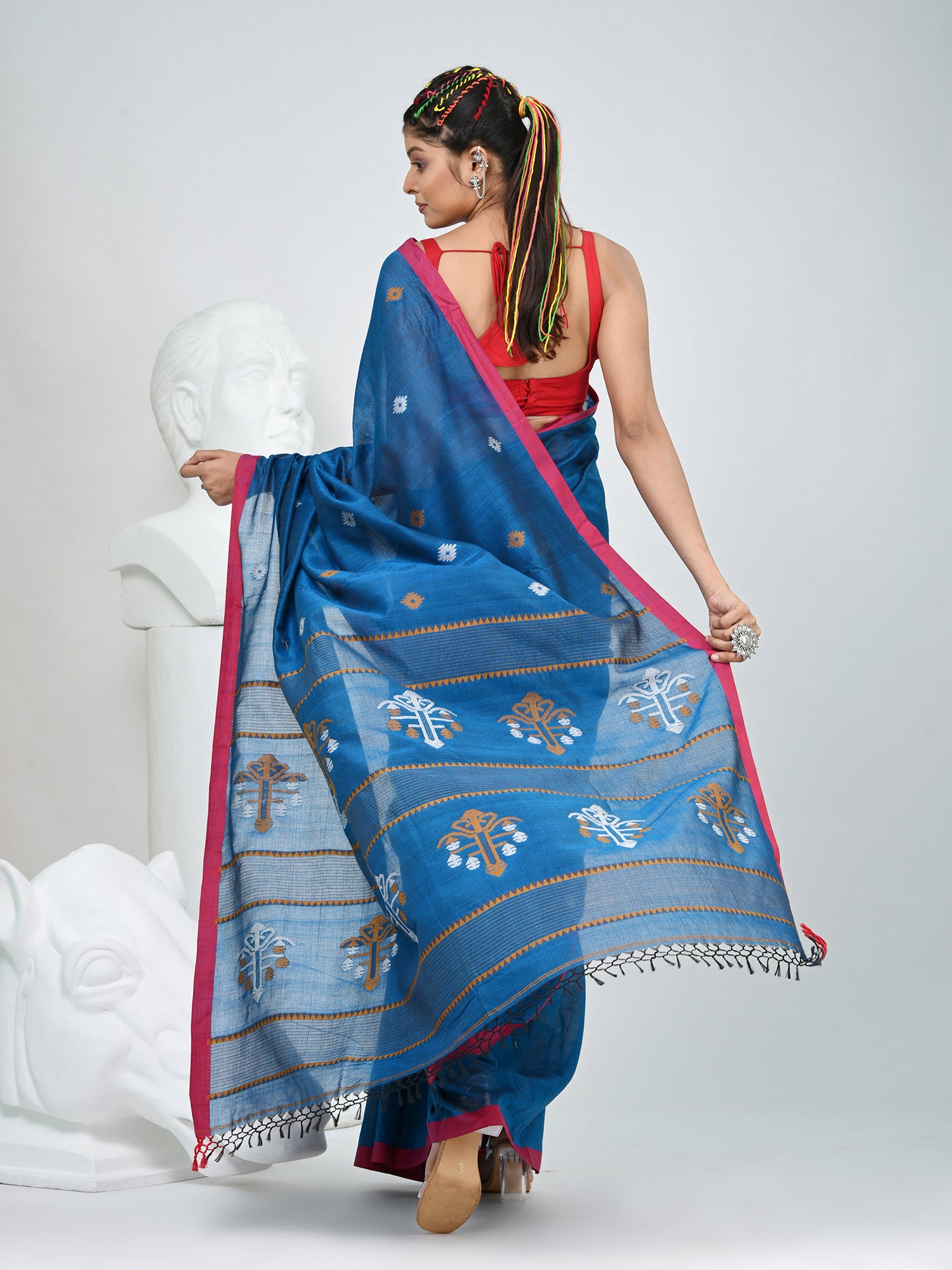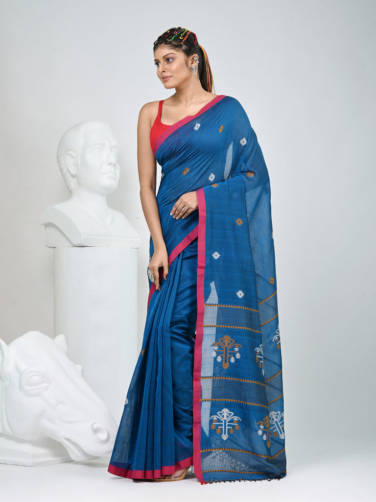 Sapphire Blue Handwoven Cotton Saree with Pink Border And Traditional Motifs