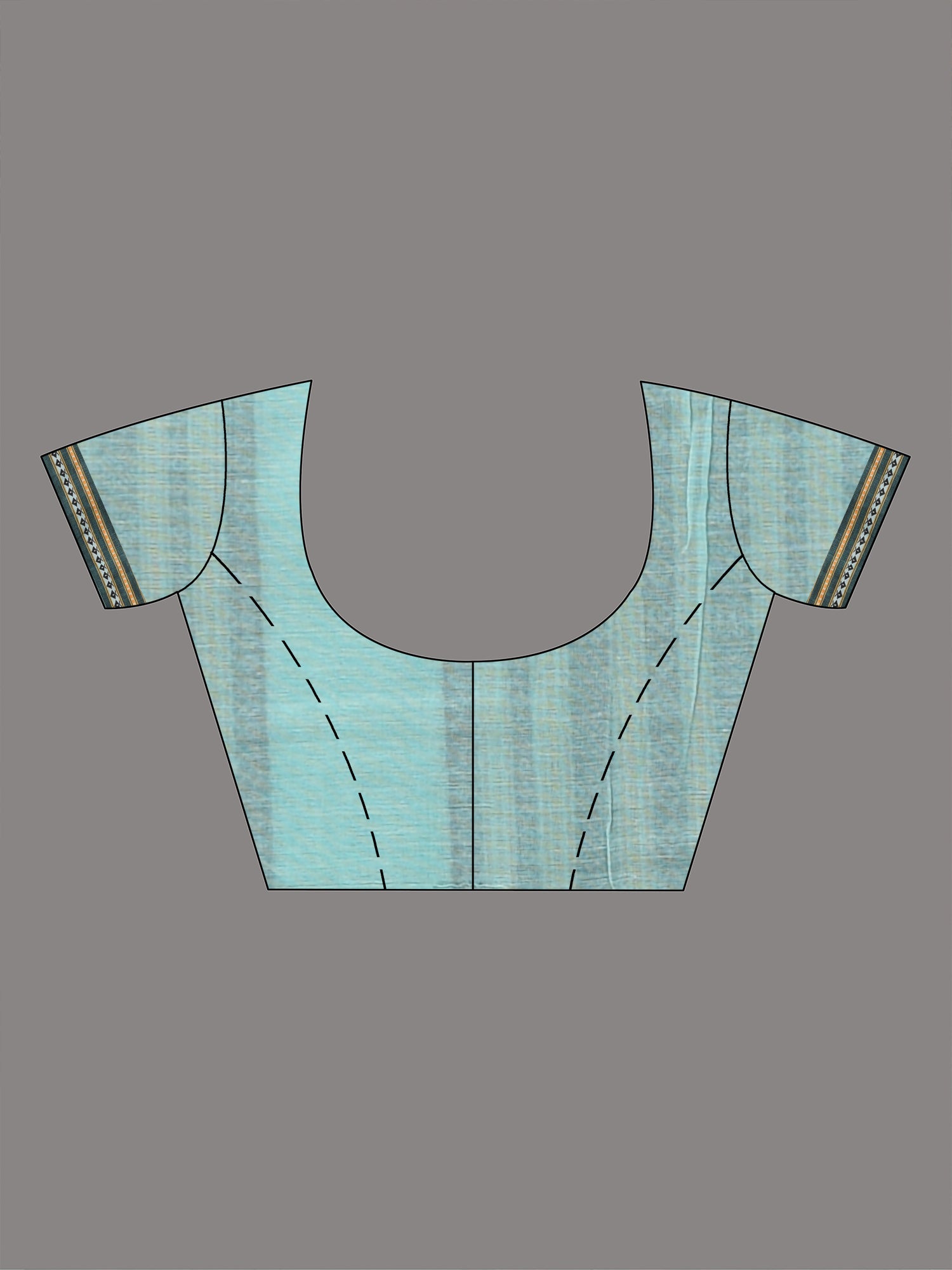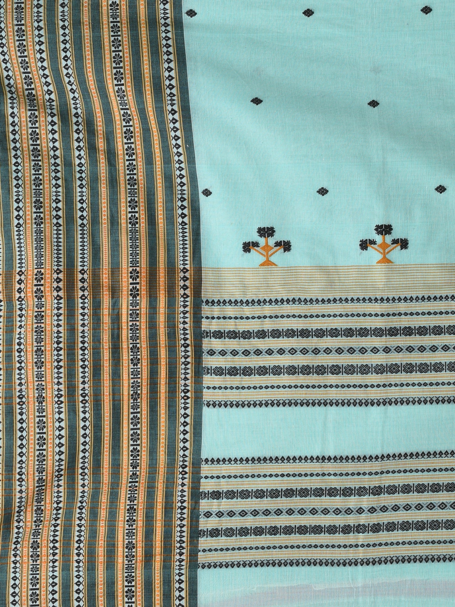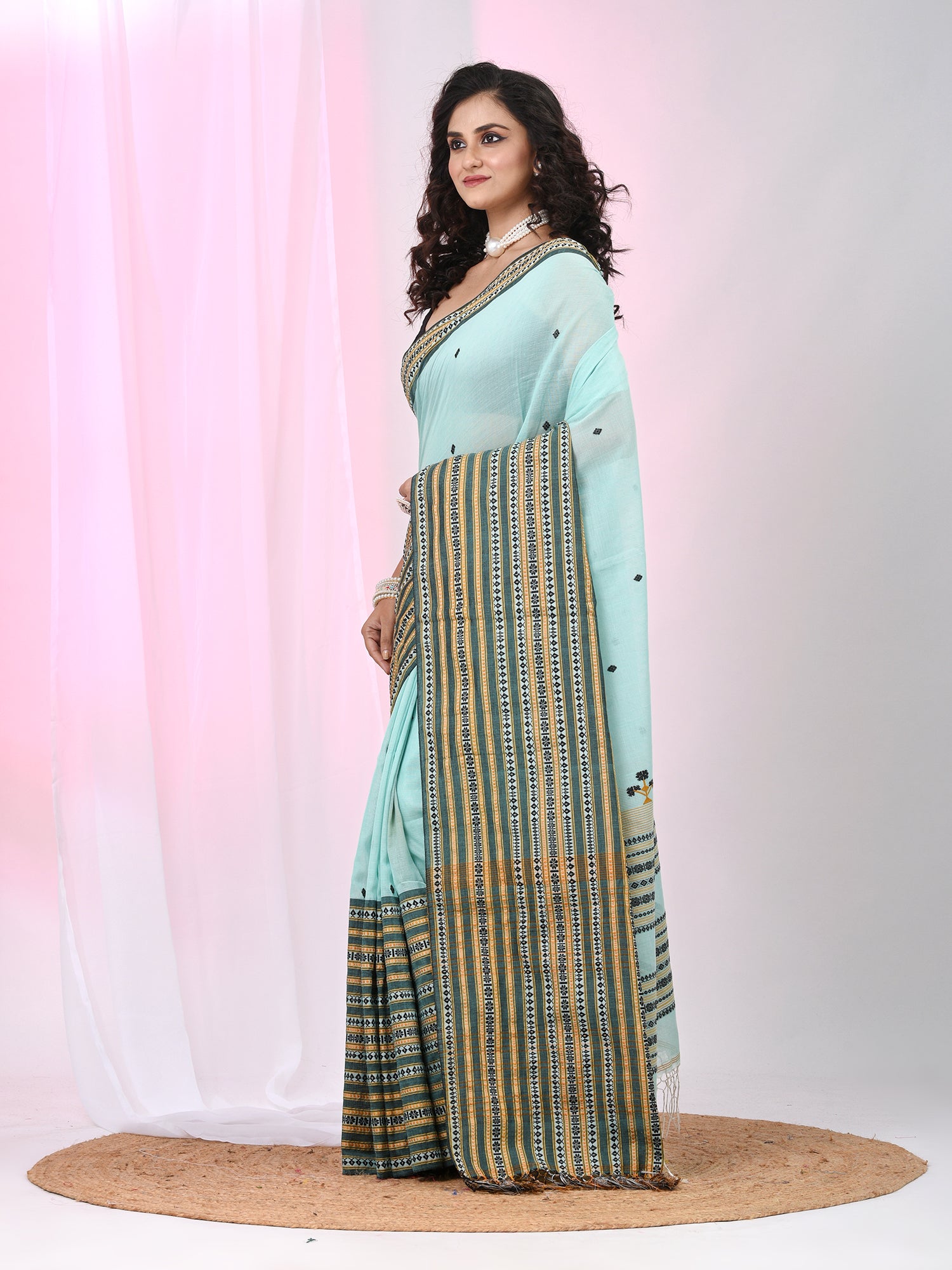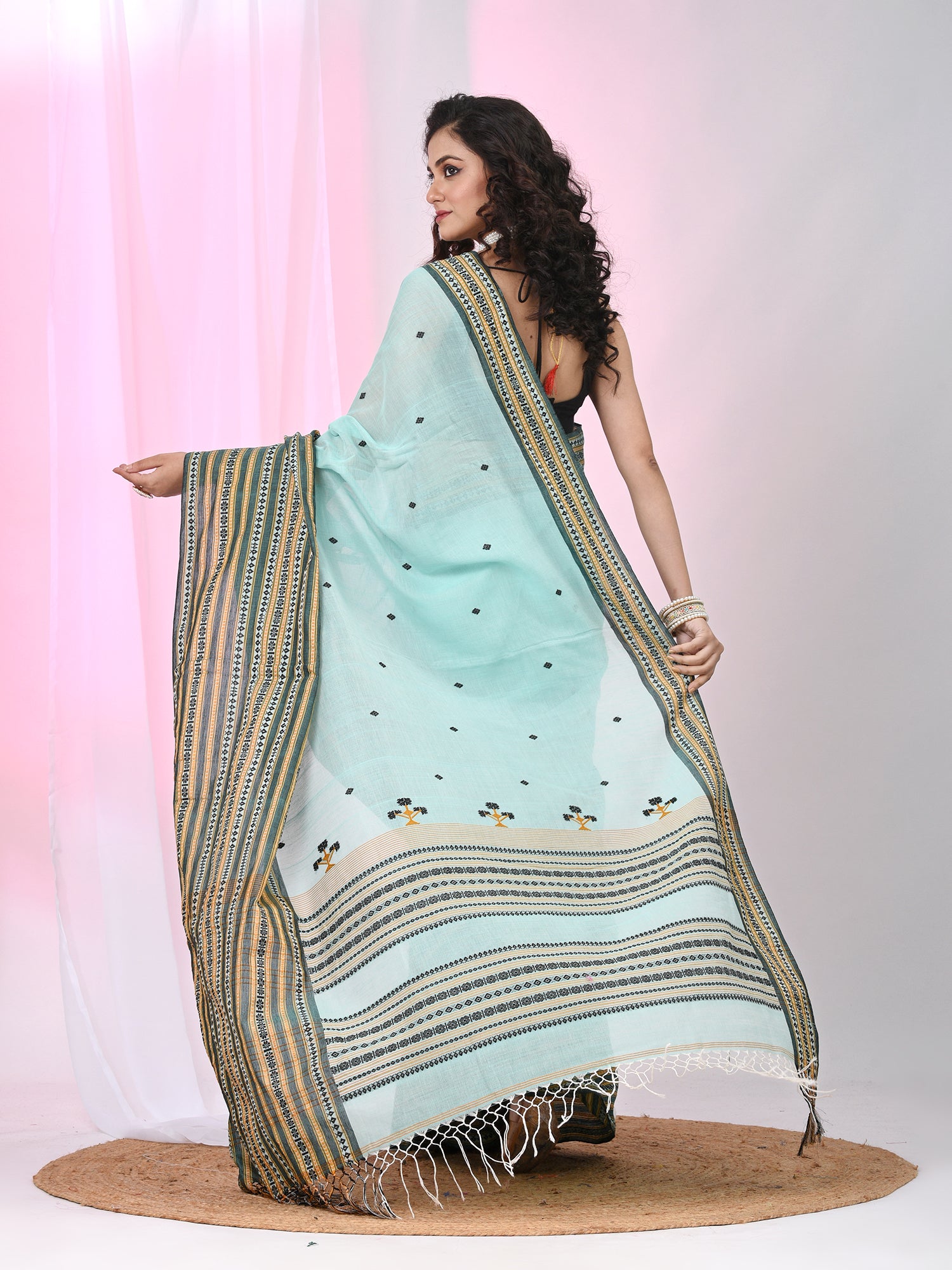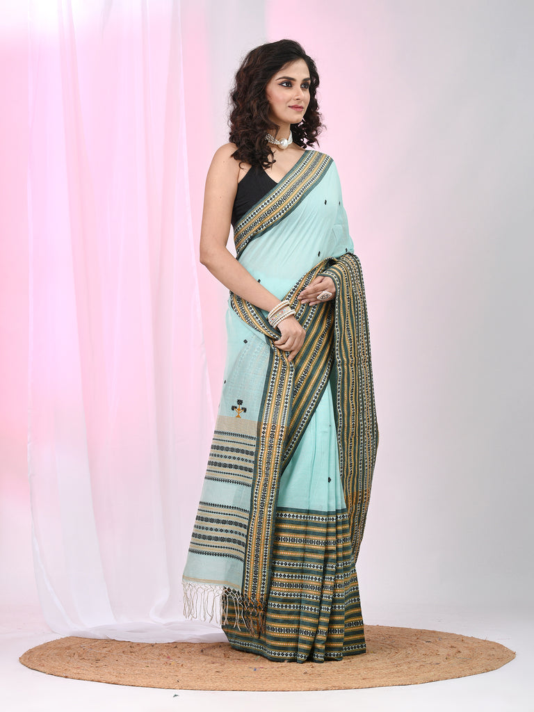 Sea Green Cotton Saree with Intricate Striped Border and Tassels