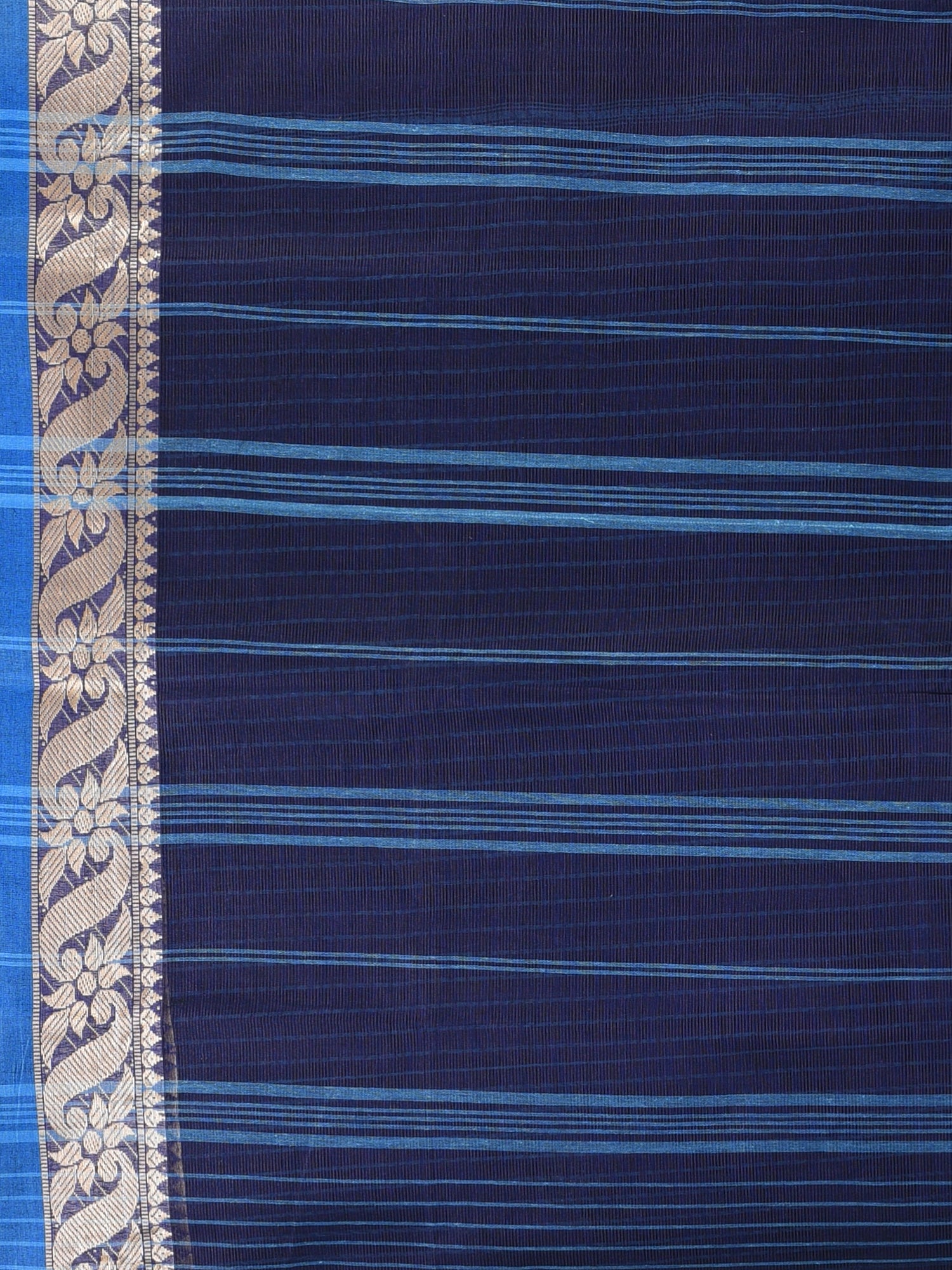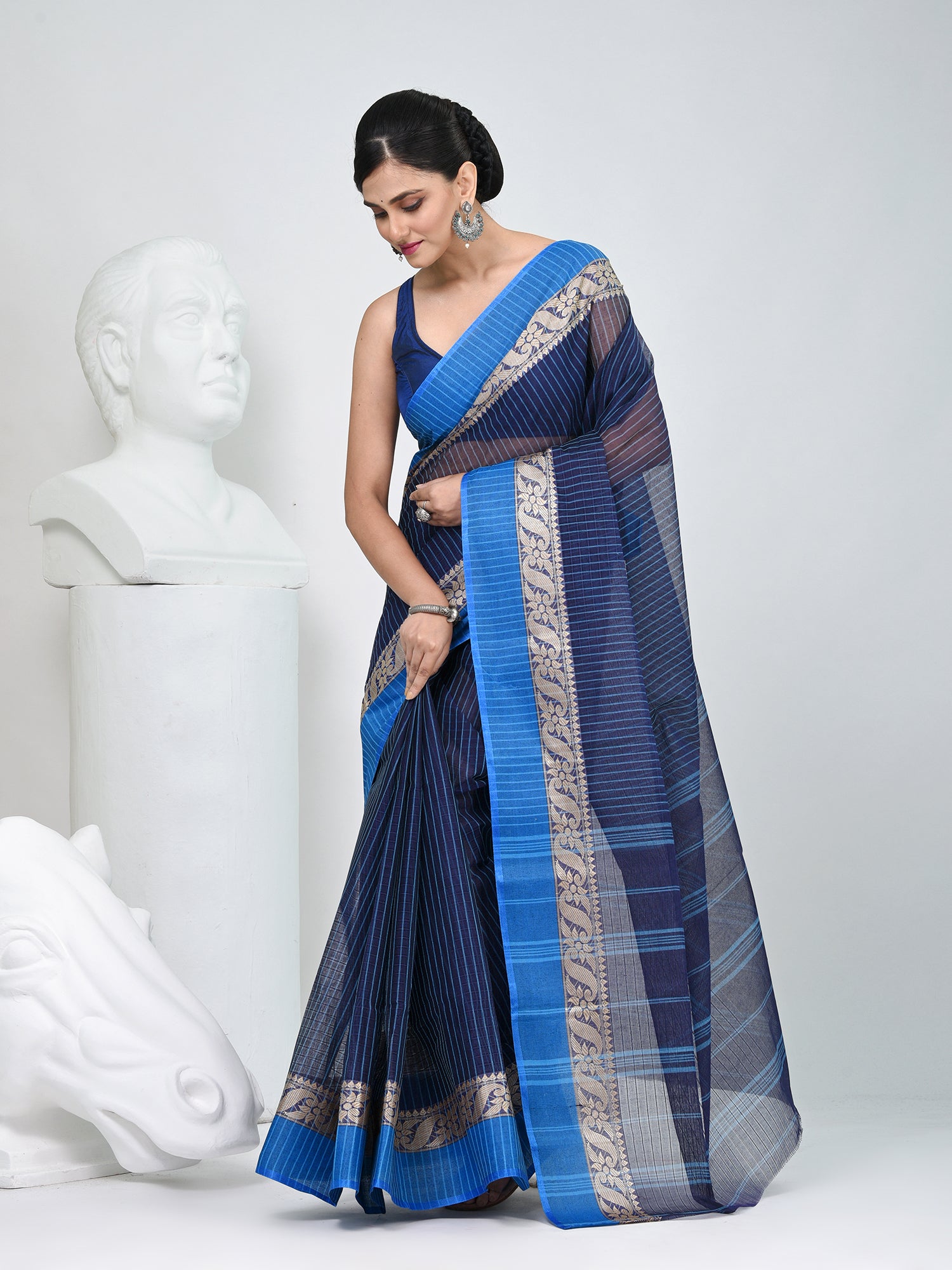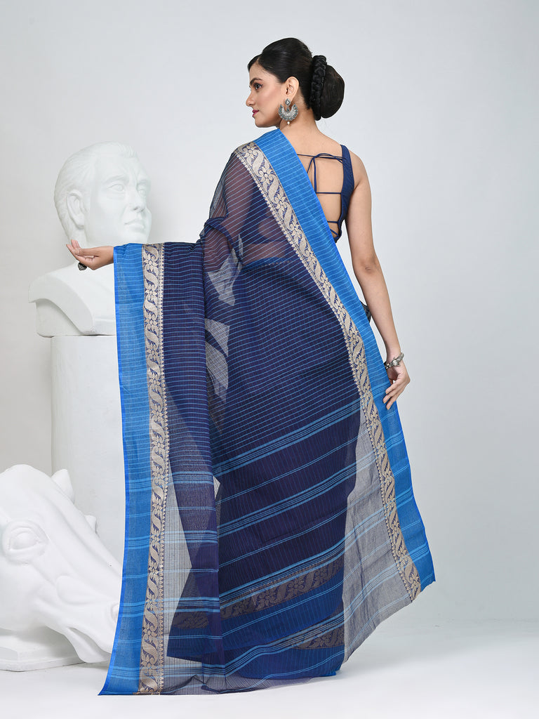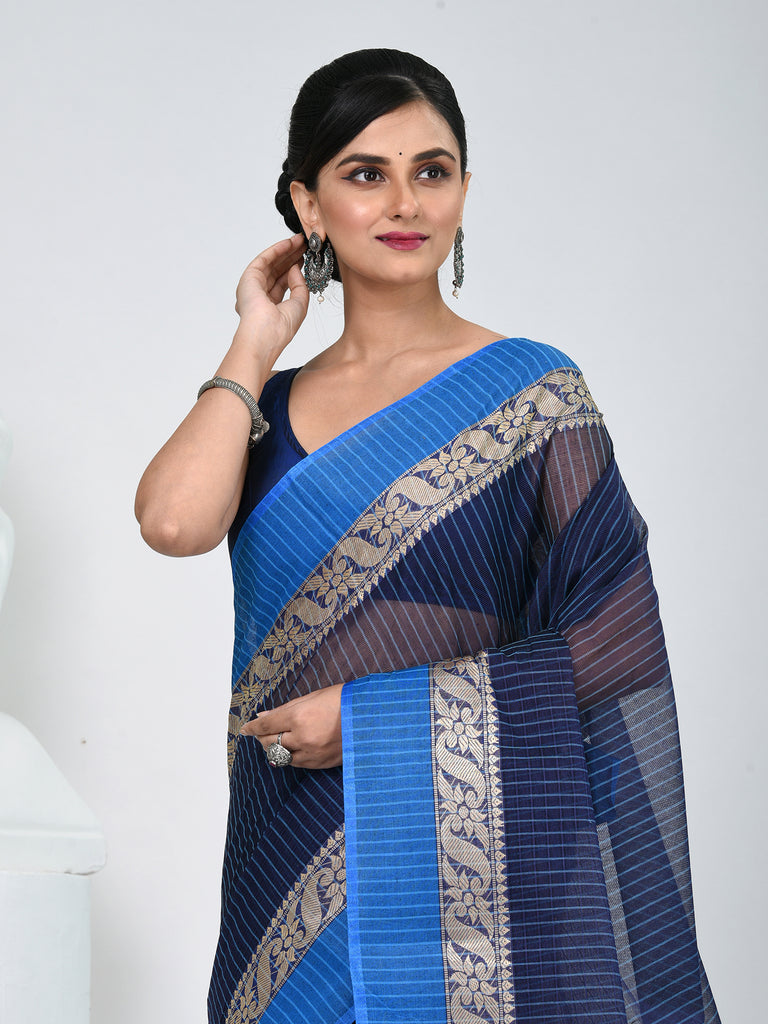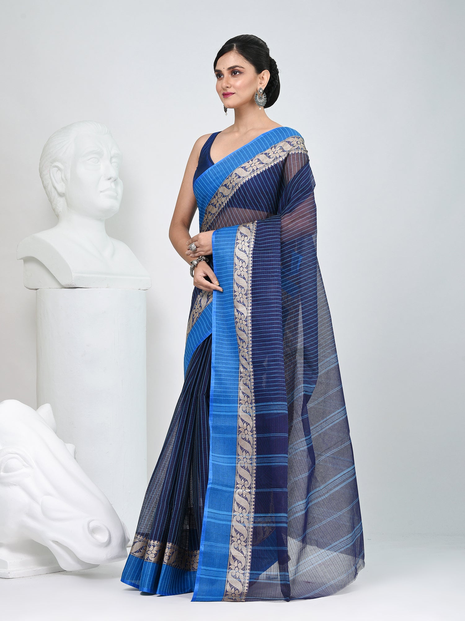 Stunning Navy Blue and Blue Striped Tant Saree with Floral Lace Border